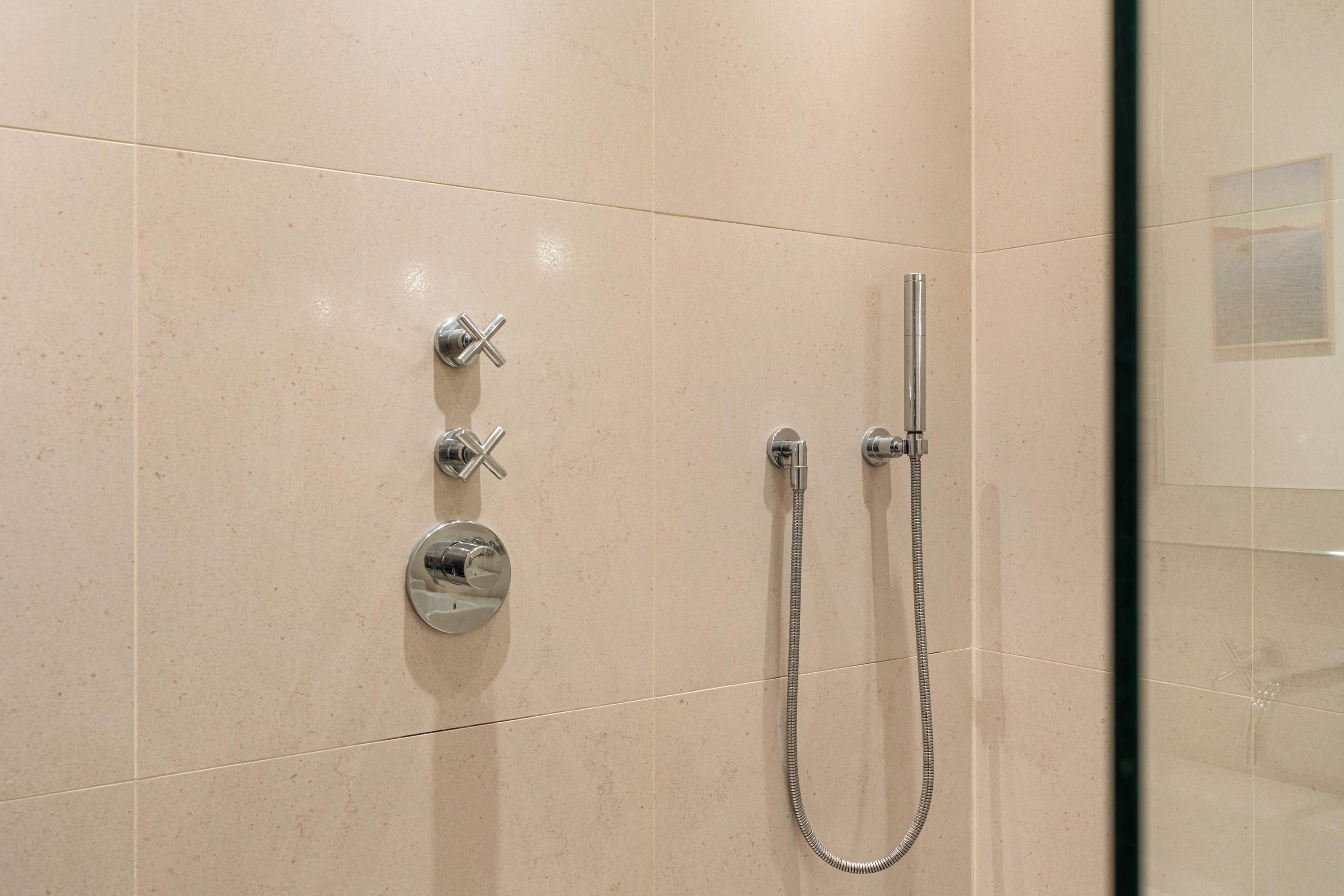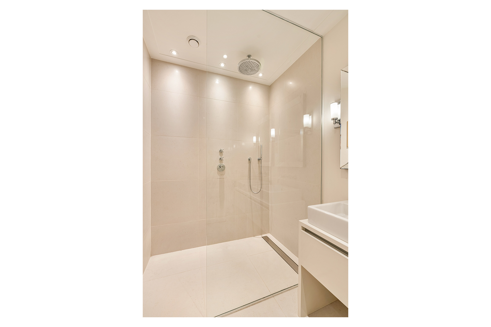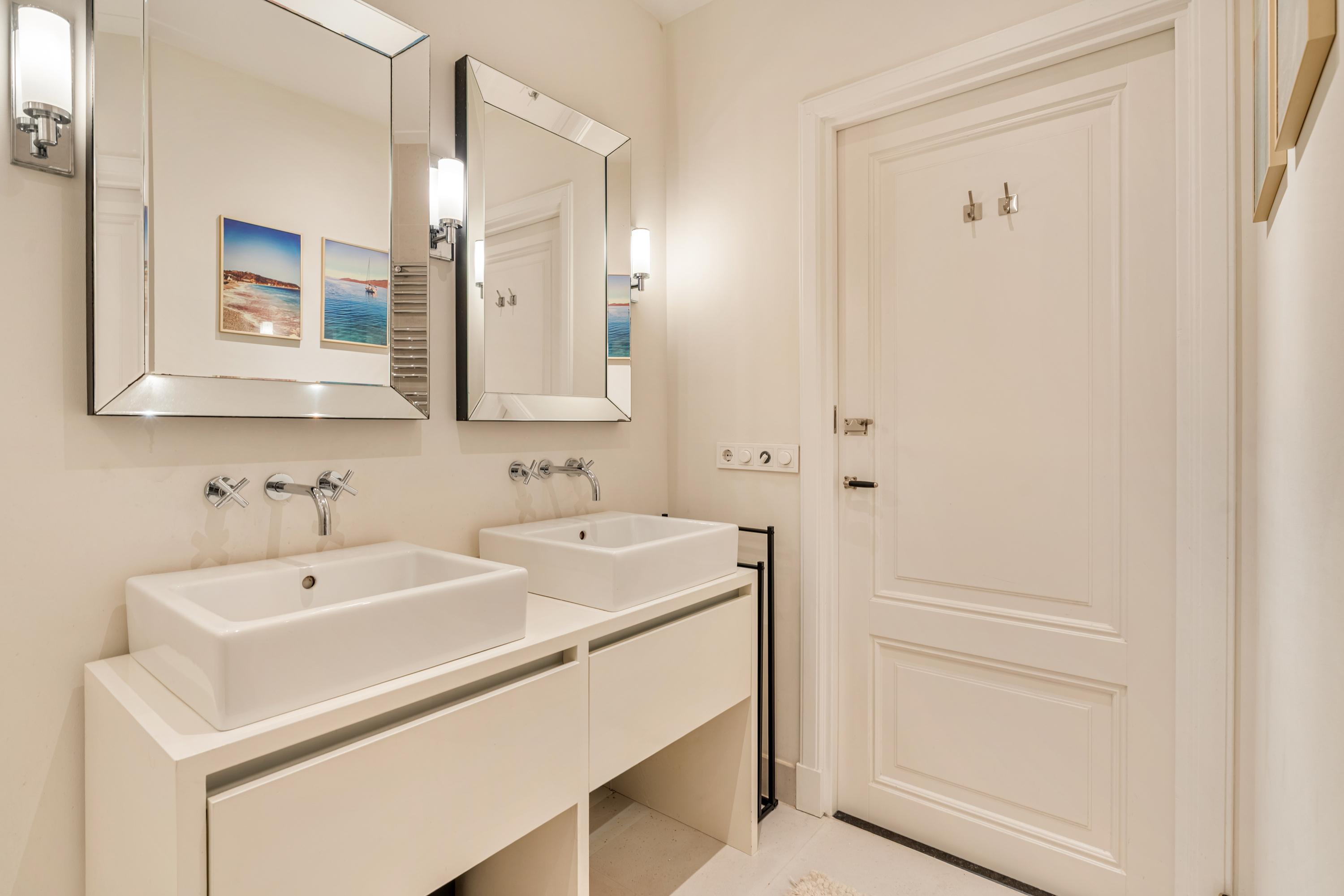 De verzorgde badkamer is voorzien van een inloop regendouche, dubbele wastafel met meubel en vloerverwarming.