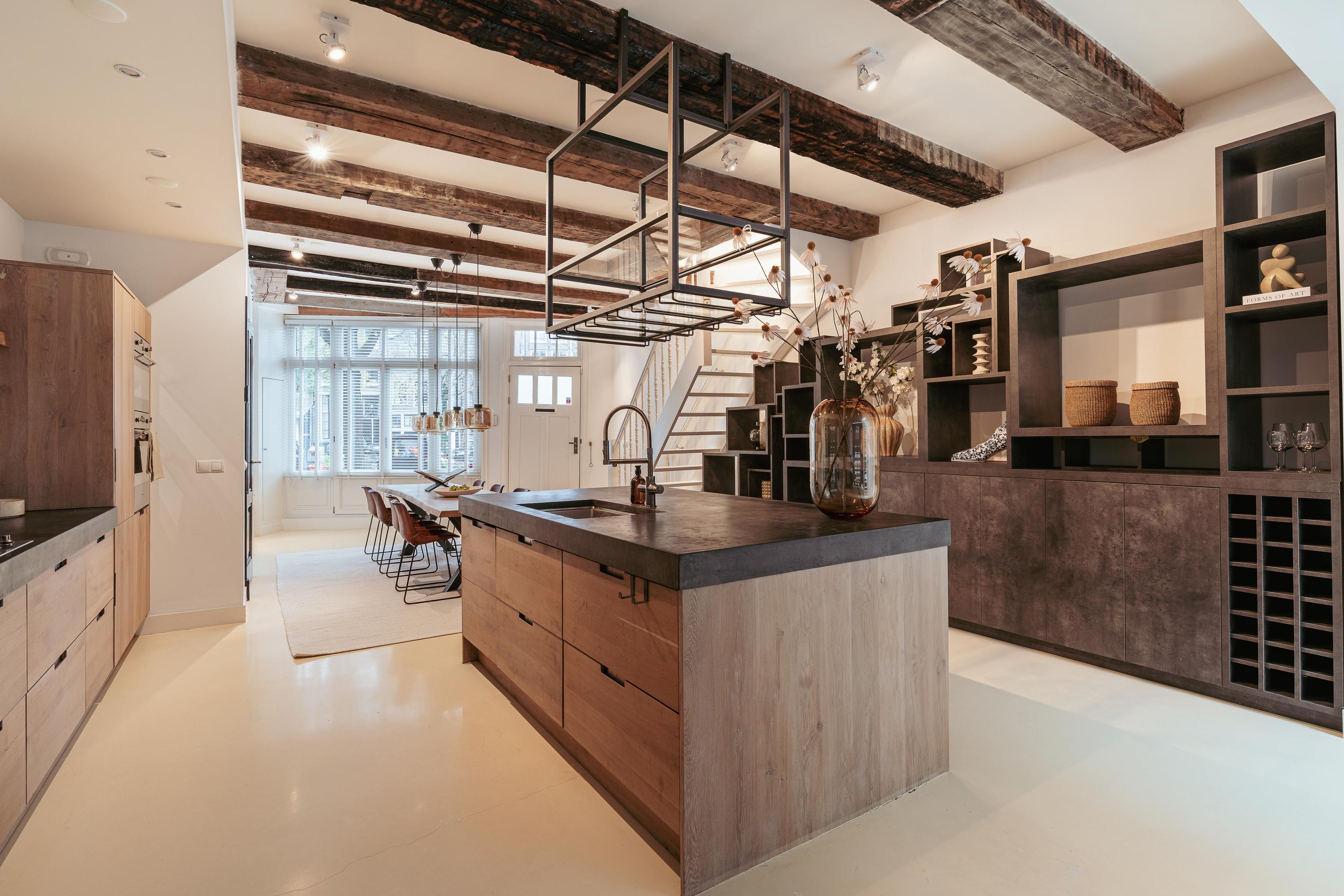 Centraal op deze verdieping ligt de royale woonkeuken van ca. 39 m², uitgevoerd met een groot kookeiland en luxe inbouwapparatuur zoals vaatwasser, 5 pits gasfornuis, koel-vriescombinatie, magnetron en oven. De combinatie van warm hout, een stenen werkblad en een strak design geeft de keuken een hoogwaardige en uitnodigende uitstraling. Het kookeiland biedt volop werkruimte en de op maat gemaakte kastenwand biedt veel bergruimte. Aan de voorzijde is ruim plaats voor een grote eettafel: ideaal voor gezellige diners, borrels en lange avonden aan tafel.