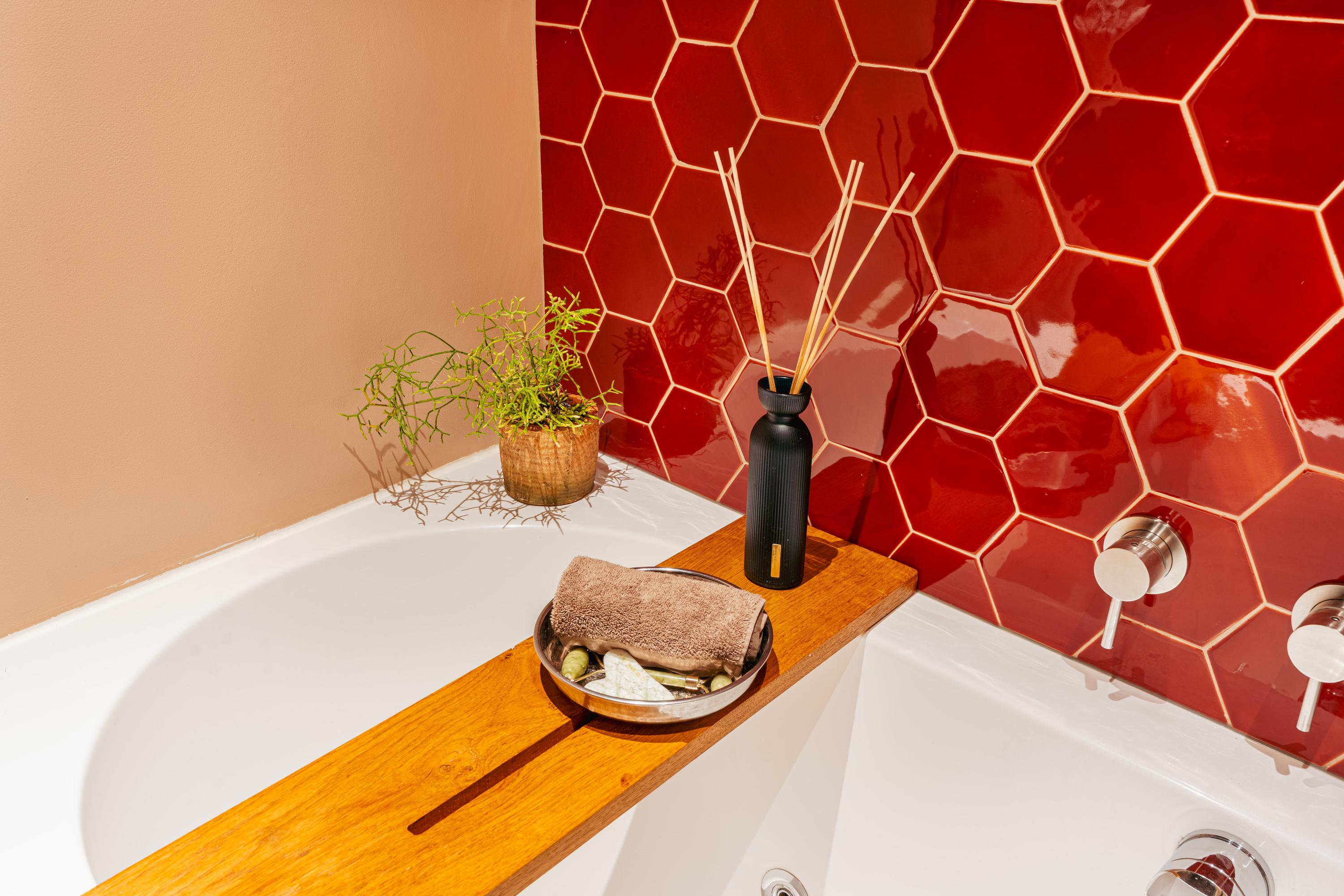 De badkamer is stijlvol vormgegeven in warme bruintinten en voorzien van een opvallend accent van rode hexagontegels. Hier beschikt u over een ligbad met whirlpoolfunctie, een aparte inloopdouche met regendouche, een wastafelmeubel met ruime opbergladen, een praktische wandkast, een designradiator én comfortabele vloerverwarming. Een heerlijke plek om te ontspannen.