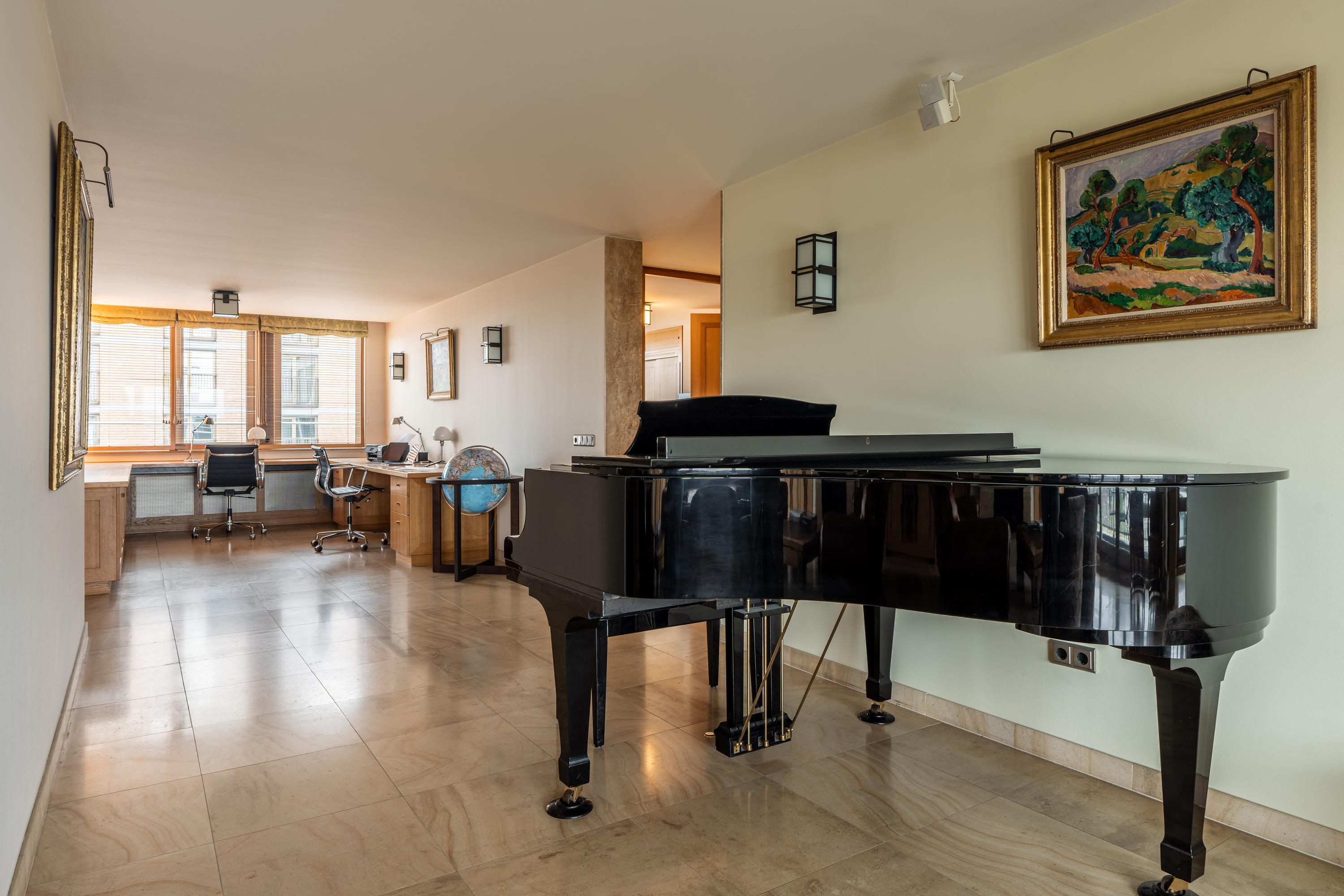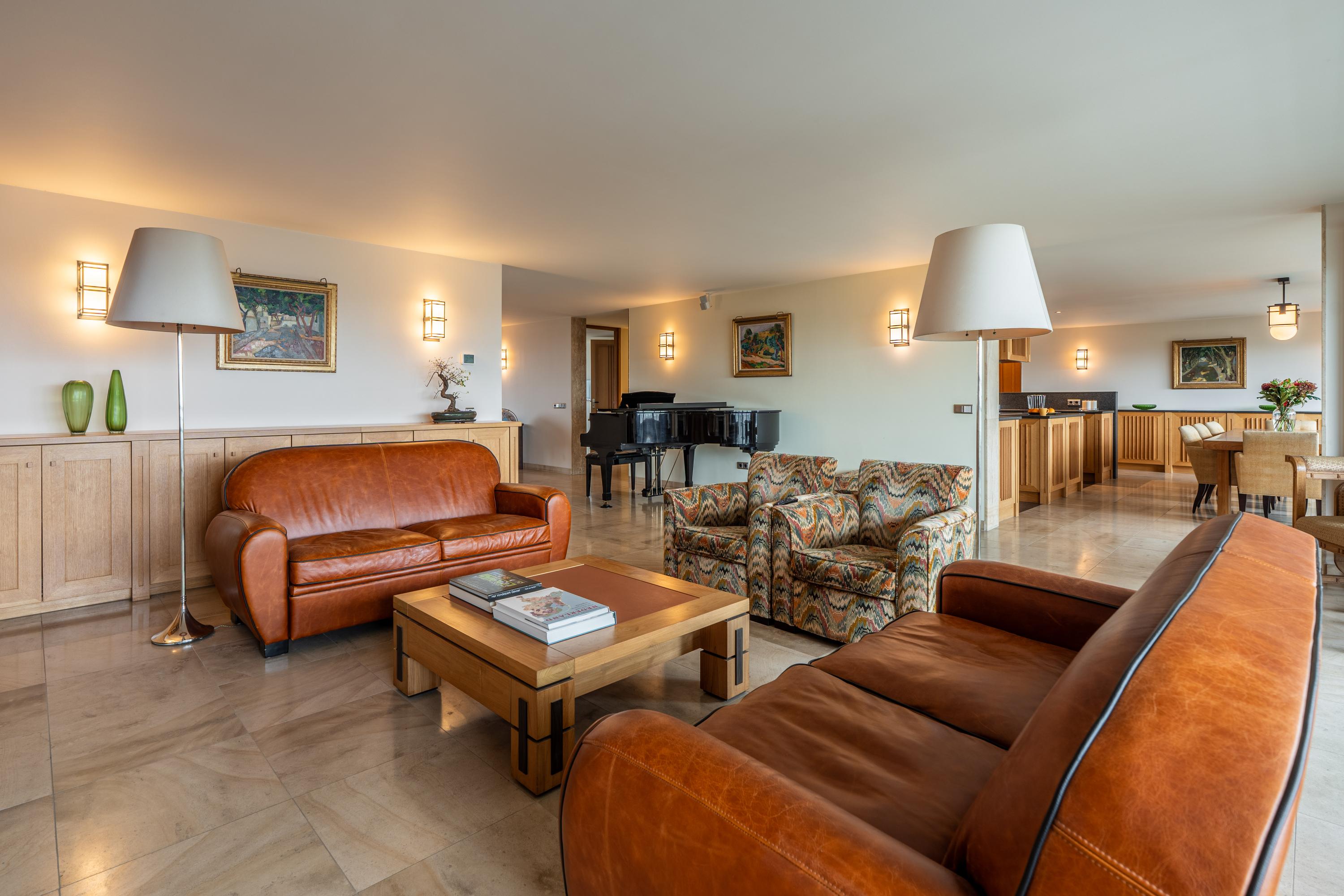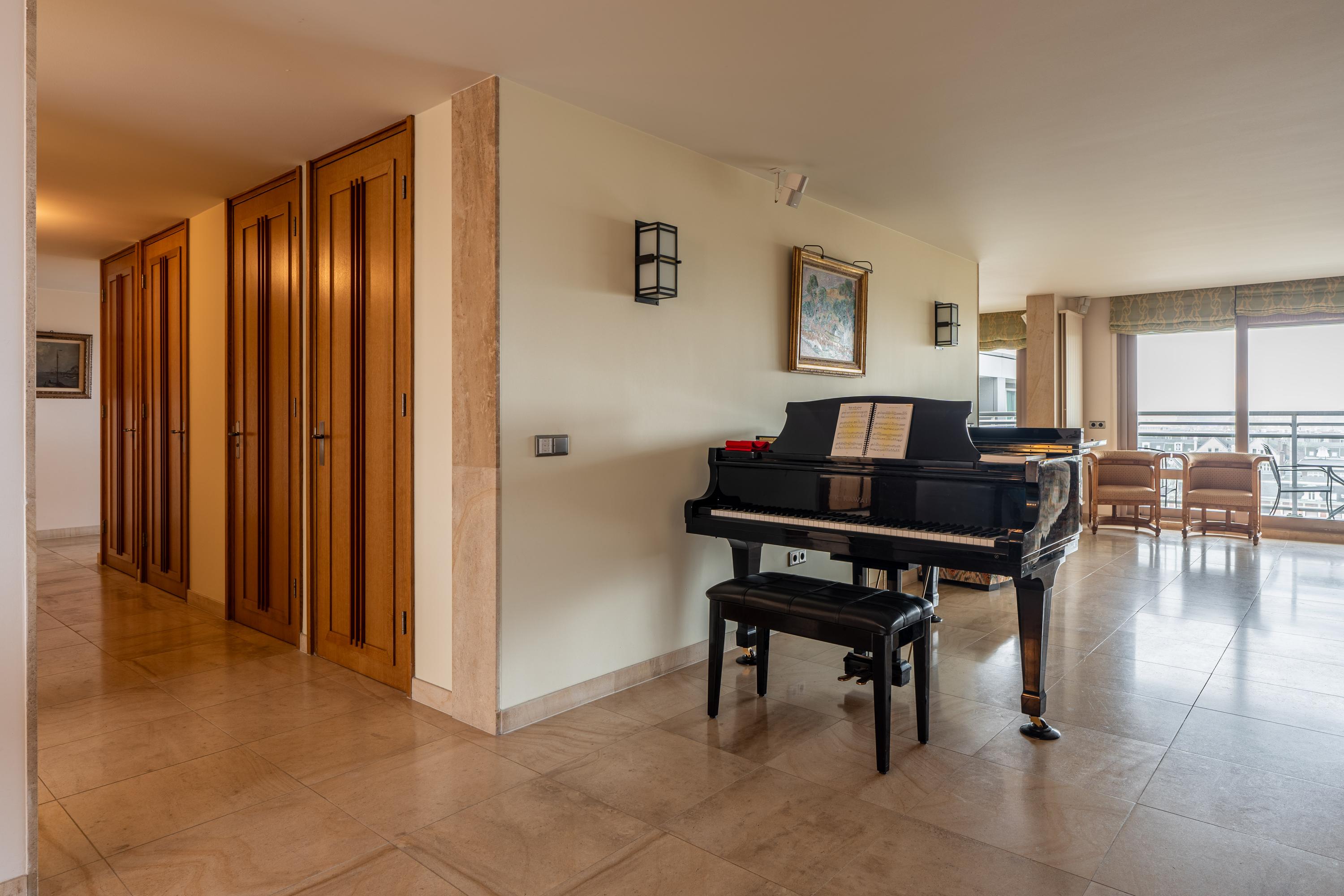 Bij binnenkomst wordt u verwelkomd door een royale entree, aan uw linkerzijde vindt u ruime garderobekasten. Vanuit de entree loopt u naar de open keuken met eetruimte. De keuken bestaat uit een kookeiland met 6-pits inductieplaat met afzuiger en oven, drie koelkasten, een magnetron, vaatwasser, Quooker en de nodige opbergruimte. Middels plafond hoge glazen schuifdeuren heeft u toegang tot het brede balkon van ca. 25 m². Het balkon is zo een twee meter diep en is voorzien van elektrische zonwering en biedt een schitterend uitzicht. Naast de eetruimte bevindt zich de riante living met gashaard en kastenwanden, de tv is middels een houten schuifpaneel af te schermen. Ideaal voor een gezellige avond bij de haard! Vanuit de woonkamer loopt u langs een comfortabele werkruimte waar u de nodige kastruimte tot uw beschikking heeft. De hoofdslaapkamer bevindt zich in de noordwesthoek van het appartement en is voorzien van ruime inbouwkasten, airconditioning, ingebouwde muziek speakers en een badkamer en-suite. De badkamer is bekleed met prachtig groen marmer en bestaat uit een dubbele wastafel met meubelstuk, een ligbad met douchekop, een toilet en een inloopdouche. De andere twee slaapkamers met gedeelde badkamer bevinden zich in de noordoosthoek van het appartement. Beiden zijn voorzien van inbouwkasten, airconditioning en ingebouwd bureau. De badkamer en-suite beschikt over een inloopdouche en wastafel met meubel. Vanuit de uitgestrekte hal tegenover deze twee slaapkamers vindt u nog een berging met vrieskast, een separaat toilet met fontein en een praktische wasruimte.