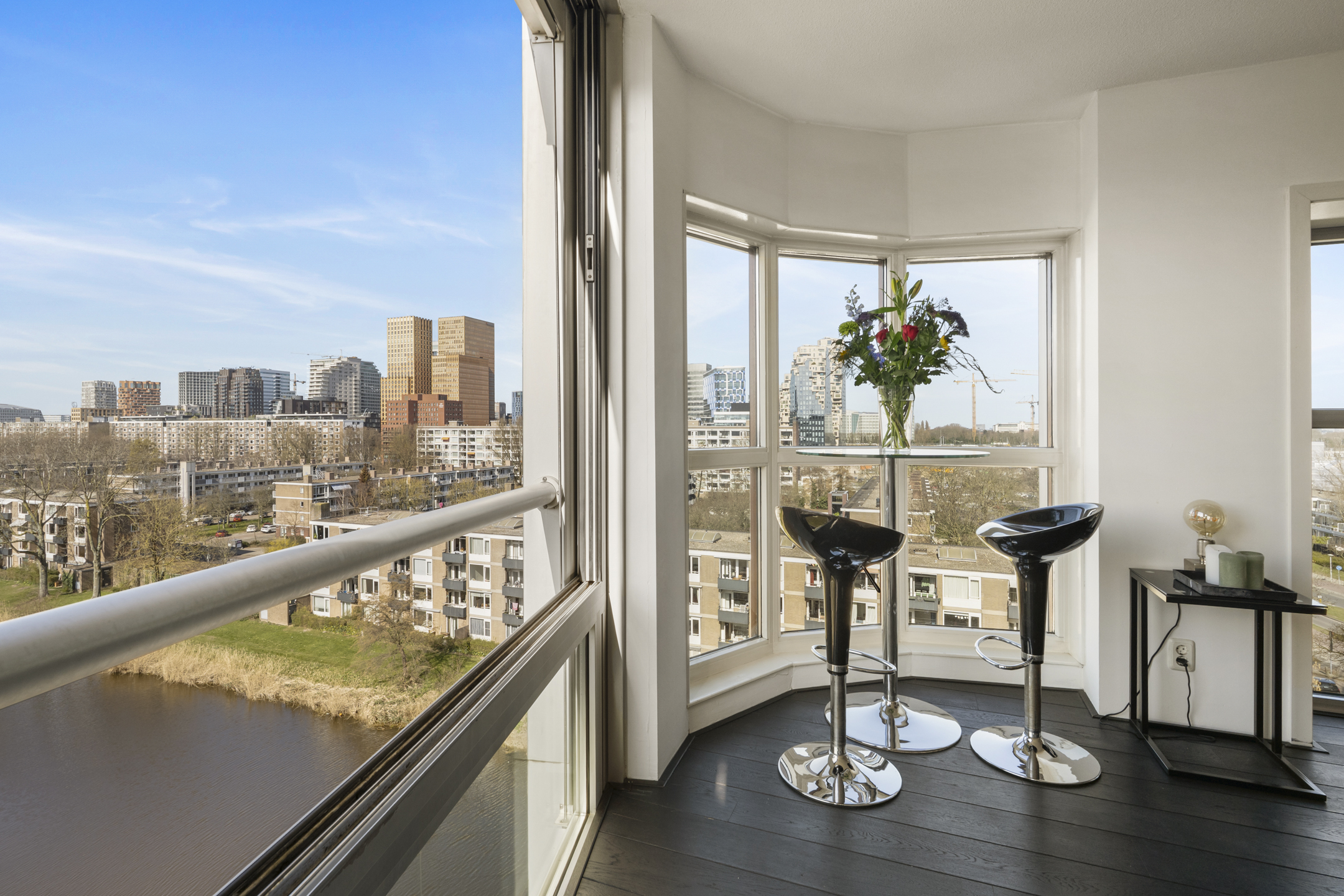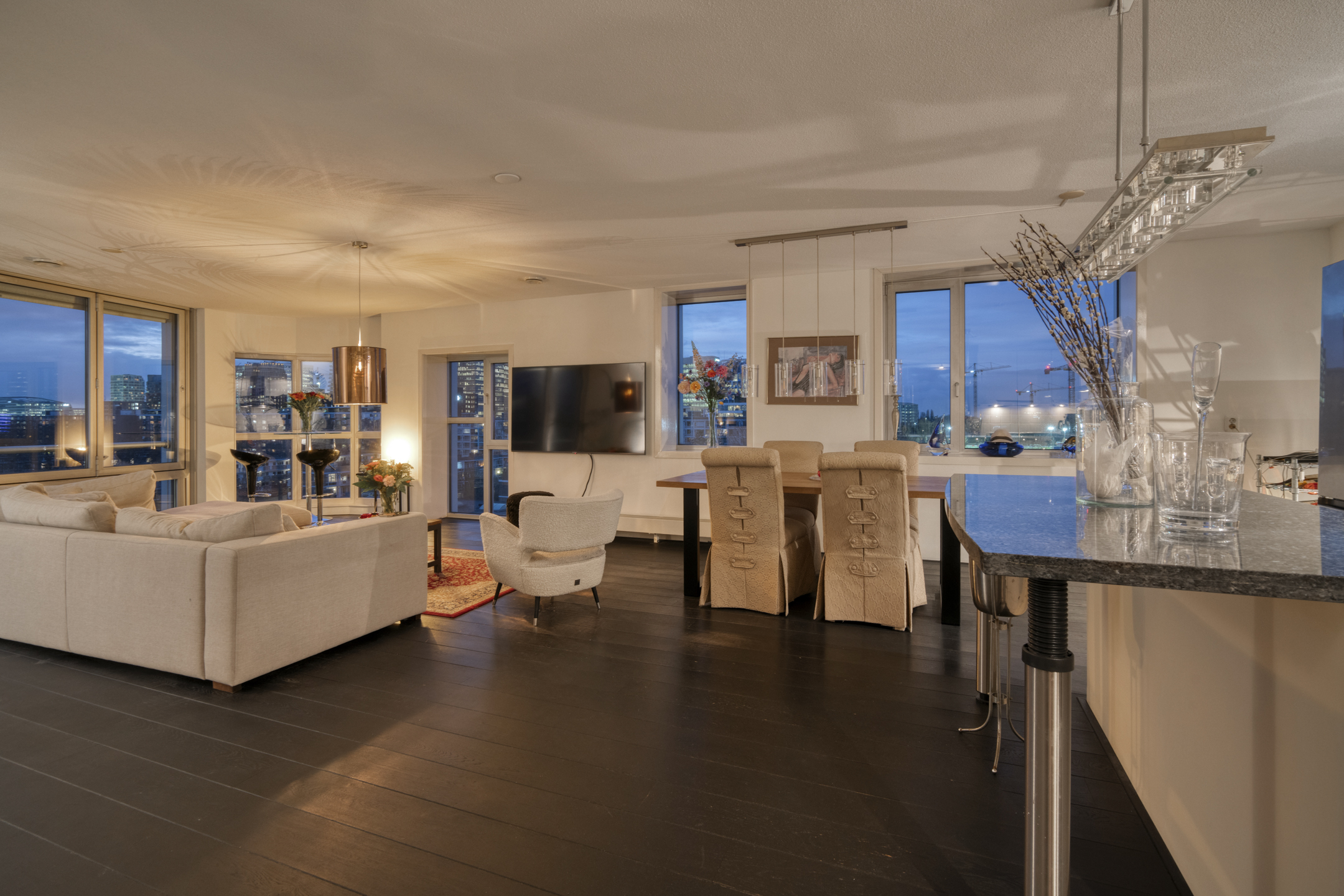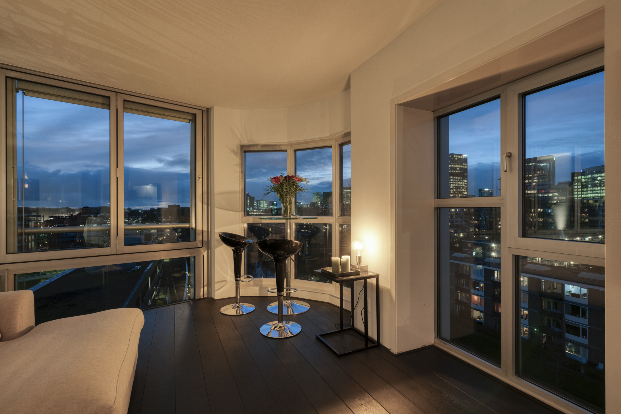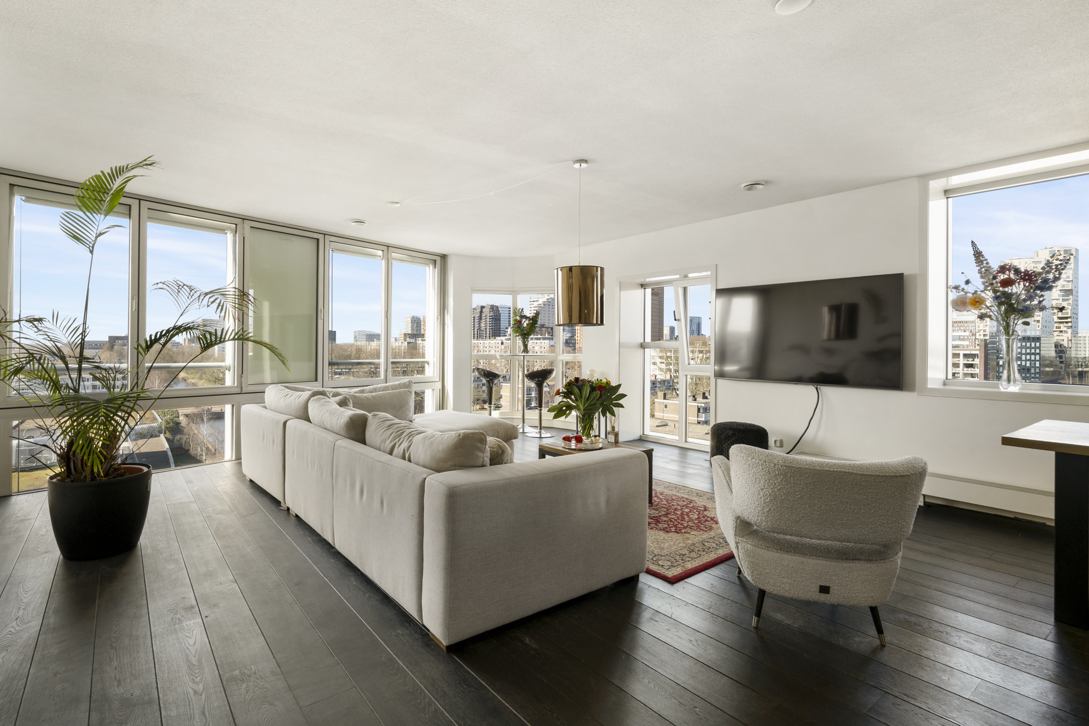 Ruime living, door de hoekligging en de gebogen hoekramen trekt het stadse en waterrijke vergezicht direct de aandacht mede omdat ook hier de gevel vrijwel geheel uit glas bestaat.