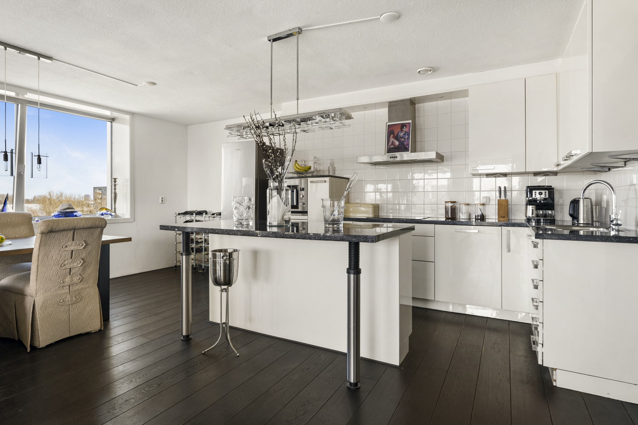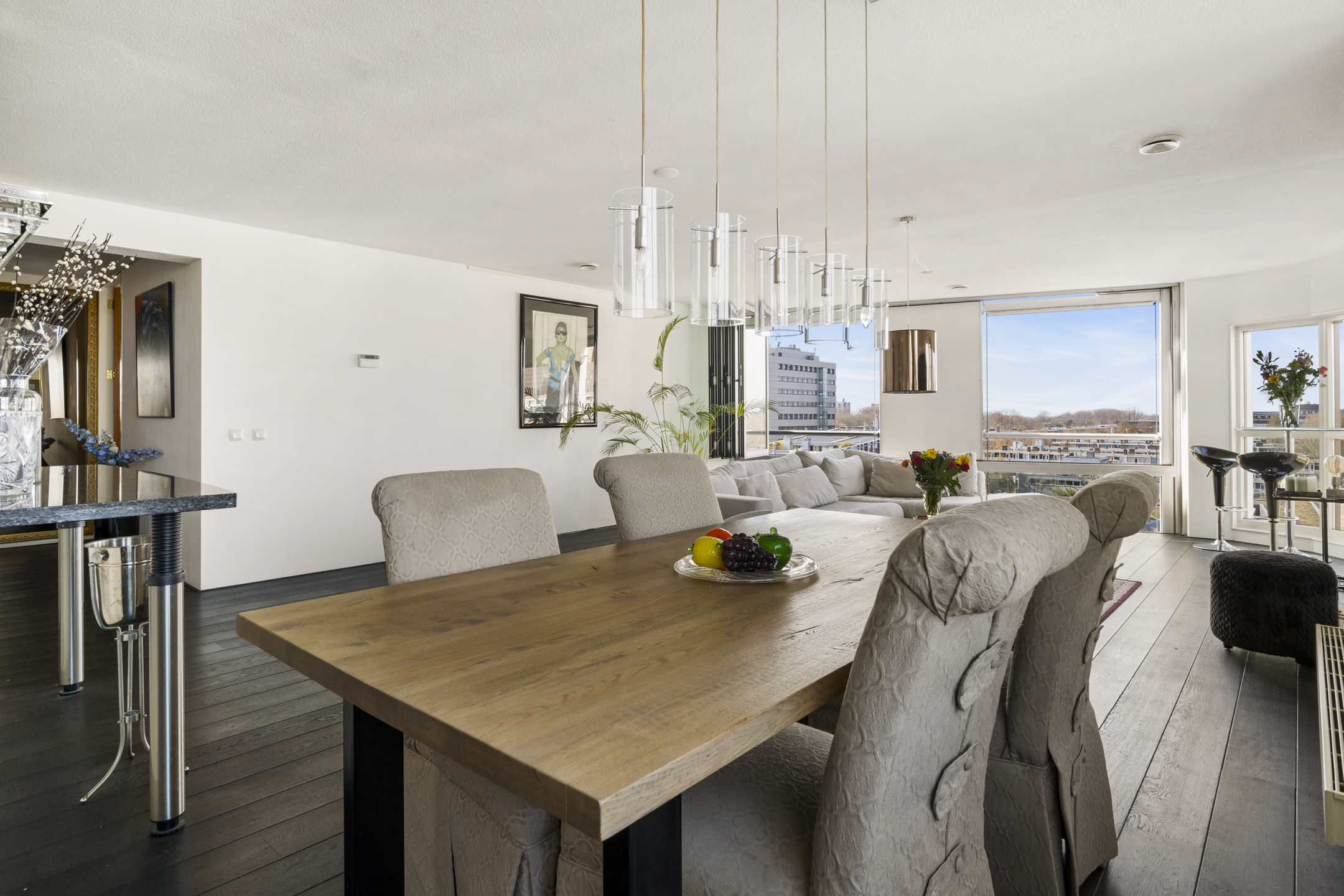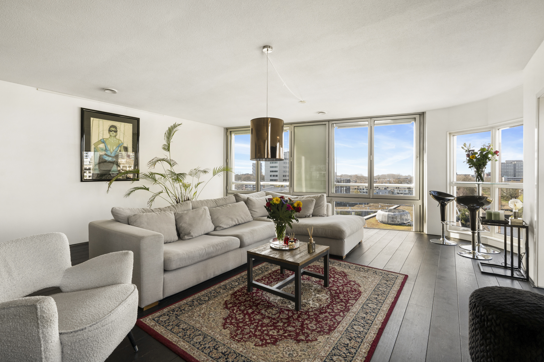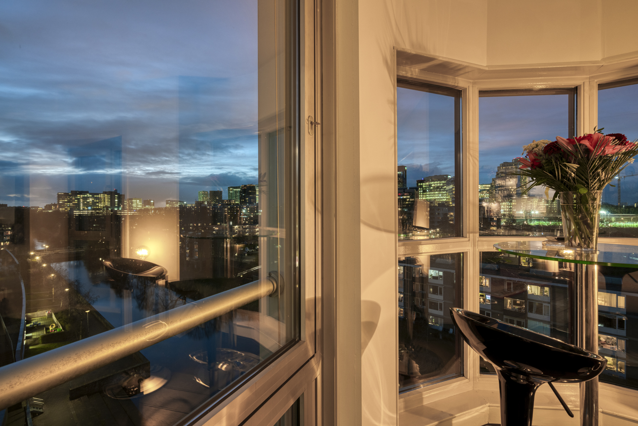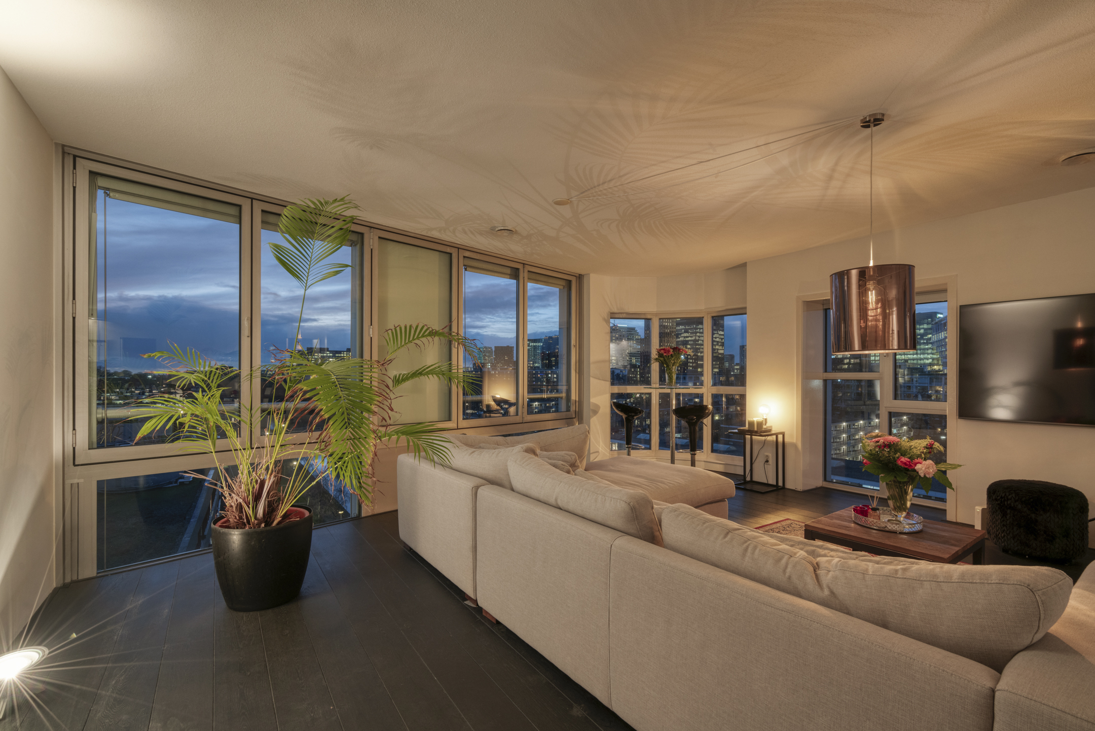 Ruime living, door de hoekligging en de gebogen hoekramen trekt het stadse en waterrijke vergezicht direct de aandacht mede omdat ook hier de gevel vrijwel geheel uit glas bestaat.