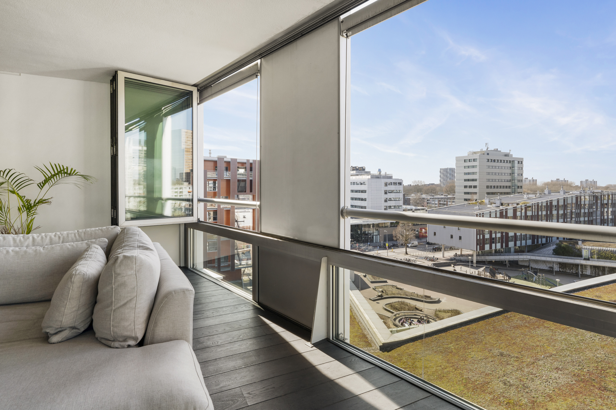 Aan de living grenst normaal een loggia met een brede harmonica pui maar deze is bij de living gevoegd. Wanneer de weersomstandigheden het toelaten kunt u de gevel over de gehele breedte openen zodat u heerlijk van de zon kunt genieten. De ramen van de slaapkamers en van de loggia hebben elektrisch bedienbare sunscreens (zuidwestzijde).