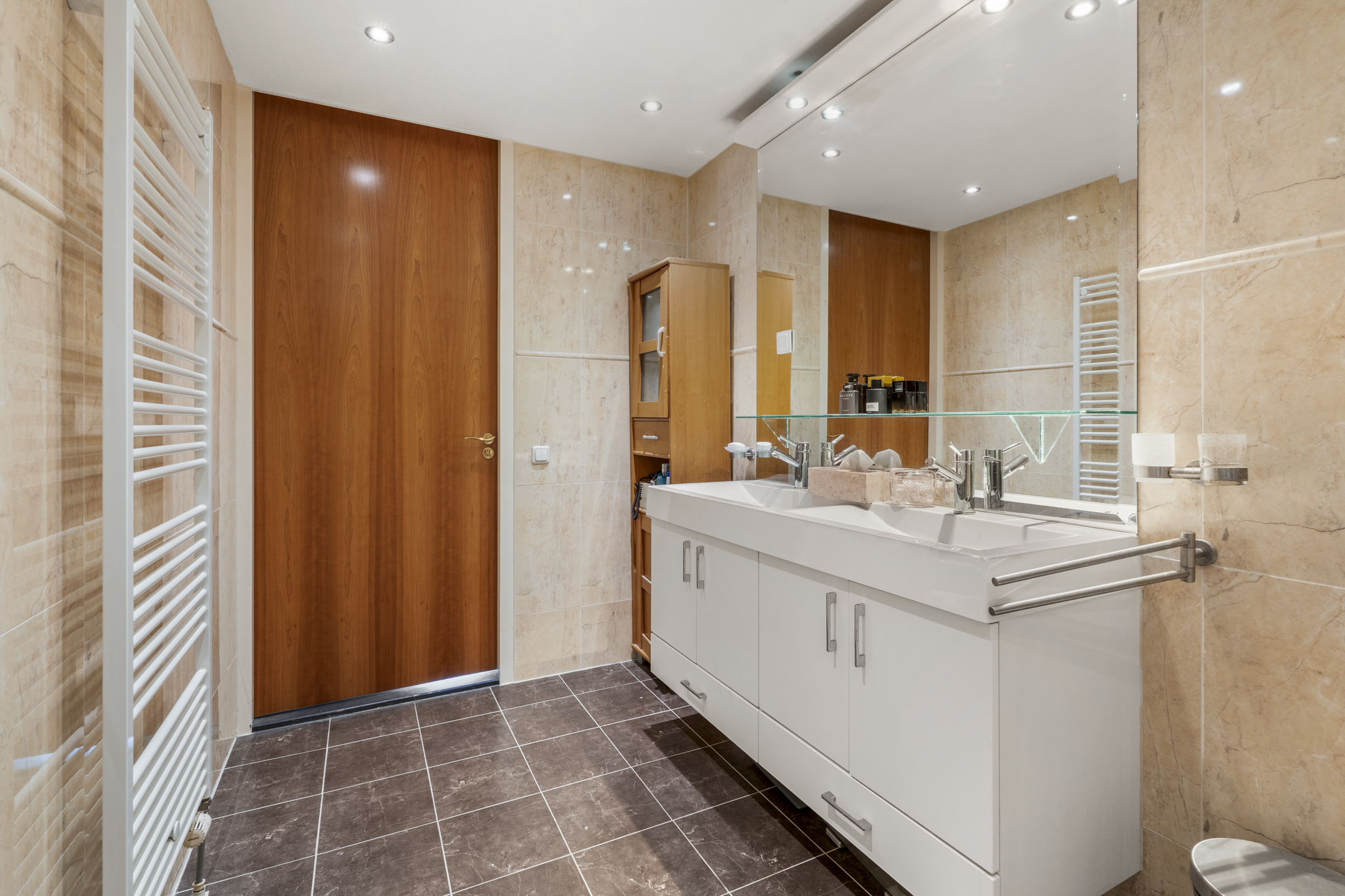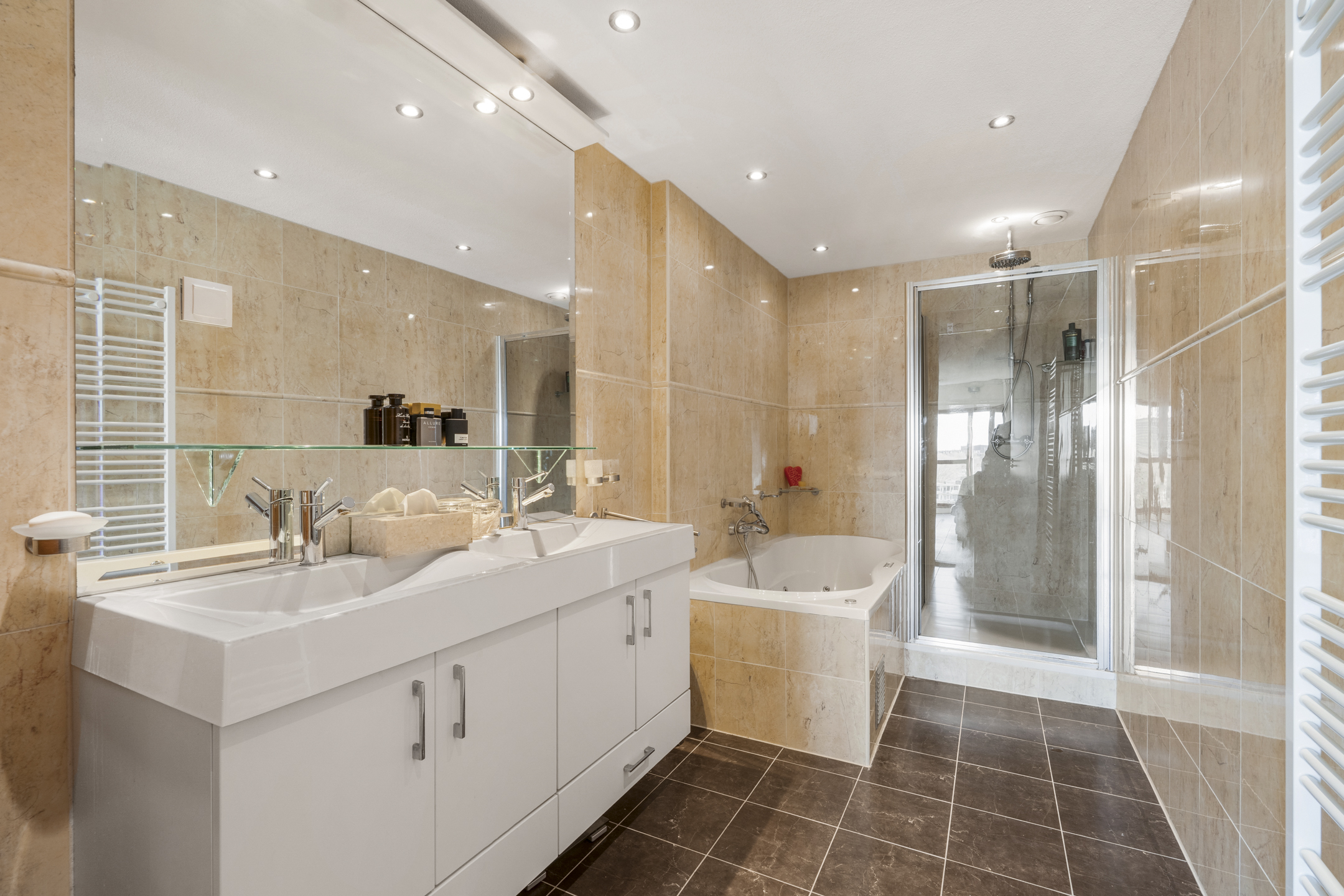 Aansluitend de ruime, luxe badkamer met fraai tegelwerk, in lichte kleurstelling met een dubbele wastafel in een meubel, een douche met regendouche en een ligbad met whirlpool.