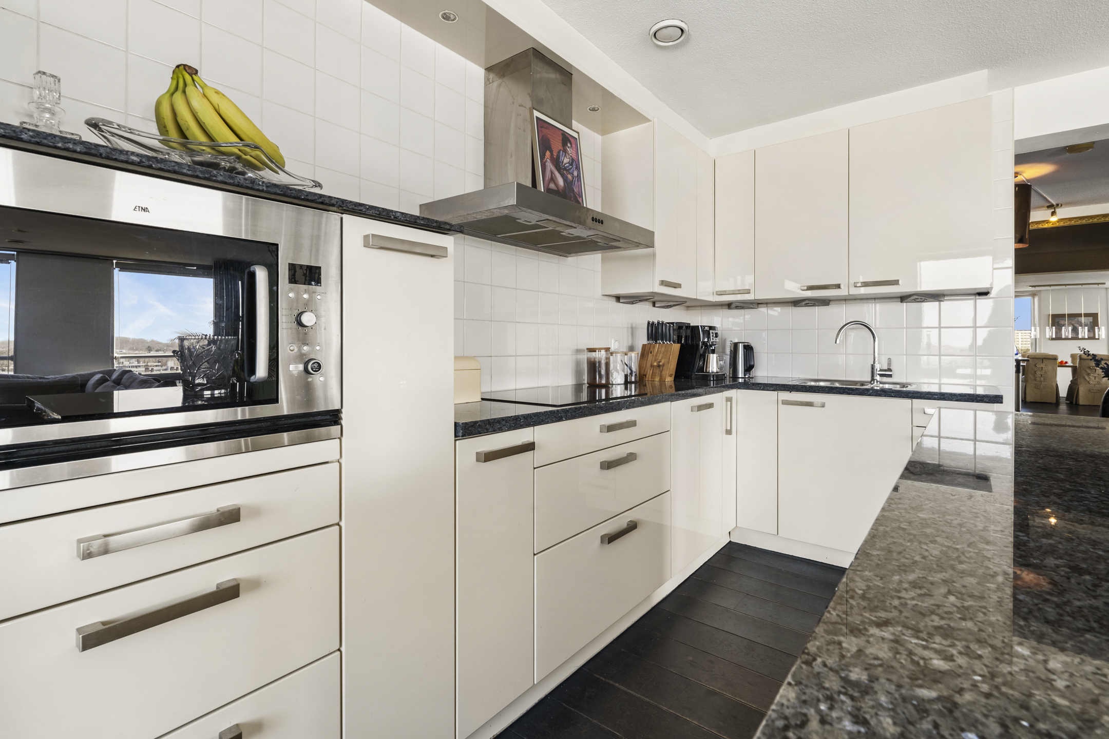 De woning heeft een luxe woonkeuken met kookeiland in lichte kleuren met een antracieten hardstenen blad. De keuken heeft diverse inbouwapparatuur waaronder een gaskookplaat met afzuigkap, een koelkast, vaatwasser, een diepvries, een oven en een magnetron. De hele woning heeft een stoere eiken parketvloer.