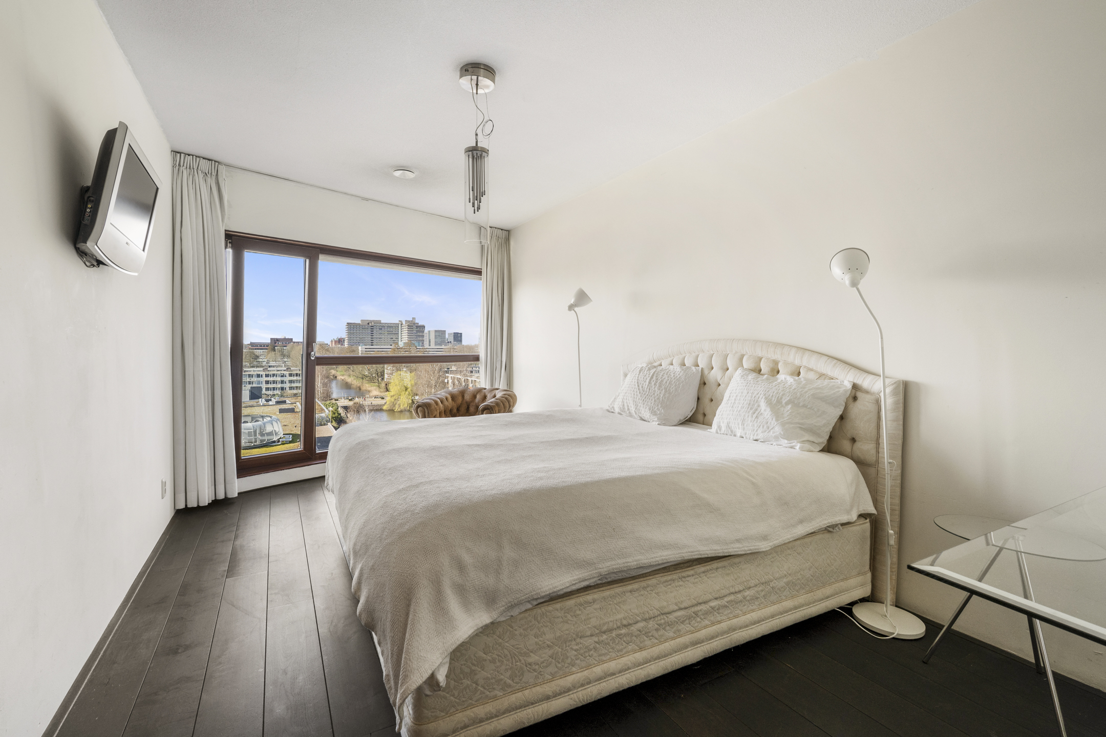 Door de ligging en de vele ramen aan zowel de zuidwest als aan de noordkant in combinatie met een ligging op de zevende (!) verdieping heeft het appartement een spectaculair uitzicht over het water en de skyline van de Amsterdamse Zuidas.