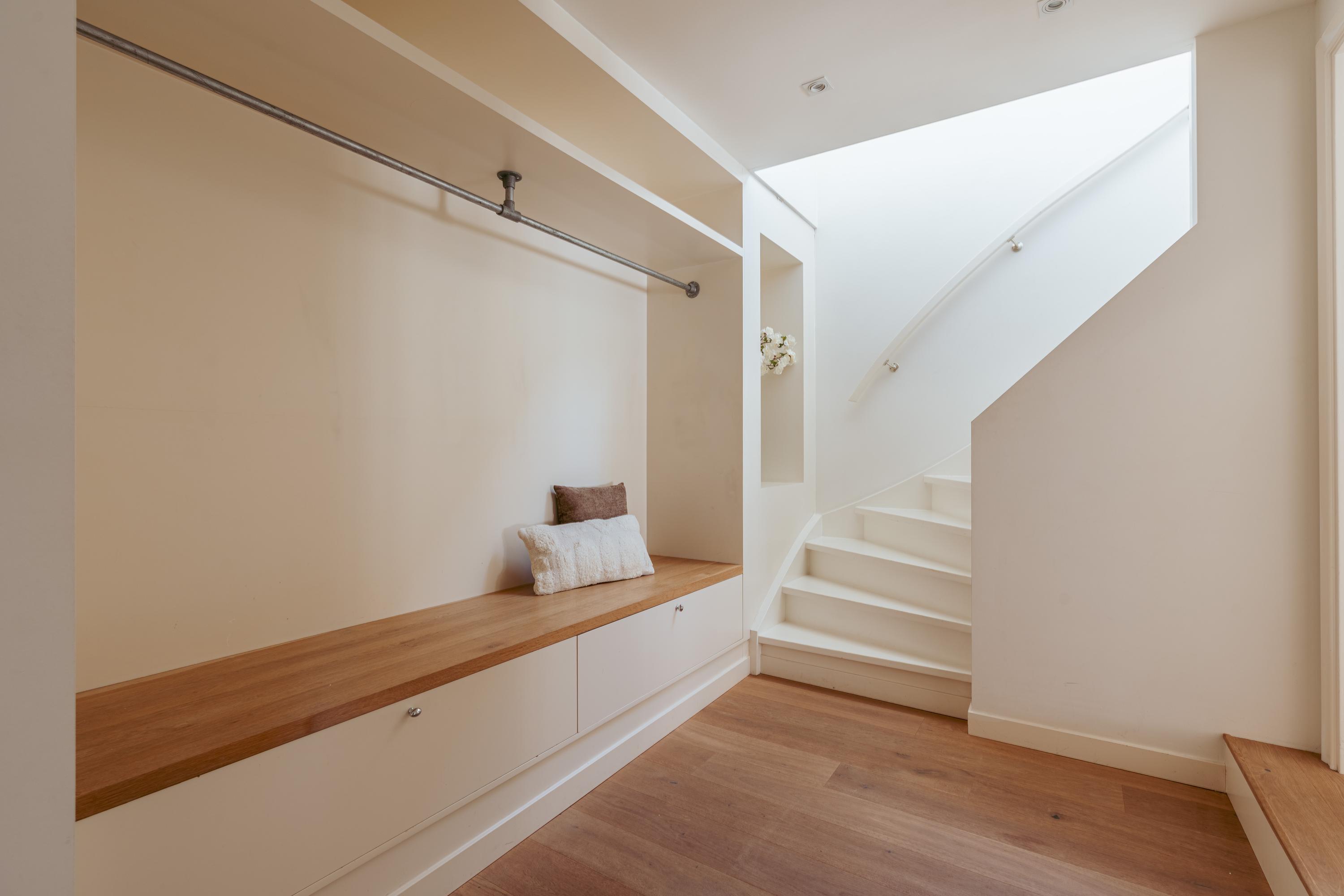 De woning is toegankelijk via zowel de eerste als de tweede verdieping. Op de tweede verdieping bevindt zich de royale doorzonwoonkamer, die dankzij de grote raampartijen aan beide zijden baadt in natuurlijk licht. De ruimte biedt volop plaats voor een comfortabele zithoek én een royaal eetgedeelte met een grote eettafel. De sfeervolle schouw vormt hierbij een charmant middelpunt. Aan de voorzijde ligt de moderne open keuken, voorzien van luxe inbouwapparatuur, waaronder een 4-pits gasfornuis met afzuigkap, een oven, vaatwasser en een koel- en vriescombinatie. Aan de achterzijde vindt u de eerste slaapkamer, ideaal te gebruiken als werkkamer of logeerkamer. Via openslaande deuren bereikt u het zonnige balkon van circa 7 m², dat zich over de volle breedte van de woning uitstrekt en op het zuidwesten is gelegen – perfect voor een middagzon. Vanuit de hal is tevens een separaat toilet bereikbaar.