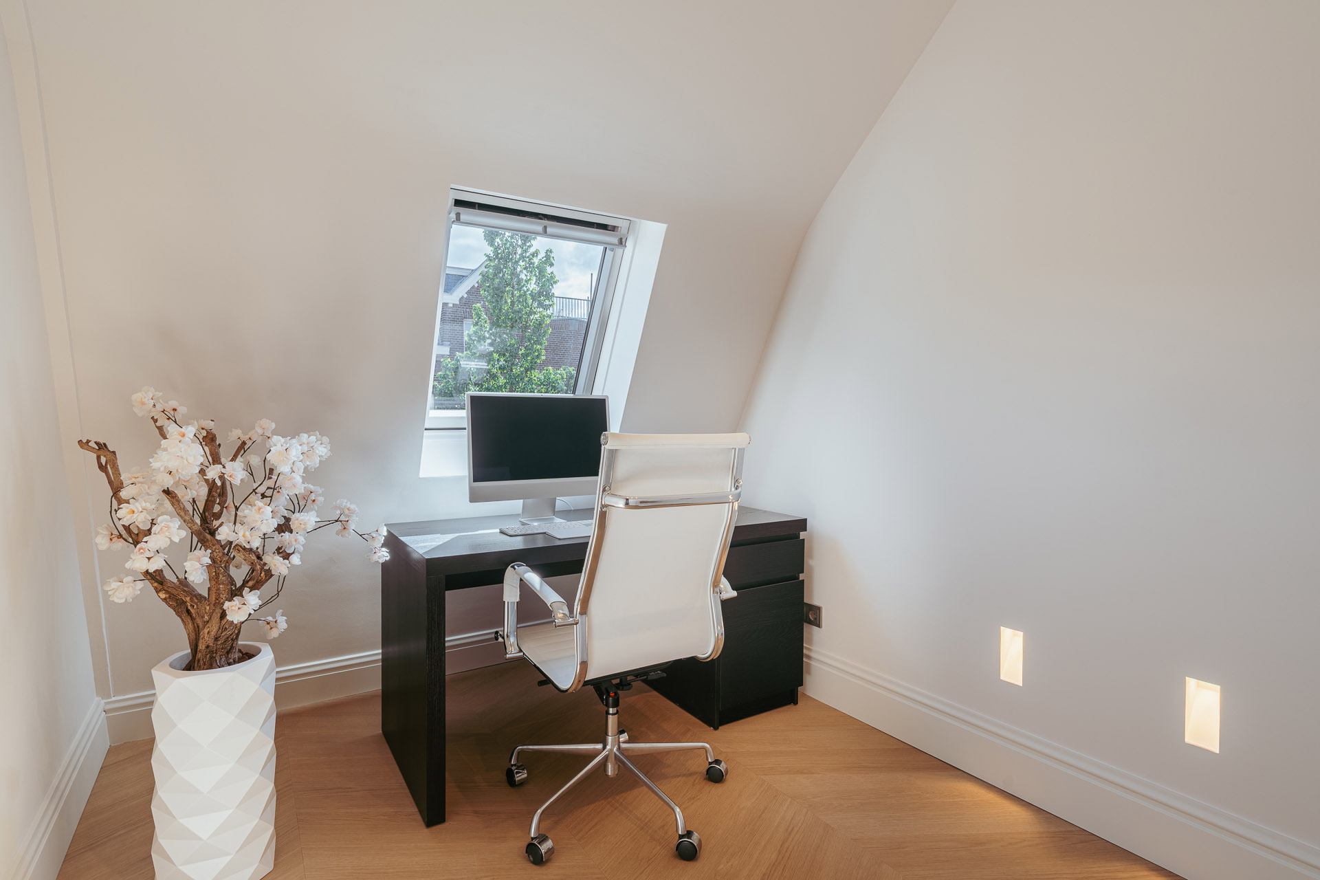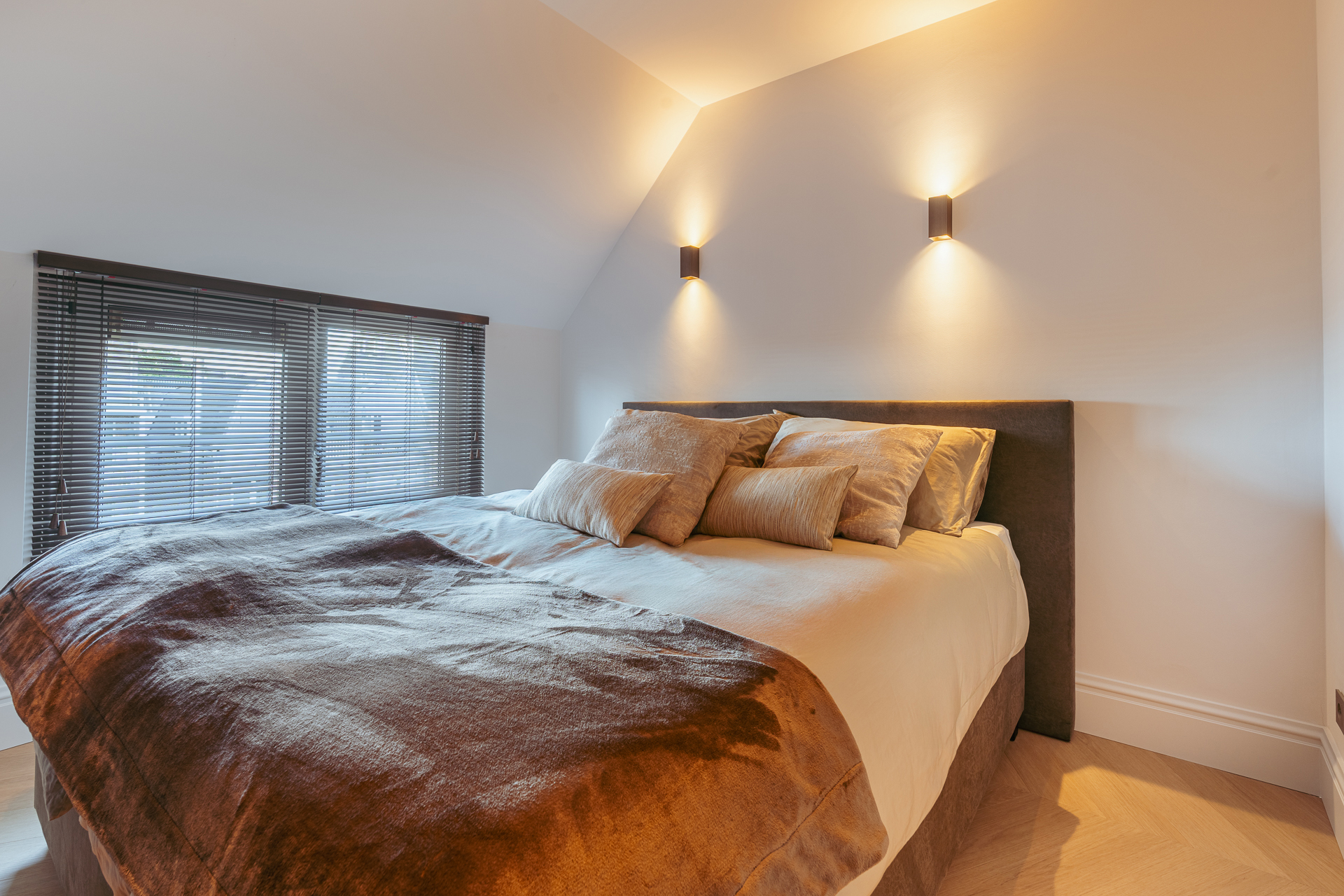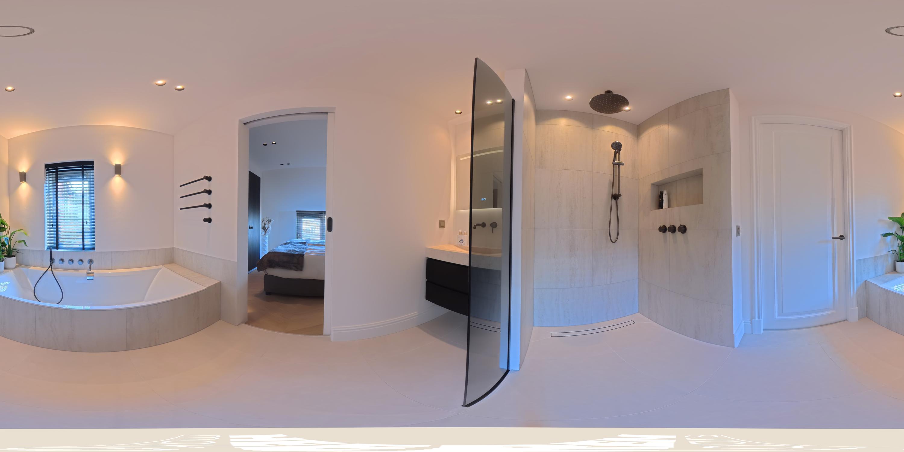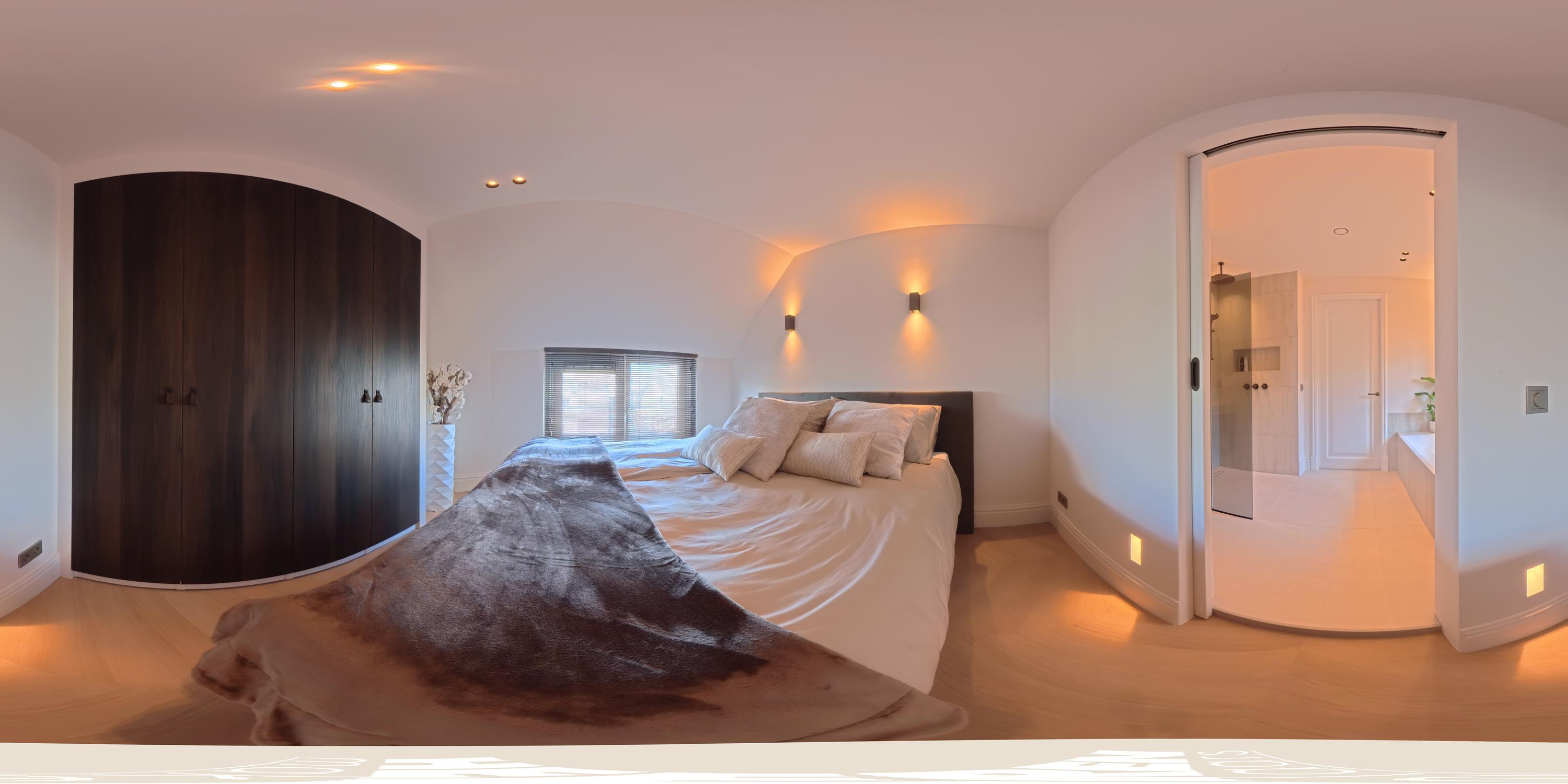 Vanuit de hal heeft u toegang tot de badkamer en twee slaapkamers. De eerste, aan de voorzijde, is multifunctioneel inzetbaar en leent zich ook uitstekend als kinder-, werk- of studeerkamer. Hier bevindt zich tevens de vernieuwde meterkast met 3-fase aansluiting. Aan de achterzijde ligt de master bedroom met fraaie inbouwkasten en directe toegang tot de royale luxe badkamer. Deze is uitgerust met Villeroy en Boch ligbad, inloopdouche en stijlvol natuurstenen wastafel. De badkamer kan met een geïntegreerde schuifdeur worden afgesloten van de slaapkamer indien gewenst.