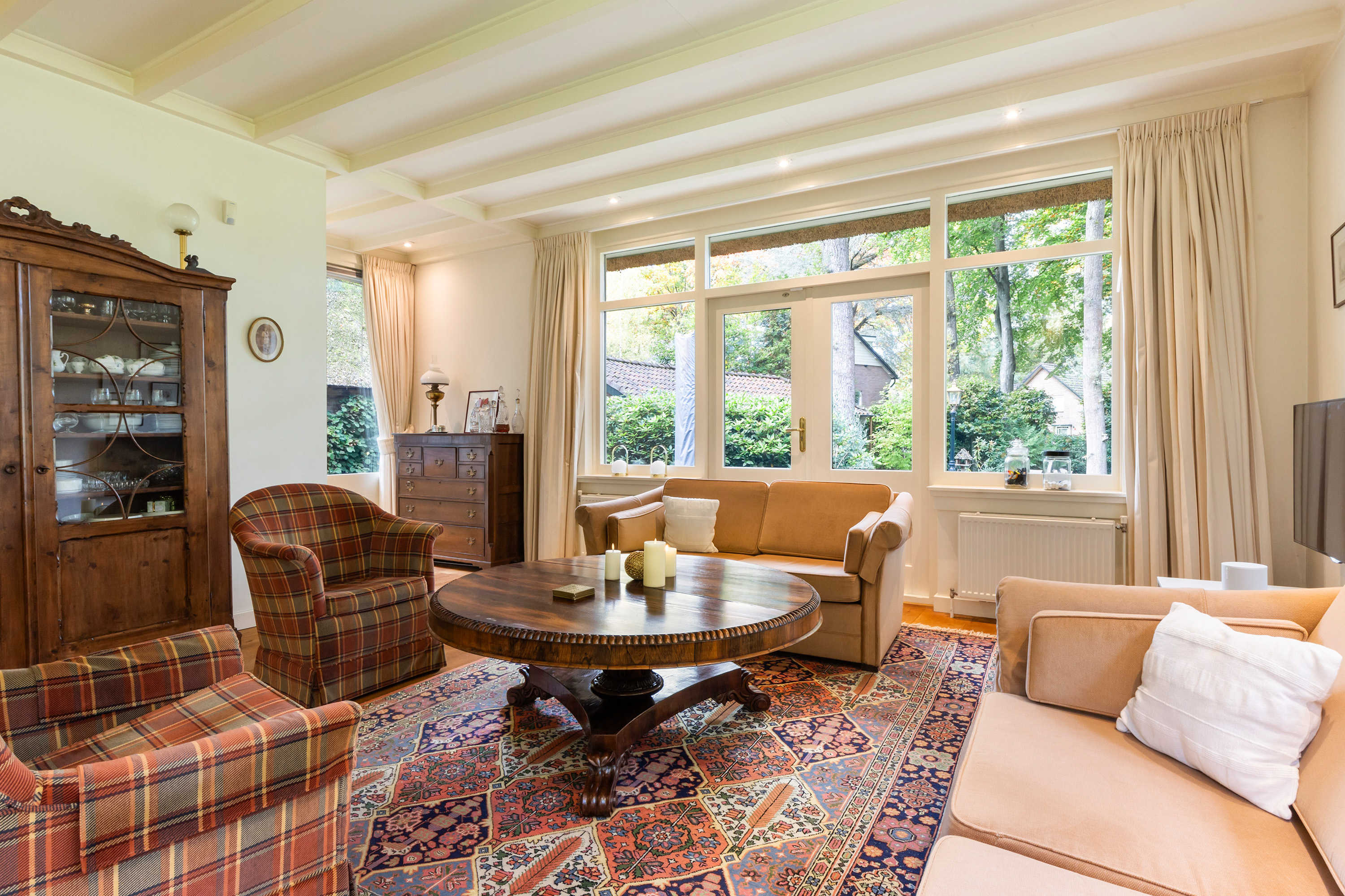 Via en-suite deuren is de eet/woonkamer bereikbaar. Net als de werkkamer heeft ook deze ruimte hoge plafonds met sierlijsten en randafwerking. De grote ramen zorgen voor veel lichtinval en een ruimtelijk gevoel.