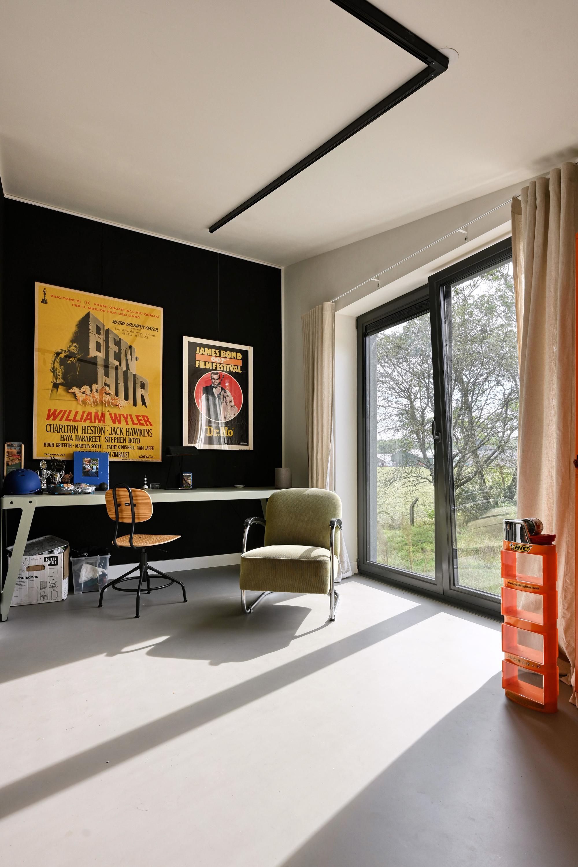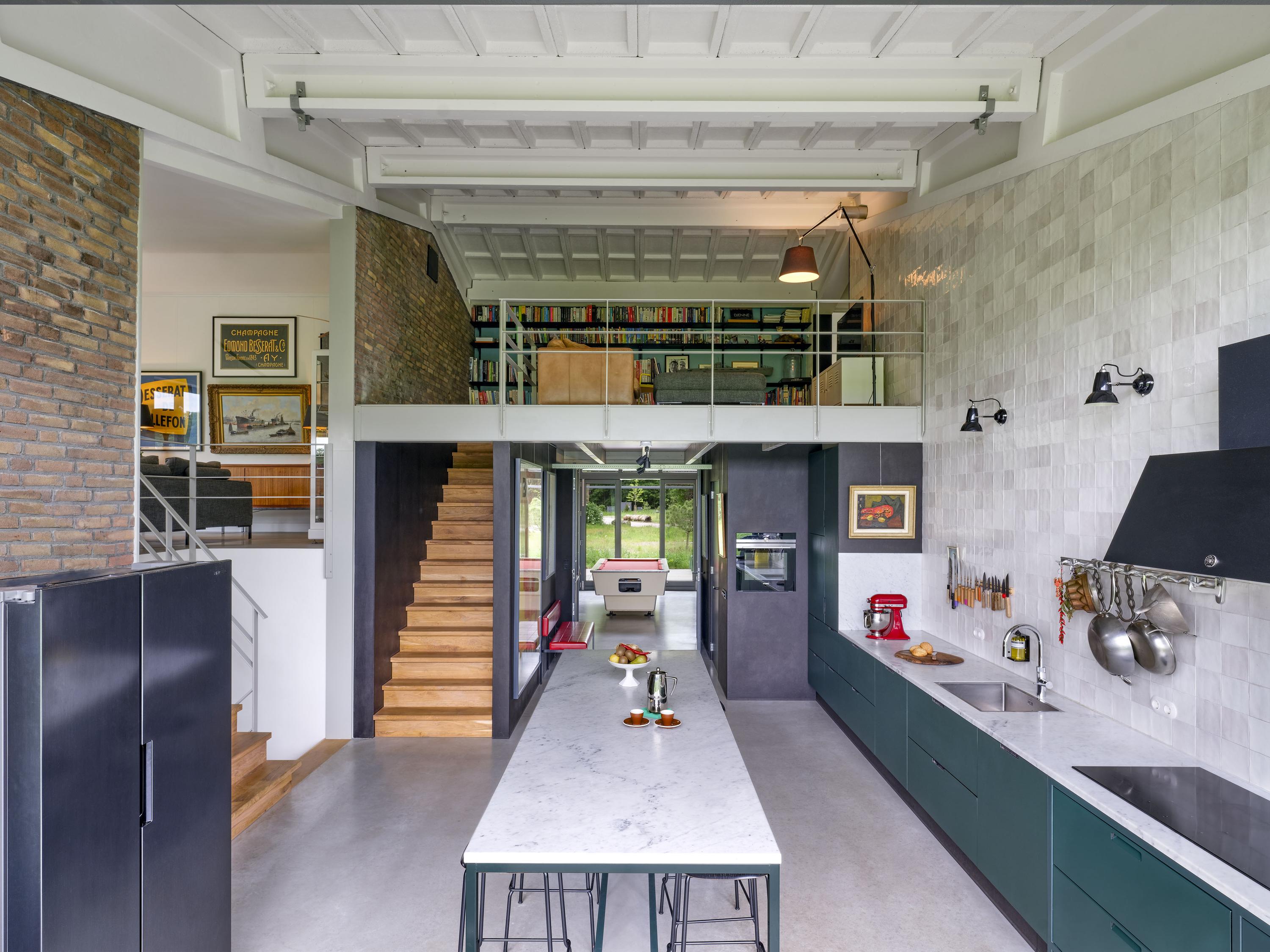 Entree, ruime hal met zicht op de vide. Deze ruimte is met het biljart in gebruik als hobbyruimte met terrasdeuren die geheel opengeschoven kunnen worden naar het terras. Dubbele stalen deuren bieden toegang tot de woonkeuken als ‘het kloppend hart’ van het huis. Het modern vormgegeven kookeiland met marmeren aanrecht staat centraal in de ruimte. Zodra de terrasdeuren over de gehele breedte zijn geopend is heerlijk om in de ochtend te genieten van de ochtendzon en het buitenleven met vrij zicht over een open veld. In combinatie met de groene kleurstelling van de keuken en de muur die tot aan het plafond is getegeld met Marrokkaanse tegeltjes is een geraffineerde mix van luxe materialen en sfeer ontstaan. Uiteraard is de keuken voorzien van de benodigde inbouwapparatuur. Een grote berging/bijkeuken doet dienst als provisieruimte en was- en linnenruimte. Een houten trap brengt u naar de woonkamer met ramen en deuren naar de vloer met vrij uitzicht over de natuur aan de zuidzijde van het huis. Een trap brengt u een niveau lager naar een gang met kledingkasten waaraan de slaapvertrekken en de badkamer zijn gesitueerd. 3 Ruime slaapkamers zijn voorzien van terrasdeuren naar het naastgelegen terras. Een luxe badkamer is gerealiseerd met ligbad, douche, toilet en een wastafel voor 2 personen. Een trap brengt u naar de 4e slaapkamer aan de zuidzijde van het huis. Deze kamer is voorzien van een wastafel. Omdat overal de ramen en deuren van glas tot de vloer doorlopen staat u in direct contact met de natuur. Vanuit de keuken is een vaste trap naar de vide.