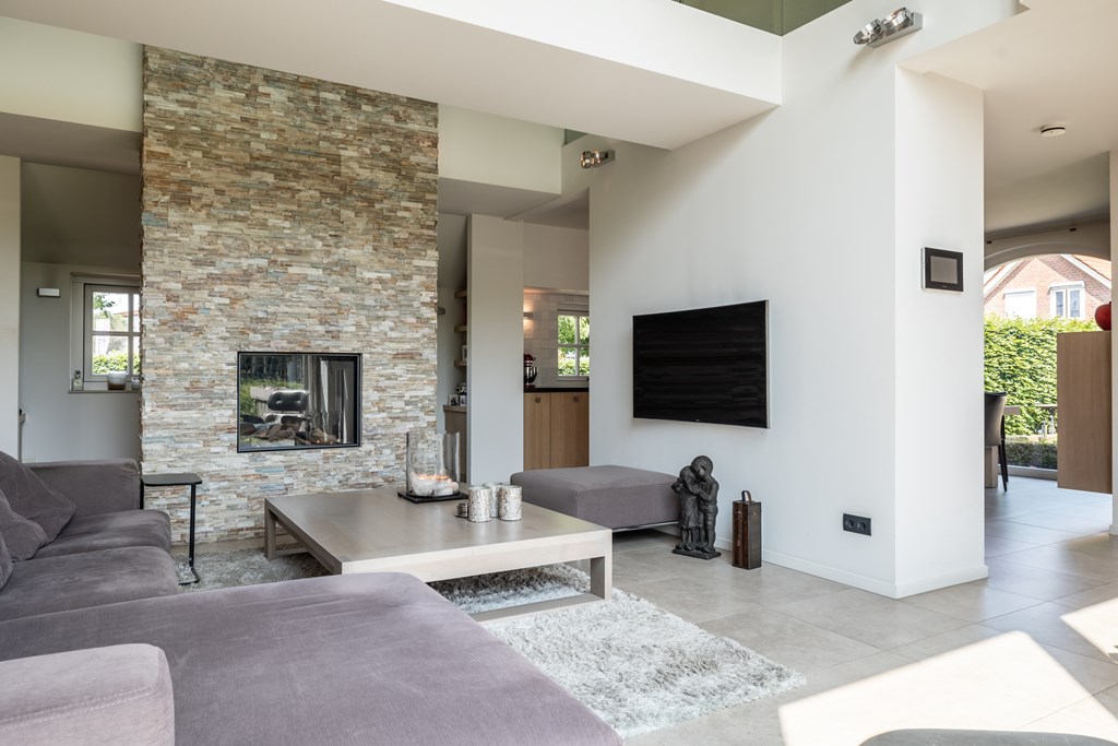 De woonkamer is voorzien van een keramische tegelvloer met vloerverwarming, inbouwverlichting, plafondverwarming en een gashaard. Door de grote glasgevel aan de achterzijde van het huis komt er veel natuurlijk lichtinval de woning binnen. Dankzij de grote glasgevel staat u vanuit de woonkamer altijd in verbinding met de tuin.