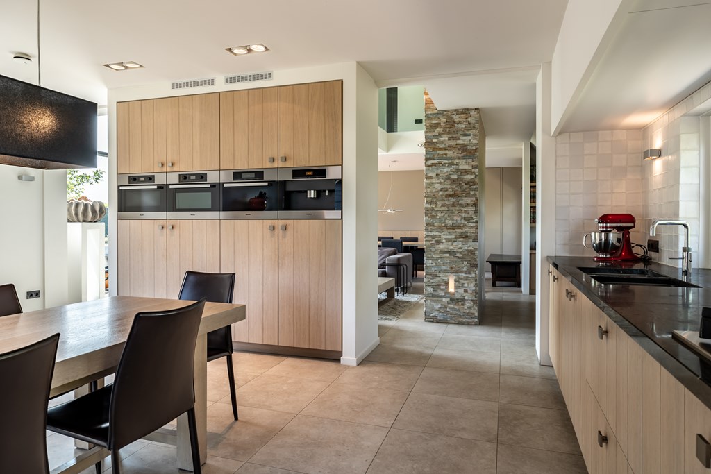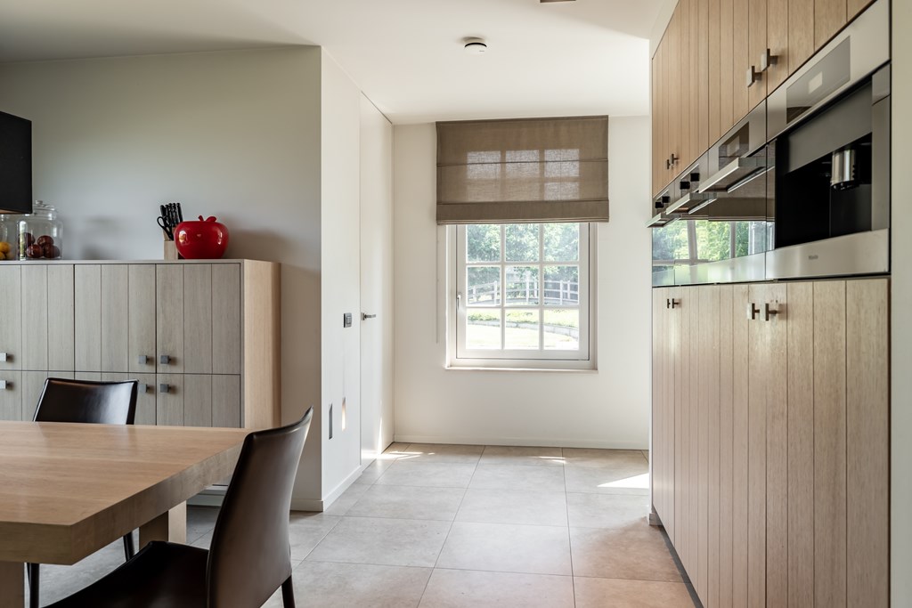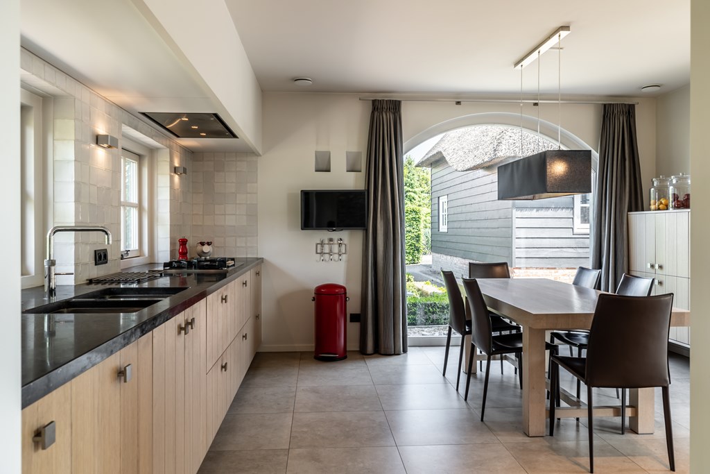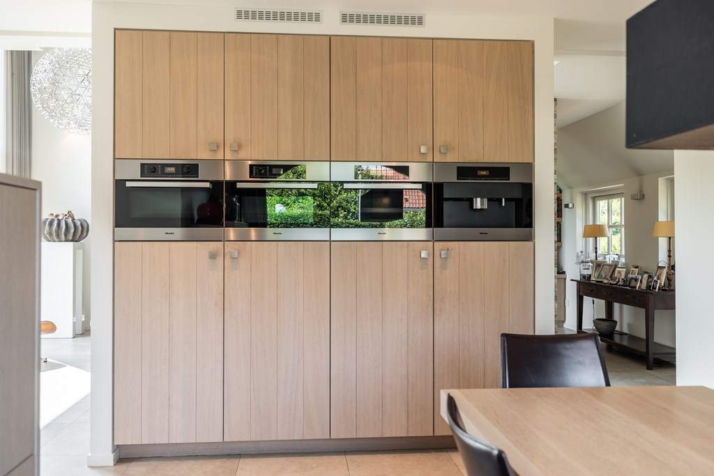 De woonkeuken is uitgevoerd in een rechte opstelling met een wand vol met apparatuur van Miele. De keuken is voorzien van een inbouwkoffiemachine, stoomoven, bakoven, magnetron, vaatwasser, koelkast, vriezer, 4-pits gaskookplaat met wok brander, afzuigkap en een dubbele gootsteen met Quooker. Door het gebruik van natuursteen en hout heeft deze keuken een landelijk karakter.