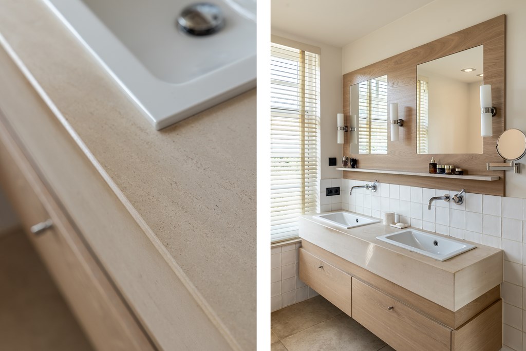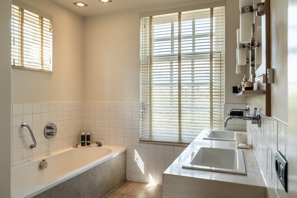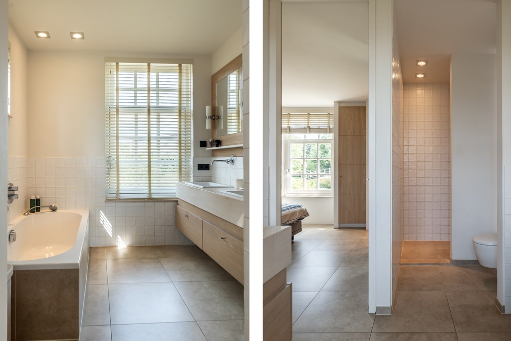 Doordat er gebruik is gemaakt van de juiste kleuren en materialen voelt deze badkamer als een oase van rust. De badkamer is voorzien van een ligbad, inloopdouche, vloerverwarming, wandcloset en een dubbele wastafel met fraai meubel.