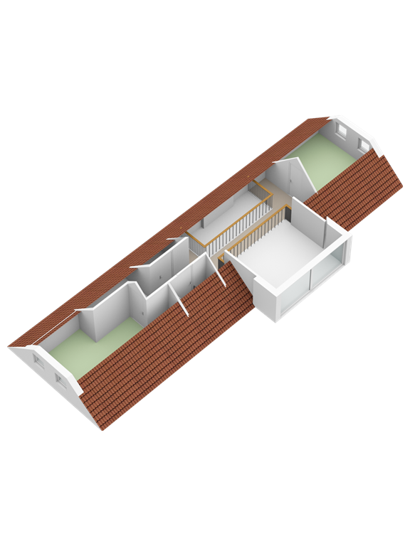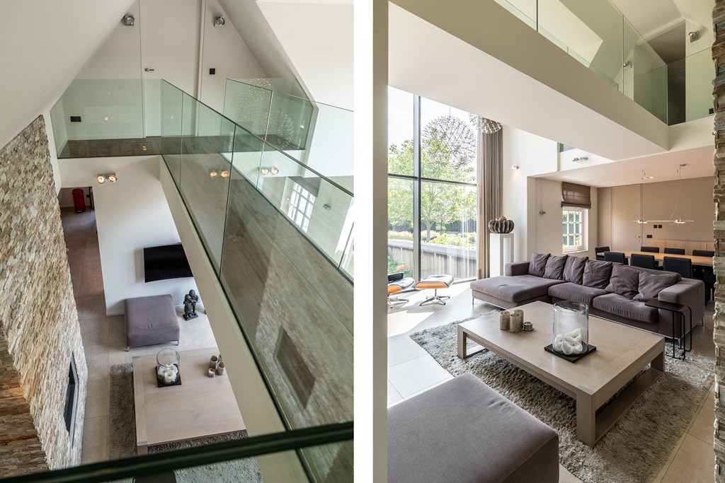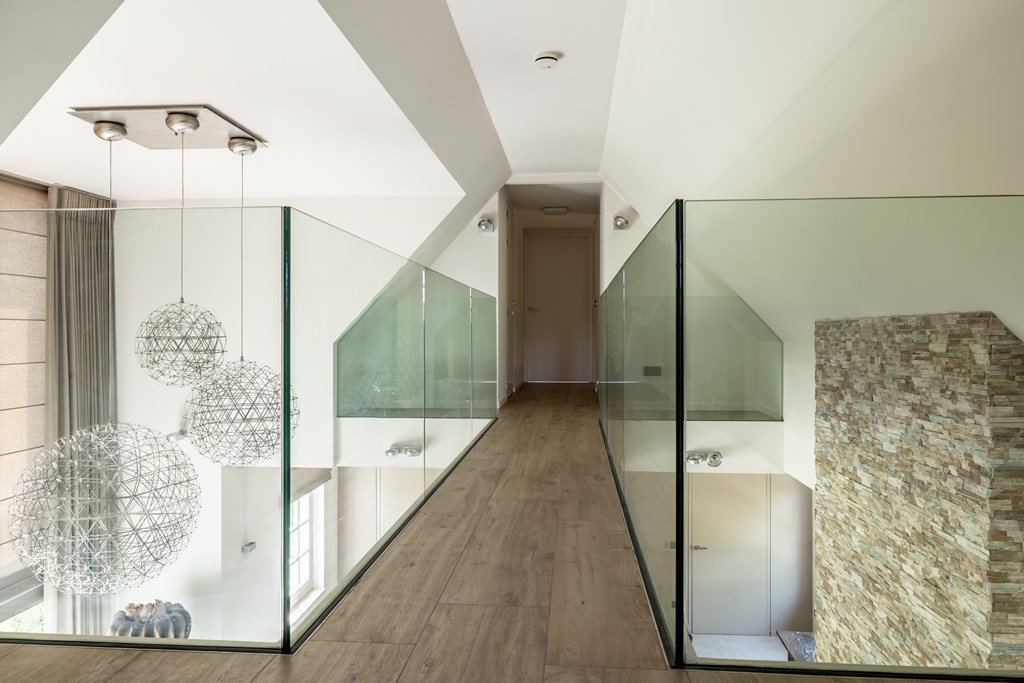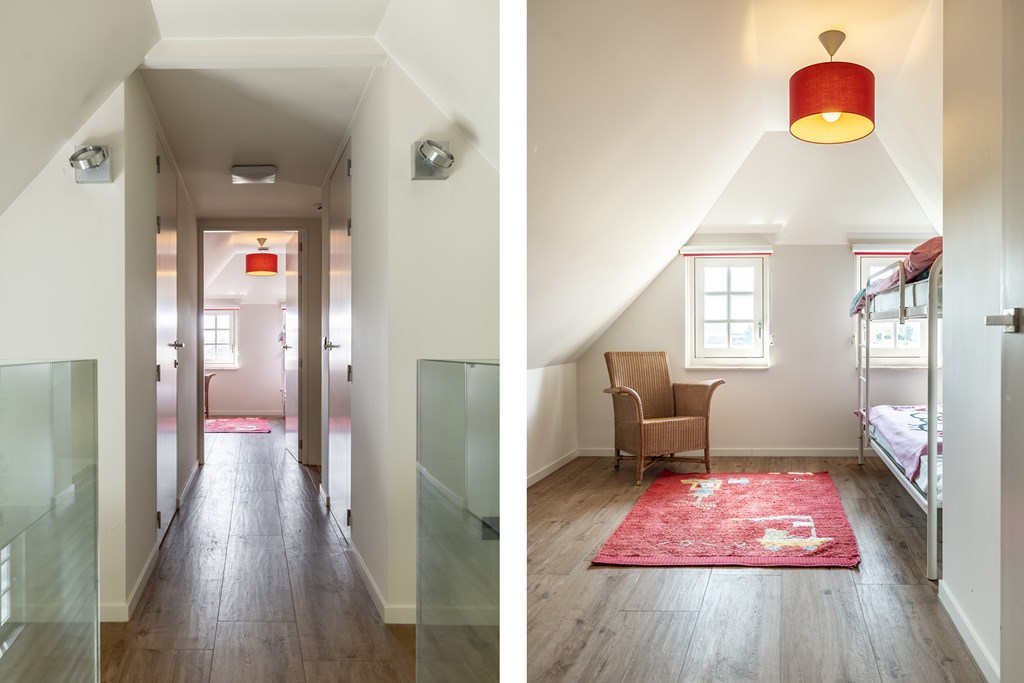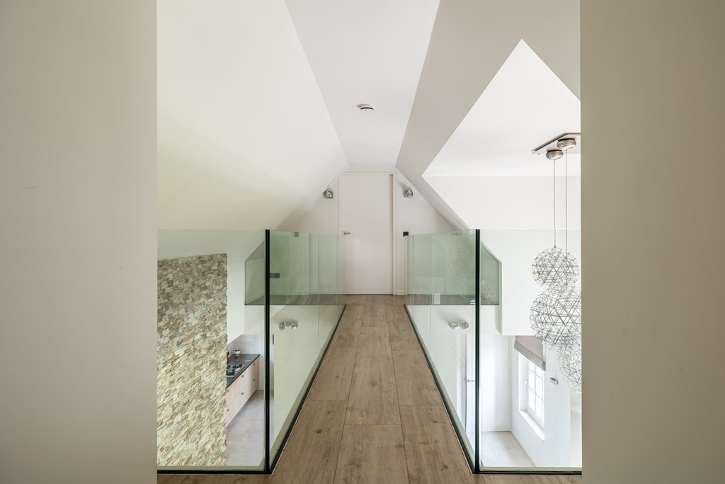 Op de eerste verdieping zijn aan beide kanten van het huis slaapkamers gecreëerd. Deze twee slaapkamers staan met elkaar in verbinding middels een “brug” vanwaar u een prachtig uitzicht heeft over de tuin. Doordat de brug is voorzien van een balustrade van glas heeft het bouwelement een luchtig karakter.