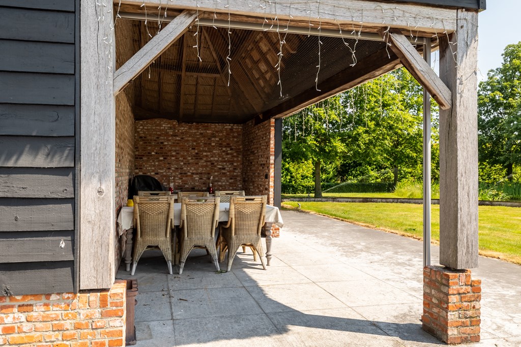 Achter op het perceel staat een grote schuur met op het dak maar liefst 64 pv-panelen die volledig uit het zicht van het woonhuis zijn onttrokken. Deze schuur kan na een aanpassing uitstekend fungeren als bijvoorbeeld een paardenstal om hobbymatig paarden aan huis te houden. Een gedeelte van de tuin kan ingericht worden als paardenweide.