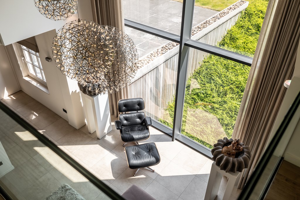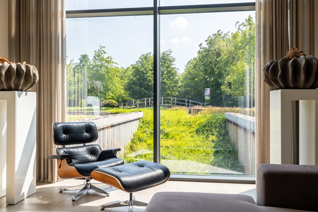 De onder architectuur aangelegde en geheel omsloten parkachtige tuin heeft ontzettend veel fijne plekjes waar u heerlijk van het buitenleven kunt genieten. Vanaf het grote terras met overkapping heeft u een mooi uitzicht over de grote vijver met fontein en loopbrug.
