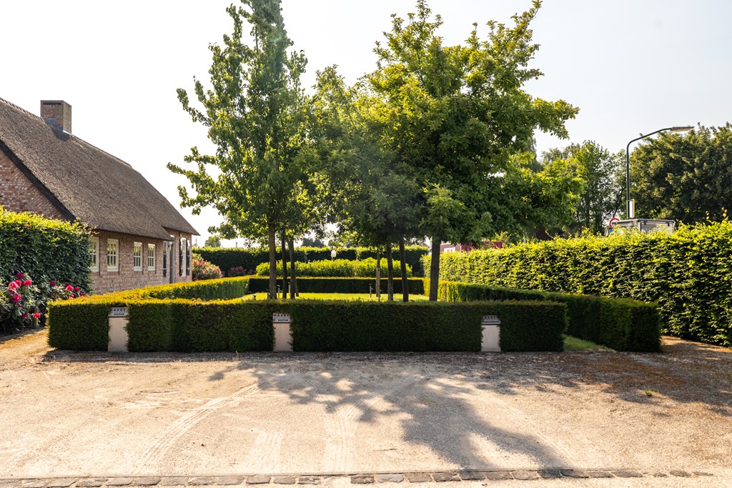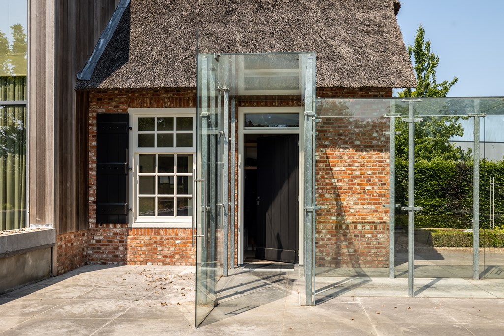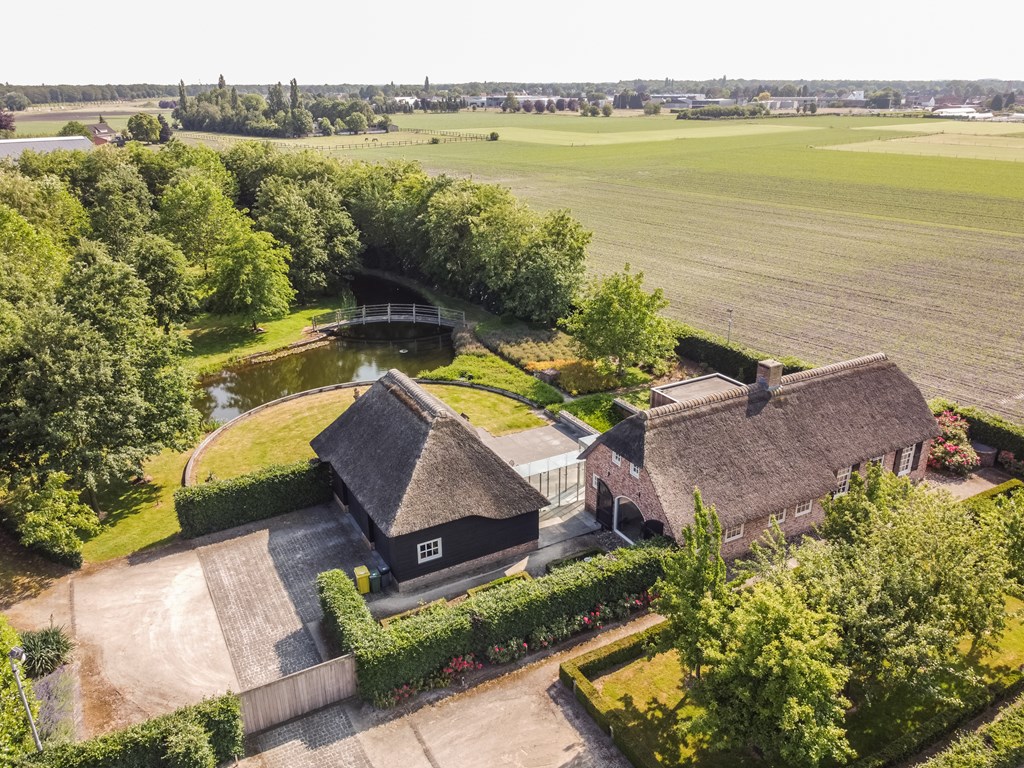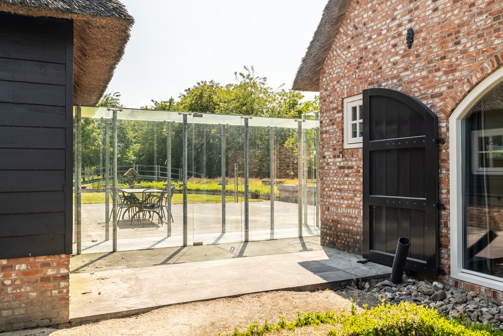 De garage die middels een glazen doorgang met het woonhuis is verbonden is net zoals het hoofdverblijf voorzien van een rieten dak. De dubbele garage heeft elektrisch bedienbare segmentdeuren en biedt plaats aan twee auto’s.