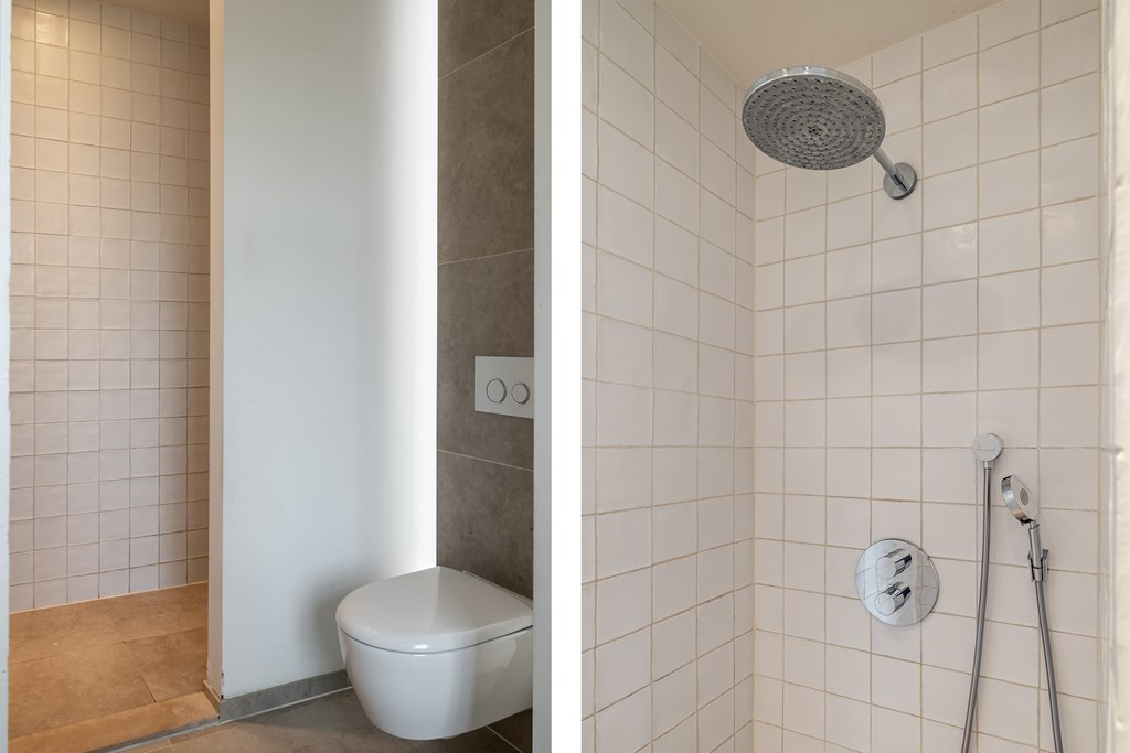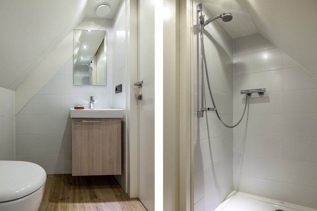 De tweede badkamer is volledig betegeld en voorzien van een wastafel met meubel, wandcloset en douche.