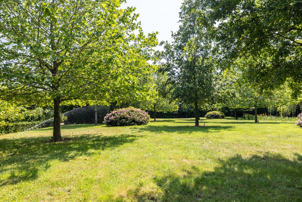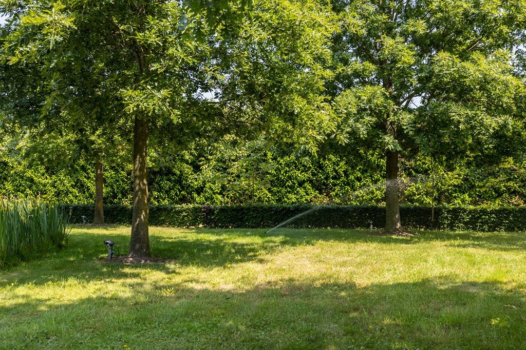 De volwassen beplanting, de groenborders en het gazon worden besproeid via een door domotica aangestuurd sprinkler systeem die is aangesloten op een grondwaterput. Het geheel wordt in de avond mooi verlicht middels een zorgvuldig opgebouwd lichtplan.