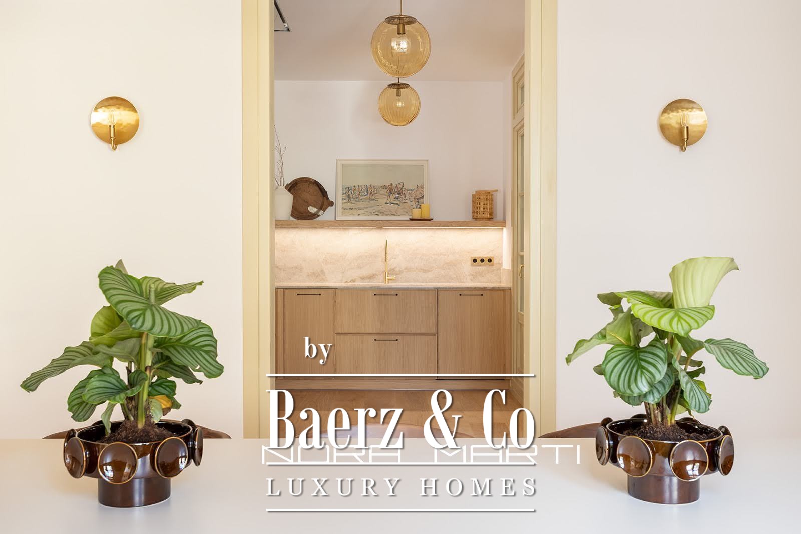 The luxurious renovation focuses on quality and detail while preserving the building's original features and charm. A Catalan vaulted ceiling is visible throughout the apartment, enhancing the feeling of spaciousness and light. The ceiling transforms the living room into a truly exceptional space, featuring handcrafted local tiles and floor-to-ceiling windows that open onto a tranquil terrace; this room is unique and the heart of the living area.