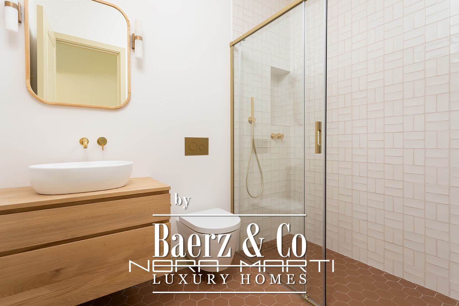 The interior design incorporates natural elements to create a warm and modern feel while maintaining an air of elegance. All three exterior bedrooms feature large double beds, built-in wardrobes, and en-suite bathrooms. The aged brass bathroom fixtures are from a local Catalan company known for its design and quality. Natural oak flooring covers the entire apartment; the wider-than-usual planks suggest a more modern approach to traditional, high-quality flooring. Underfloor heating throughout offers understated luxury, as does the dual-zone climate control system, adjustable in each room. The light fixtures, sourced from both Catalonia and England, feature decorative and functional pieces, including vintage and antique elements. The apartment's inviting green terrace adds another dimension, a space for entertaining, relaxing, and enjoying the feeling of spaciousness in the heart of Barcelona.