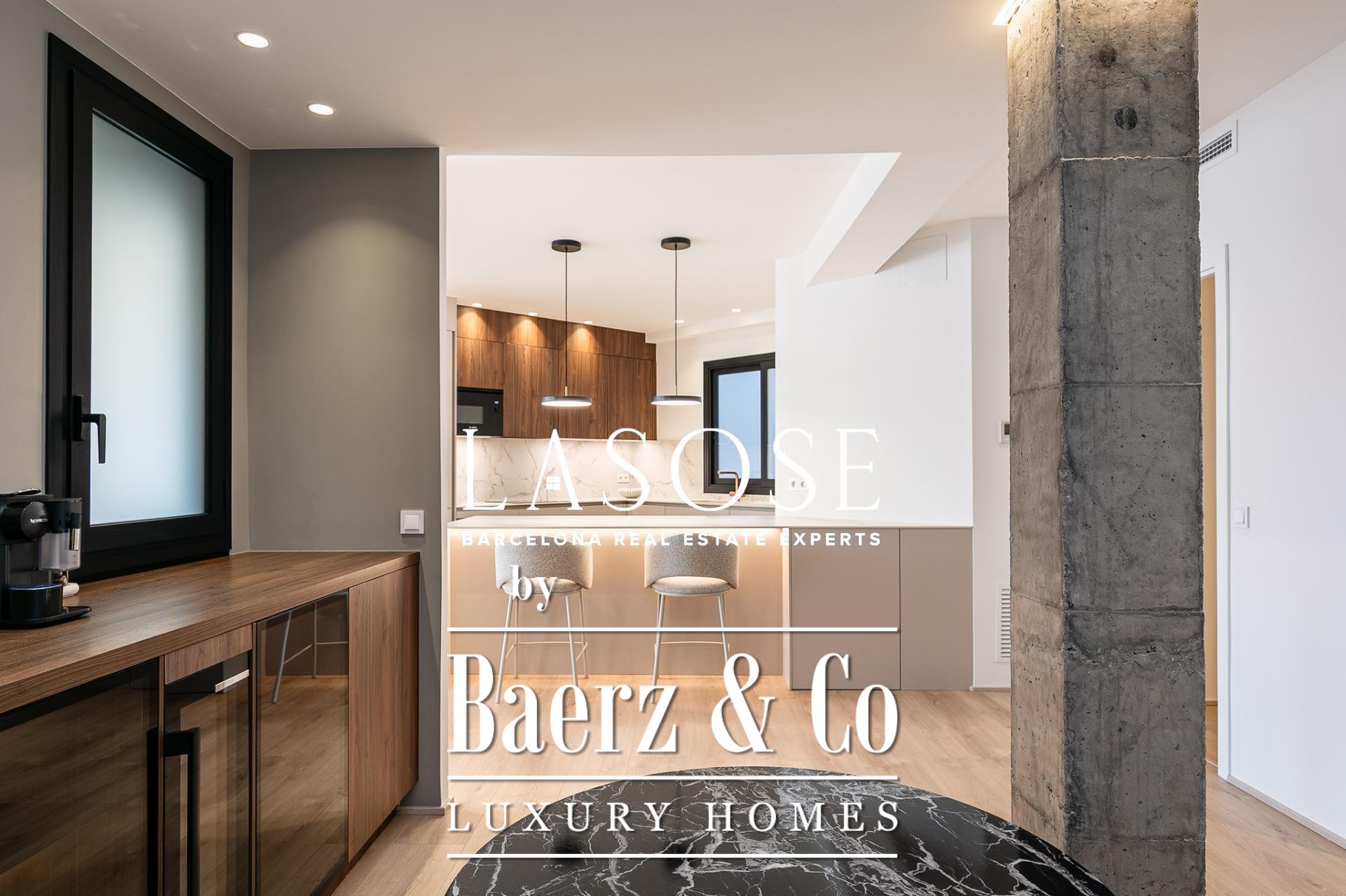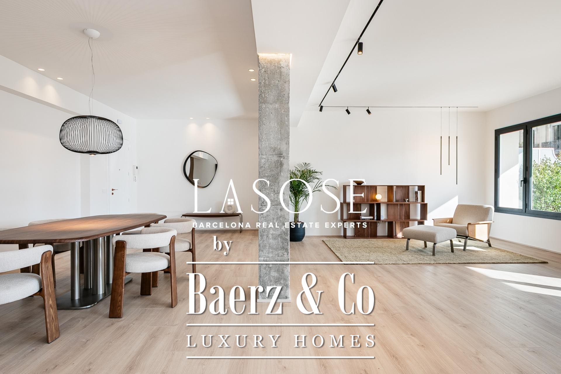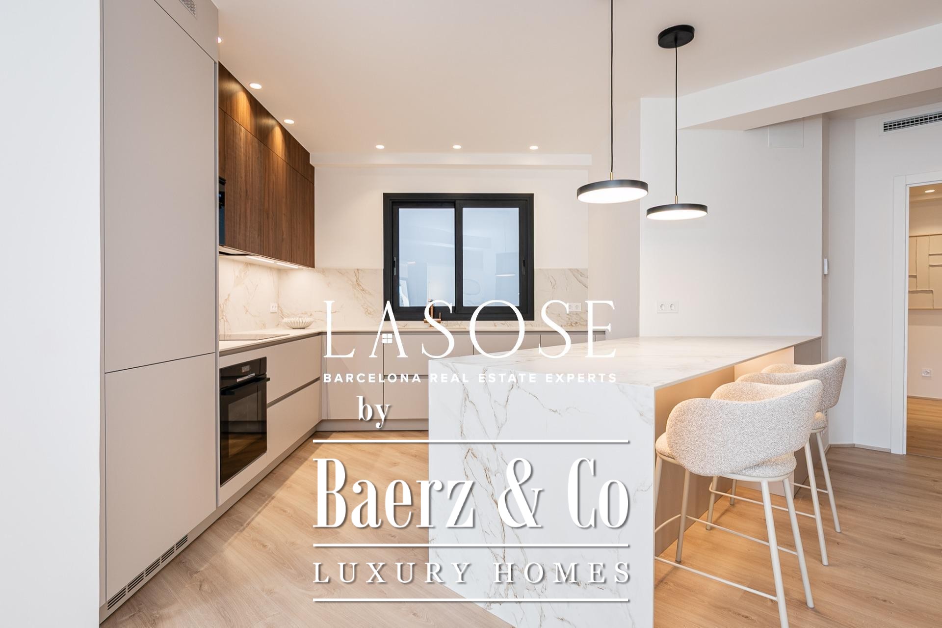 Het appartement is volledig gerenoveerd met hoogwaardige materialen. Dankzij de royale, zuidoostgerichte ramen baadt het interieur in het licht en vormt de open woonkamer met eetgedeelte van 90 m² een uitnodigende leefruimte. Vanuit hier geven deuren toegang tot een panoramisch hoekterras met uitzicht over de met bomen omzoomde boulevards en Plaça Mossèn Jacint Verdaguer. De keuken, van Santos en voorzien van Bosch-apparatuur, is ingericht rond een sociaal kookeiland met geïntegreerde wijnkast en koffienis; aangrenzend bevindt zich een bijkeuken voor discrete opslag.