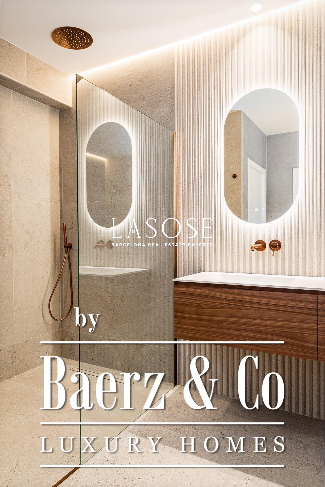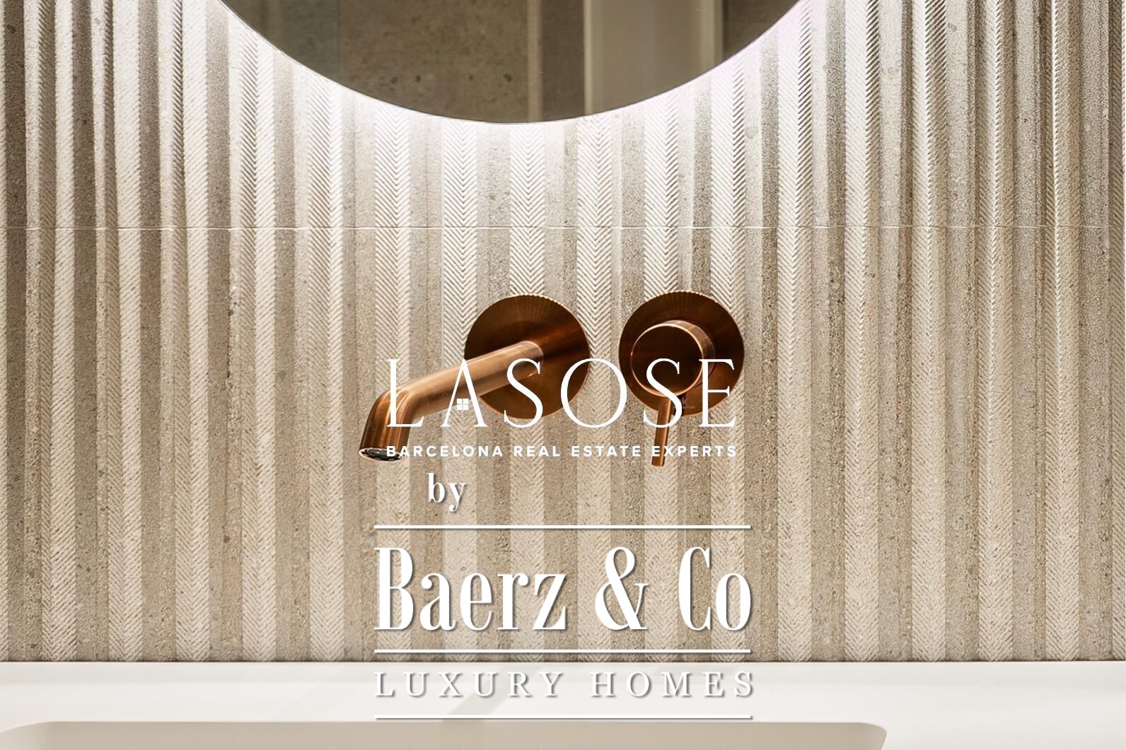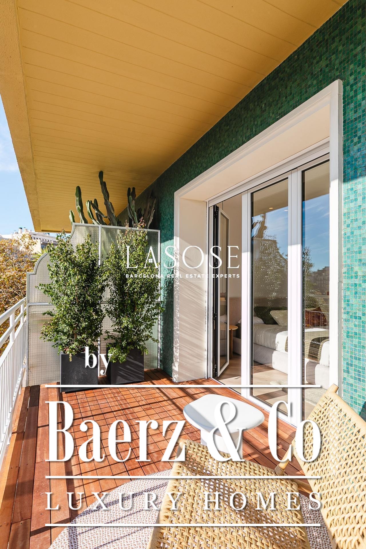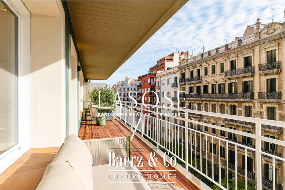 Het appartement is volledig gerenoveerd met hoogwaardige materialen. Dankzij de royale, zuidoostgerichte ramen baadt het interieur in het licht en vormt de open woonkamer met eetgedeelte van 90 m² een uitnodigende leefruimte. Vanuit hier geven deuren toegang tot een panoramisch hoekterras met uitzicht over de met bomen omzoomde boulevards en Plaça Mossèn Jacint Verdaguer. De keuken, van Santos en voorzien van Bosch-apparatuur, is ingericht rond een sociaal kookeiland met geïntegreerde wijnkast en koffienis; aangrenzend bevindt zich een bijkeuken voor discrete opslag.