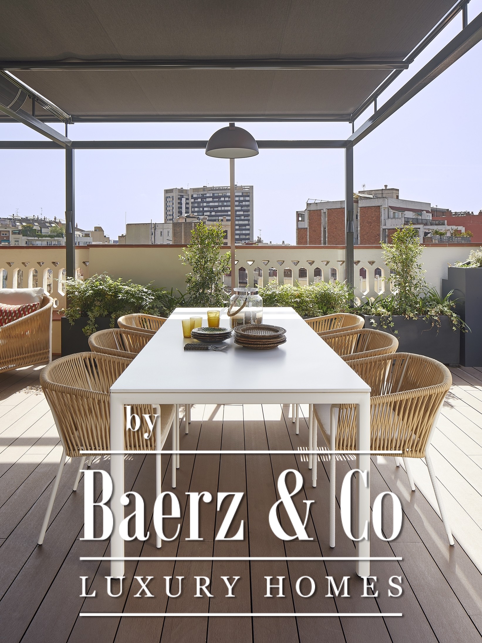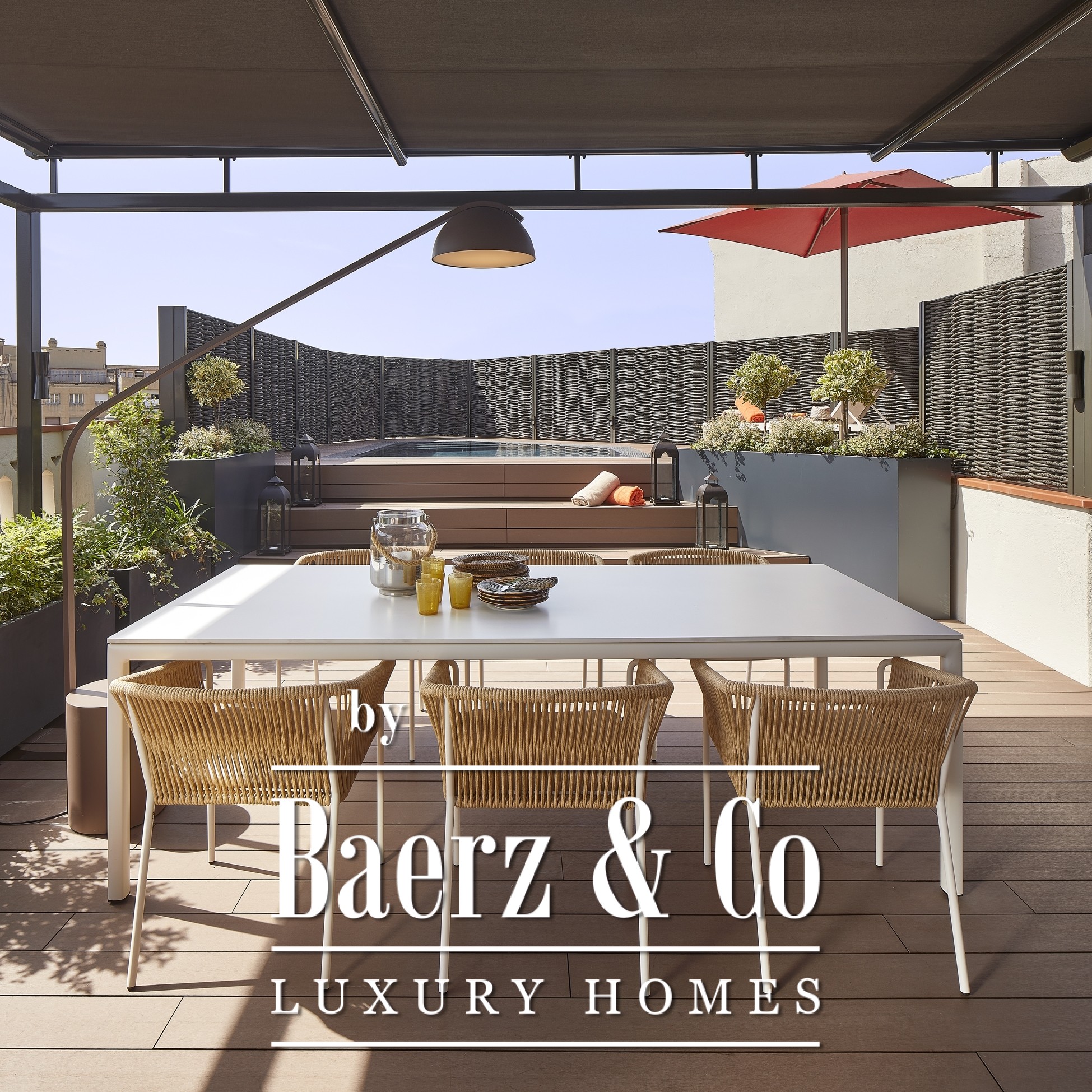 Penthouse Barcelona vormt een zeldzame samensmelting van klassiek architectonisch erfgoed met verfijnd hedendaags wonen. Deze zorgvuldig gerenoveerde penthouse, gesitueerd in een elegant hoekgebouw in de wijk Eixample, valt op dankzij 274 m² woonoppervlakte en een indrukwekkend privéterras van 100 m². Licht stroomt door zes buitenbalkons naar binnen en verheldert het open interieur, waar de woonkamer, eetruimte en designkeuken moeiteloos in elkaar overlopen. De beleving van Penthouse Barcelona wordt verder verrijkt door een op maat gemaakte studio en een beeldhouwwerkachtige trap die leidt naar het absolute hoogtepunt van het huis—een uitgestrekte daktuin.