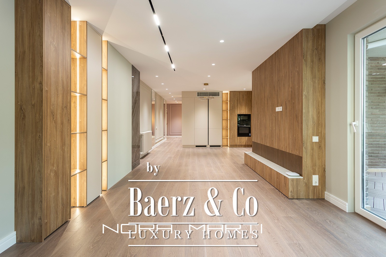 Een royale open woon-, eet- en keukenruimte van circa 51 m² vormt het middelpunt van het appartement en loopt moeiteloos over in een van de twee terrassen, samen goed voor circa 12 m². De keuken is zowel functioneel als elegant, voorzien van Bosch-apparatuur en op maat gemaakte kasten en opbergruimte. Drie dubbele slaapkamers vormen rustige, privé toevluchtsoorden, waaronder een master suite met kleedruimte, eigen badkamer en directe toegang tot het terras. Twee aanvullende dubbele slaapkamers delen een complete badkamer, aangevuld met een discrete gastentoilet.