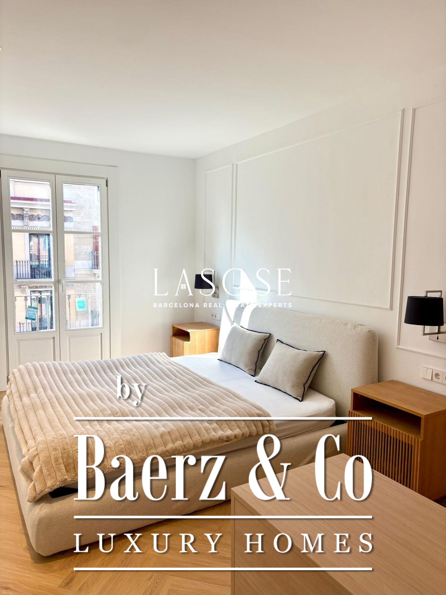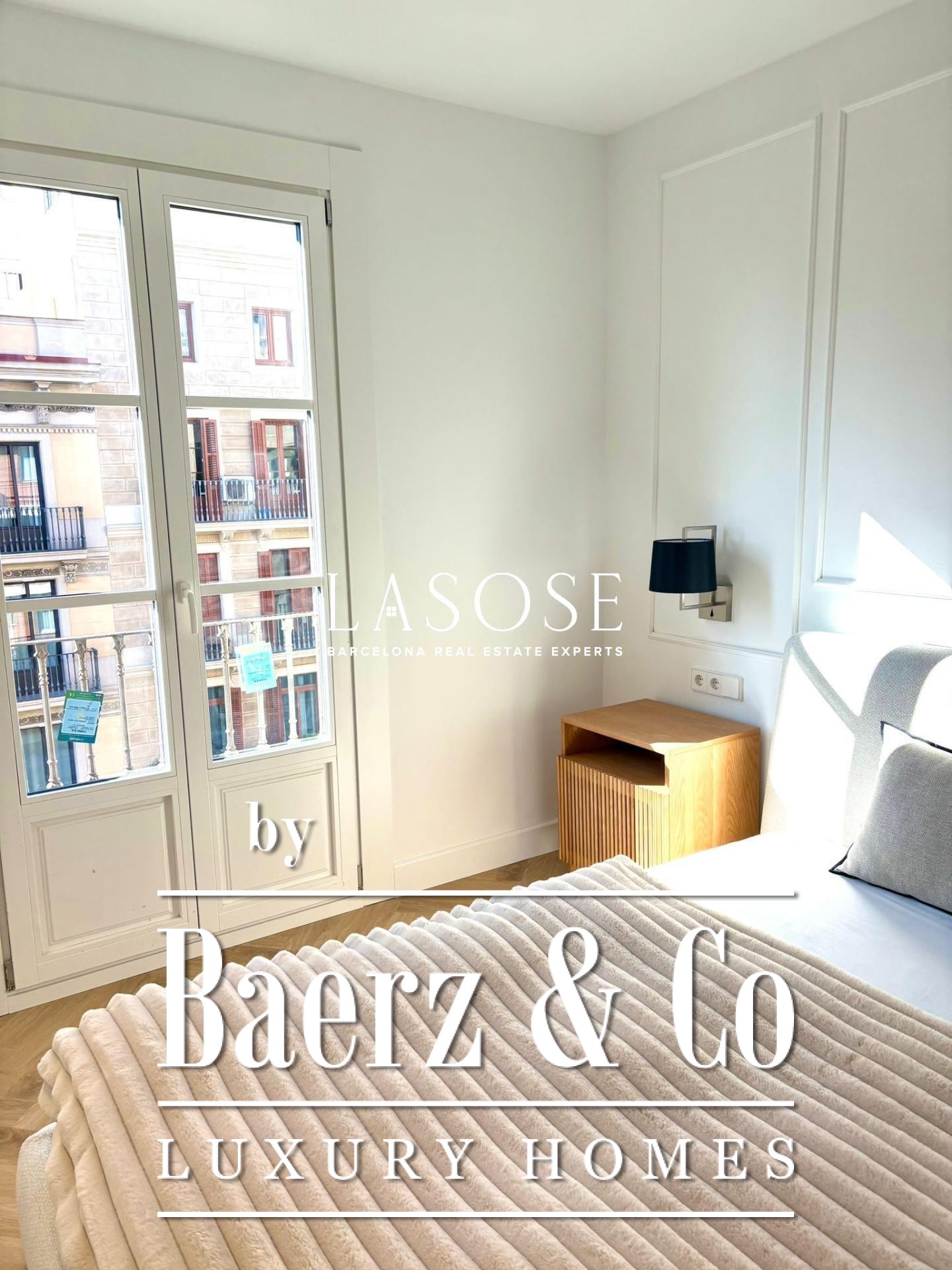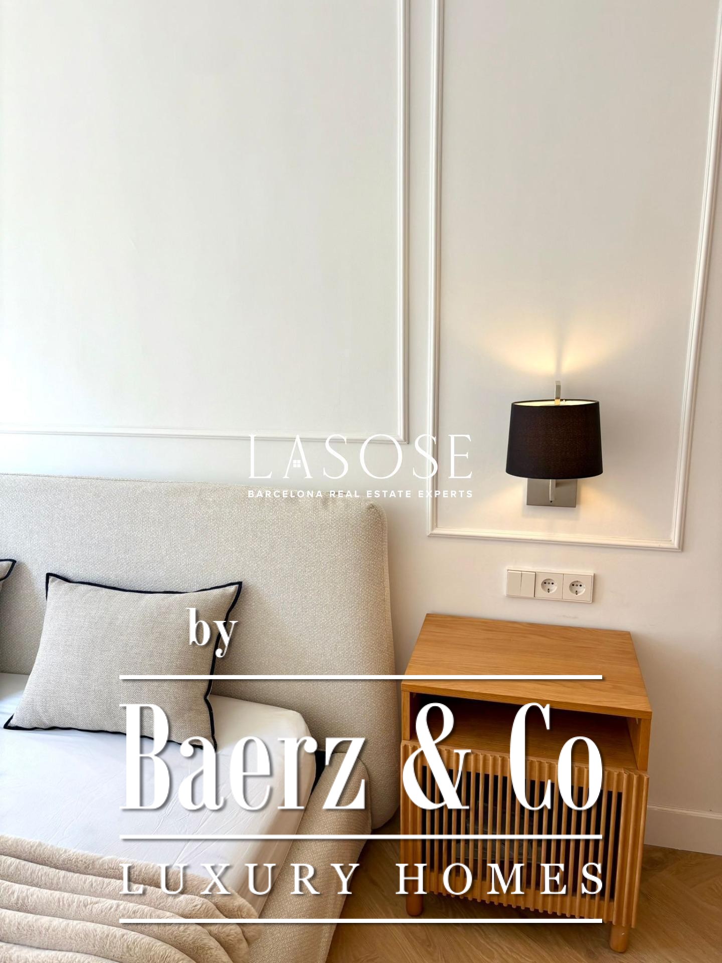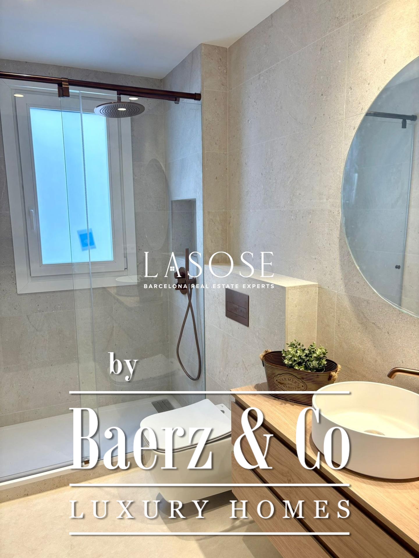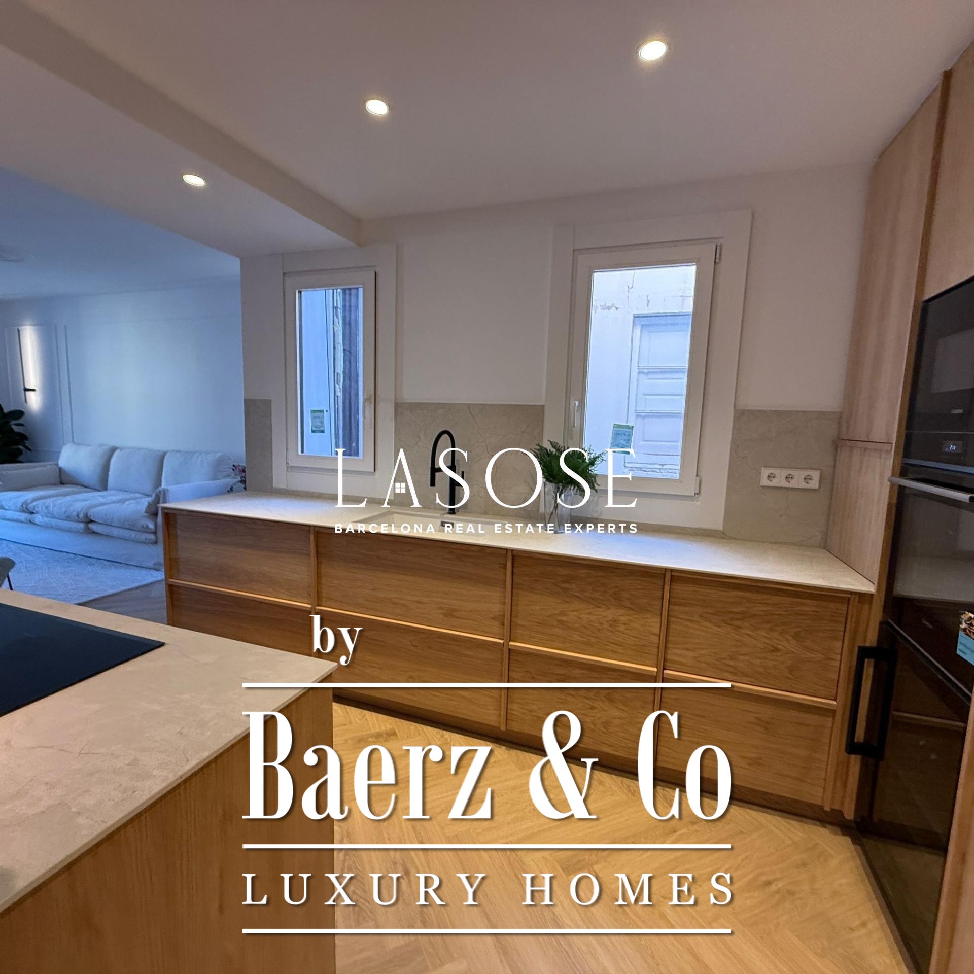 Originele hoge plafonds, sierlijke plafonddetails en traditionele dubbele houten deuren weerspiegelen het architecturale erfgoed van Barcelona, terwijl de royale multifunctionele woon-, eet- en keukenruimte baadt in natuurlijk licht en directe toegang biedt tot een privéterras van 18 m². Het terras is ingericht als lounge en eetruimte en verbindt zo het binnenleven naadloos met het befaamde buitenleven van de stad.