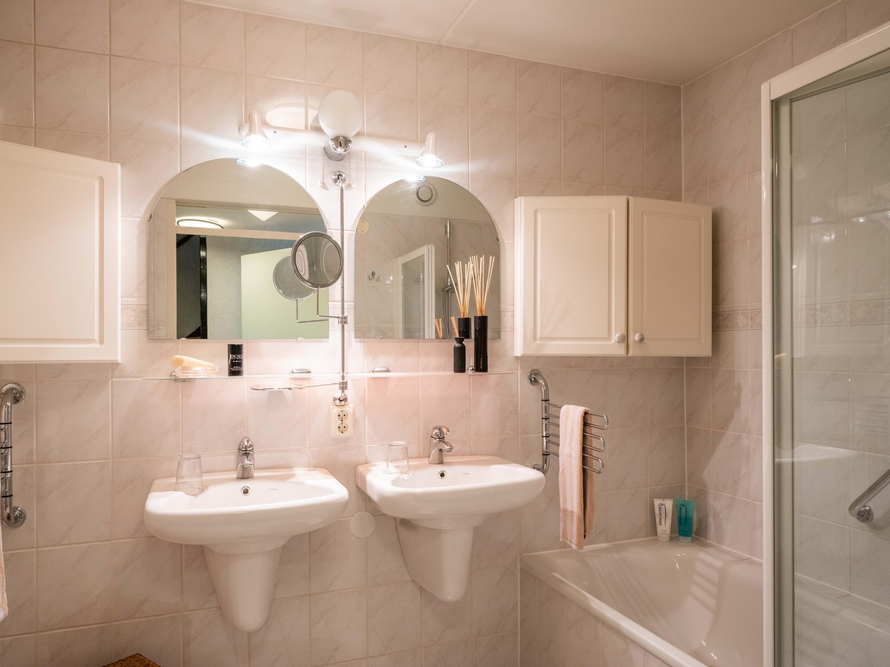 Op de begane grond vindt u verder een ruime kamer aan de tuinzijde, te gebruiken als kantoor, maar ook uitstekend geschikt als slaapkamer. De badkamer op de begane grond is voorzien van een ligbad met douche, dubbele wastafel en toilet.