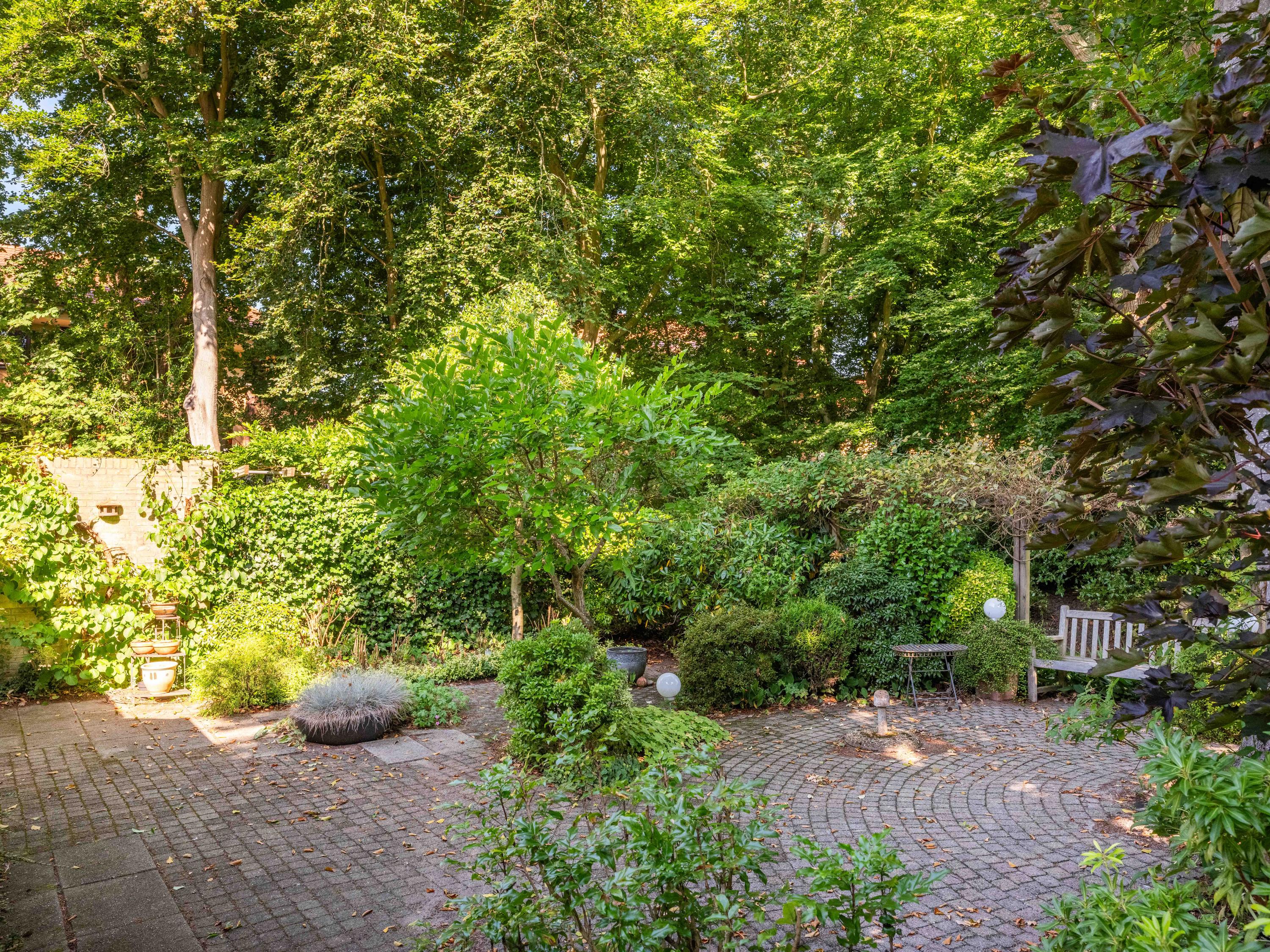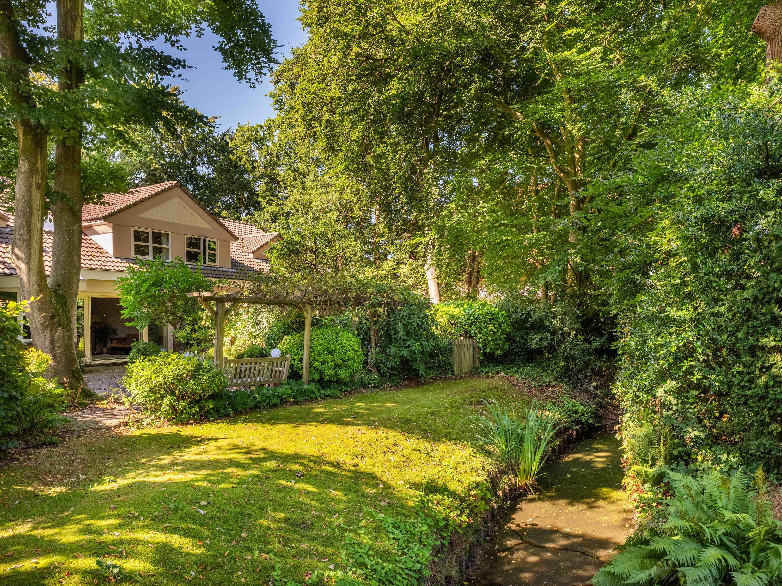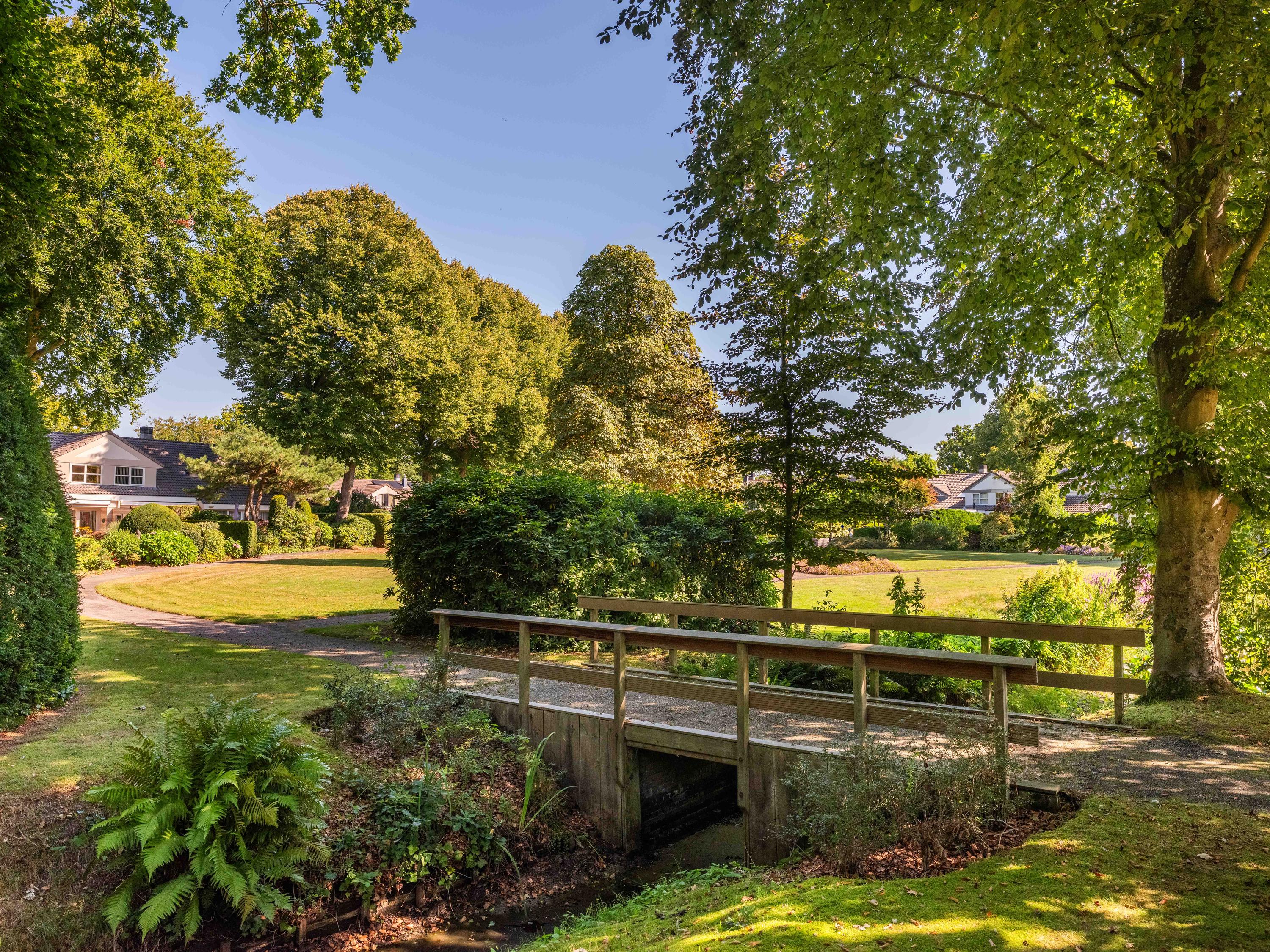 Via de grote schuifpui stapt u zo de zonnige, beschutte achtertuin in, een heerlijke plek om te genieten van rust en privacy, met een terras en uitzicht op de vijverpartij. De fraai aangelegde, zonnige tuin is een oase van rust en privacy. Het terras grenst aan het exclusieve, mandelige park met vijverpartijen – een unieke plek waar u volop kunt genieten van de natuur. Het park is uitsluitend toegankelijk voor omwonenden.
