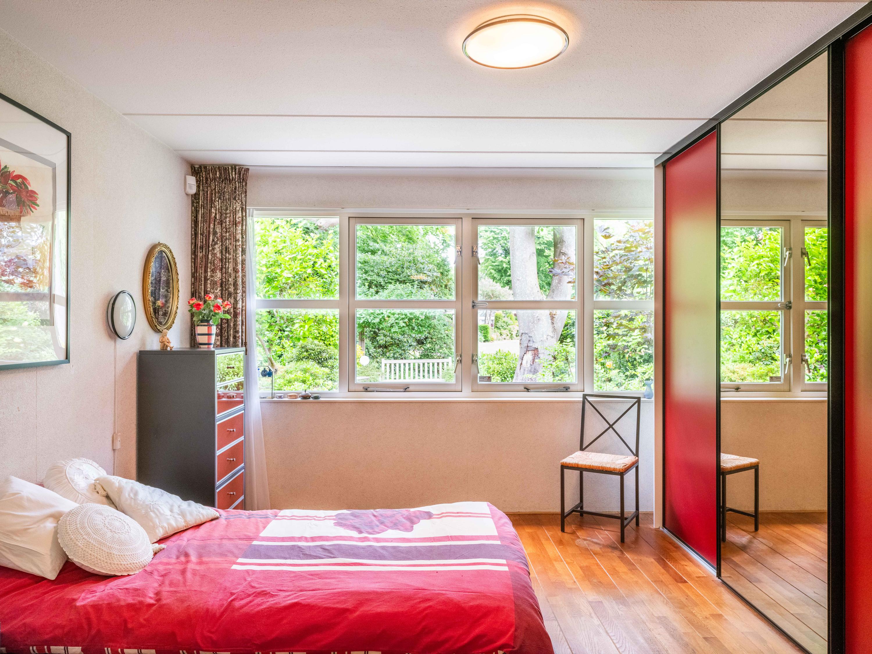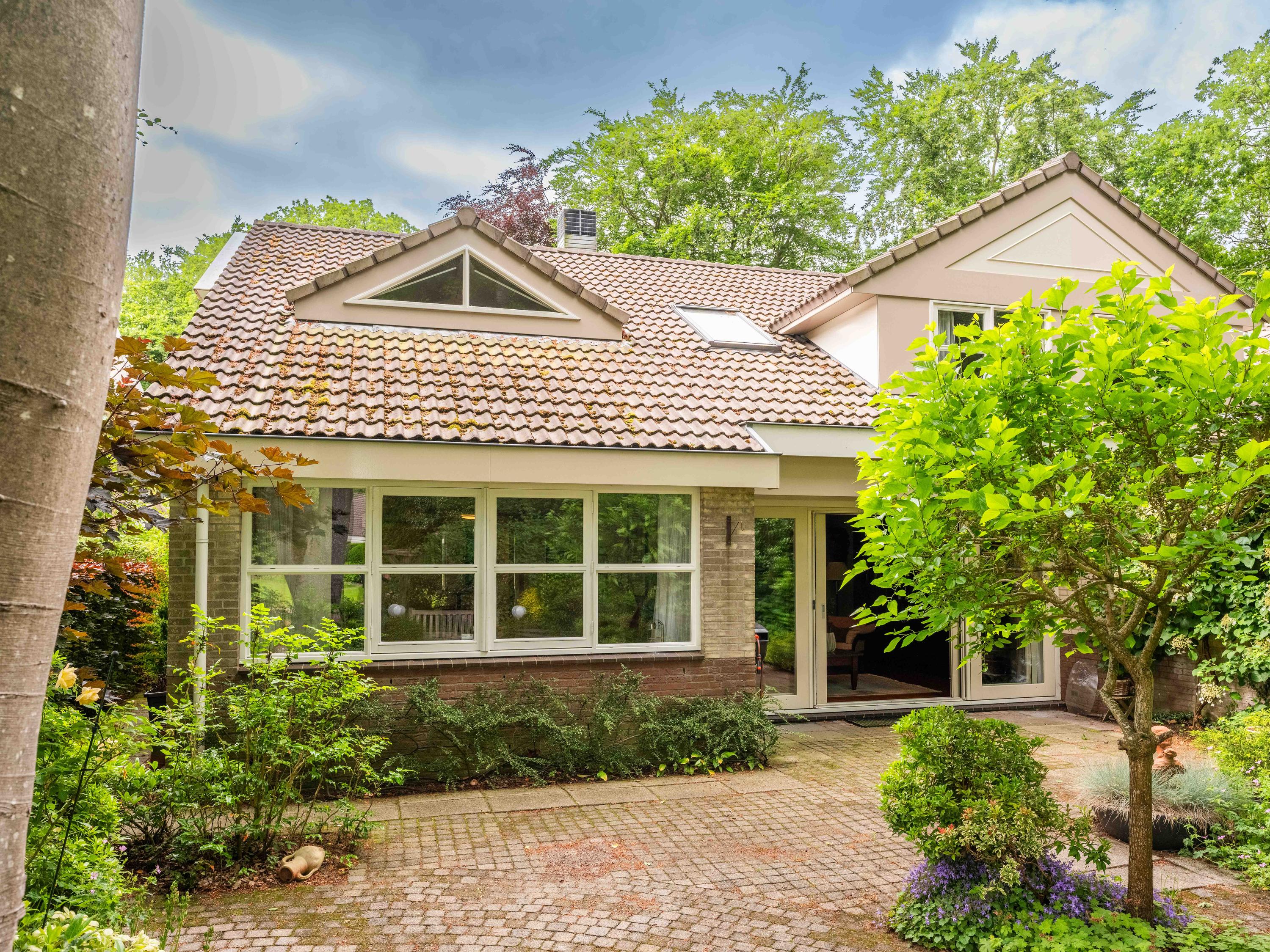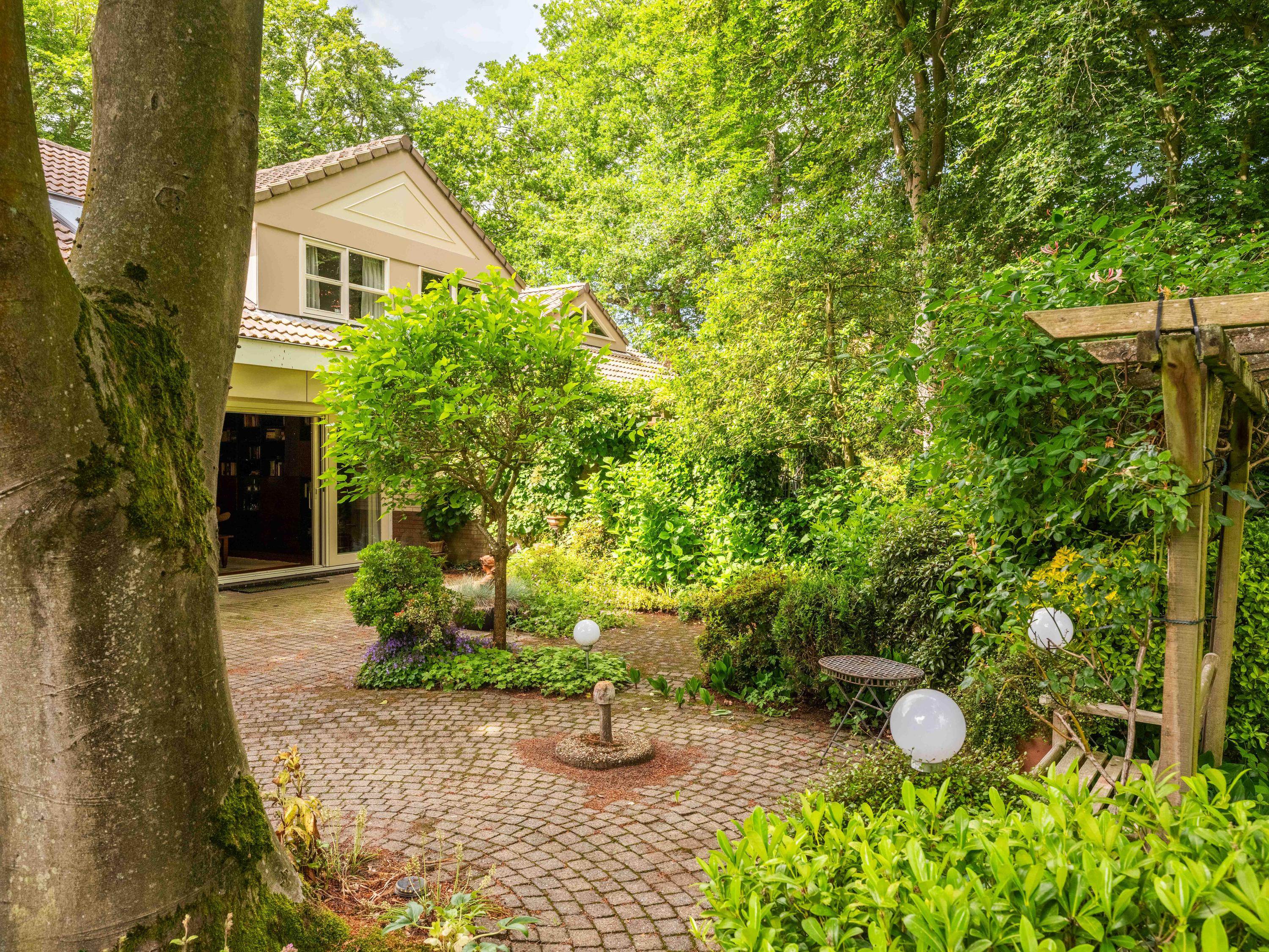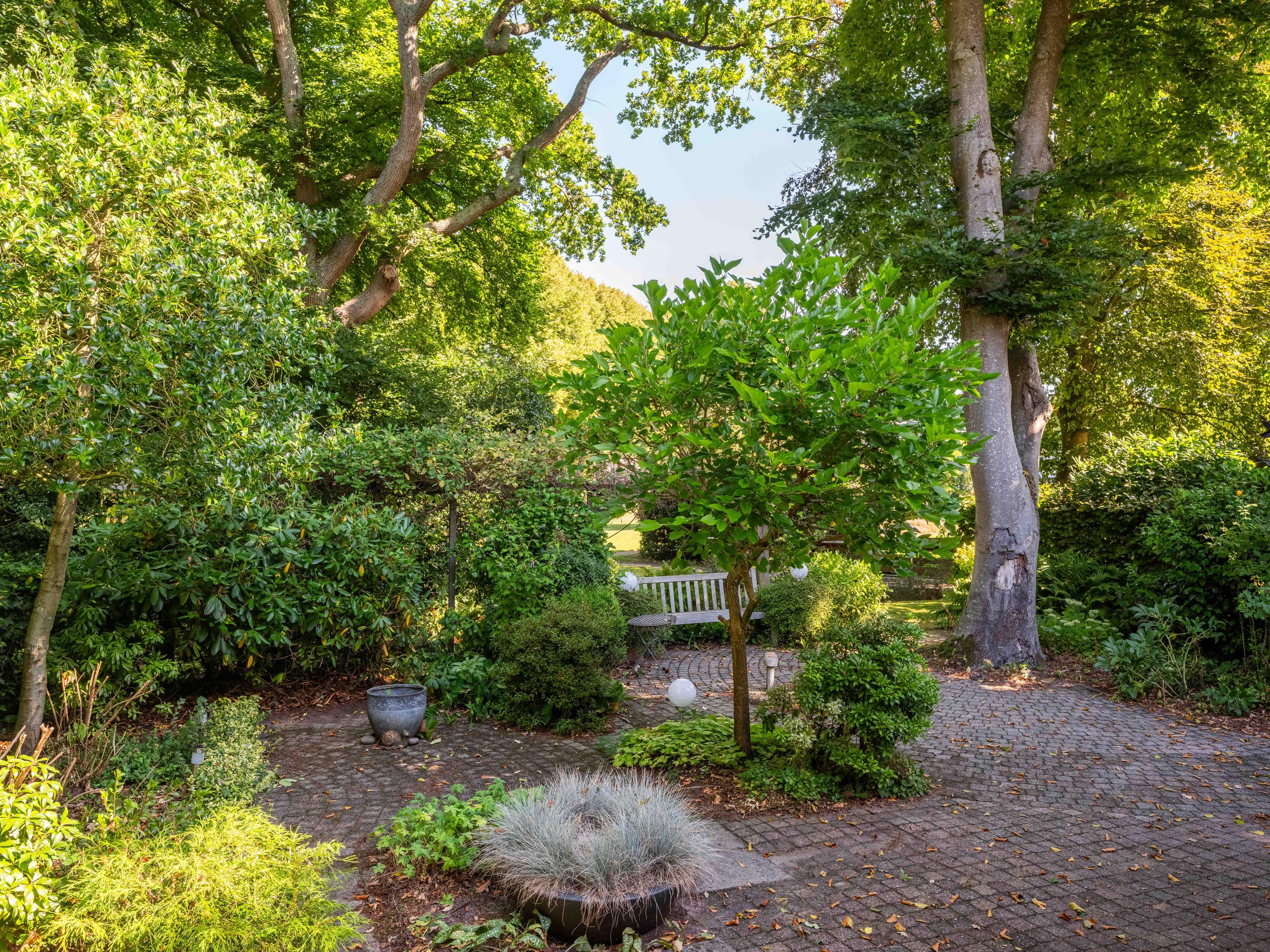 Via de grote schuifpui stapt u zo de zonnige, beschutte achtertuin in, een heerlijke plek om te genieten van rust en privacy, met een terras en uitzicht op de vijverpartij. De fraai aangelegde, zonnige tuin is een oase van rust en privacy. Het terras grenst aan het exclusieve, mandelige park met vijverpartijen – een unieke plek waar u volop kunt genieten van de natuur. Het park is uitsluitend toegankelijk voor omwonenden.