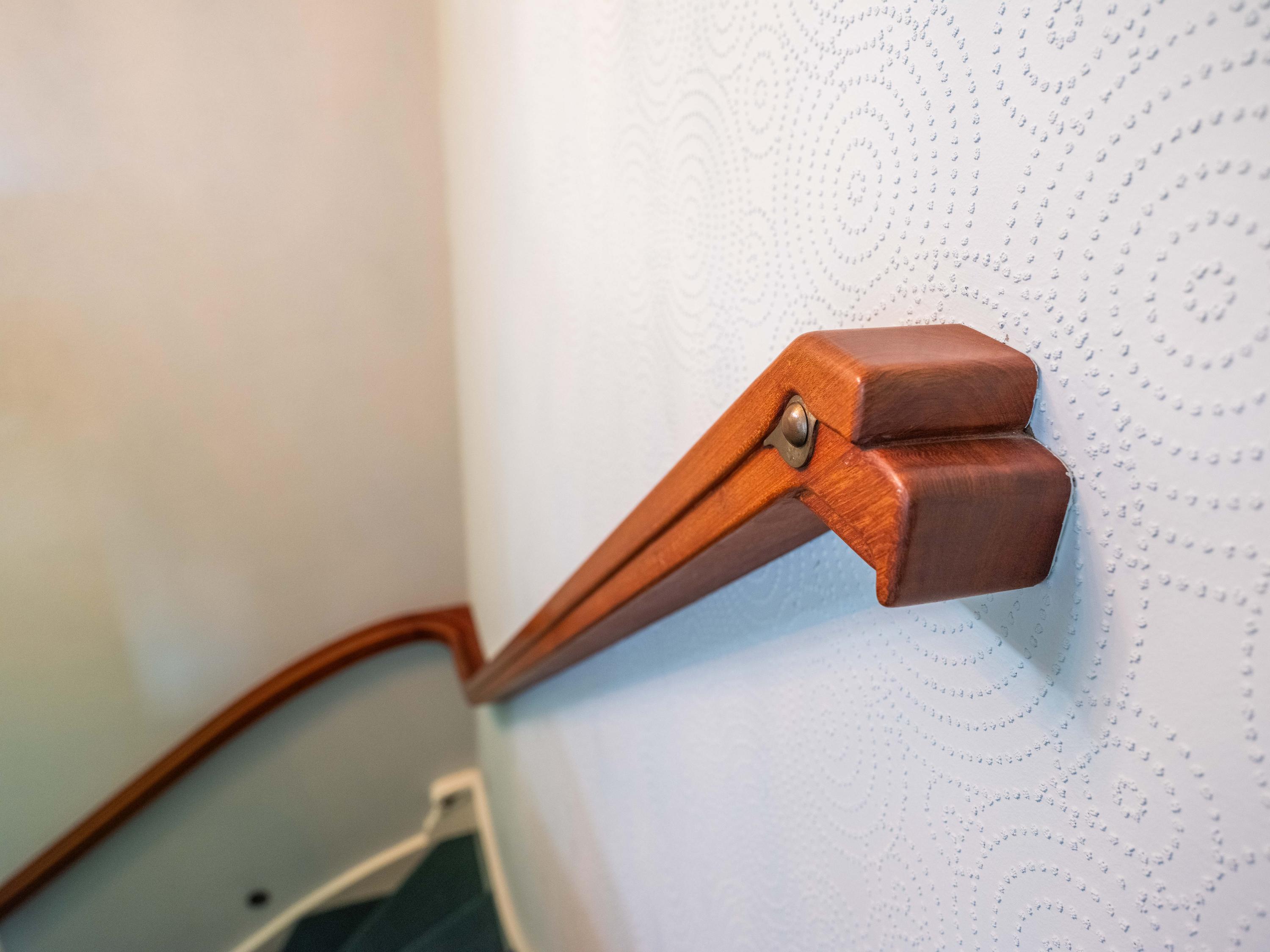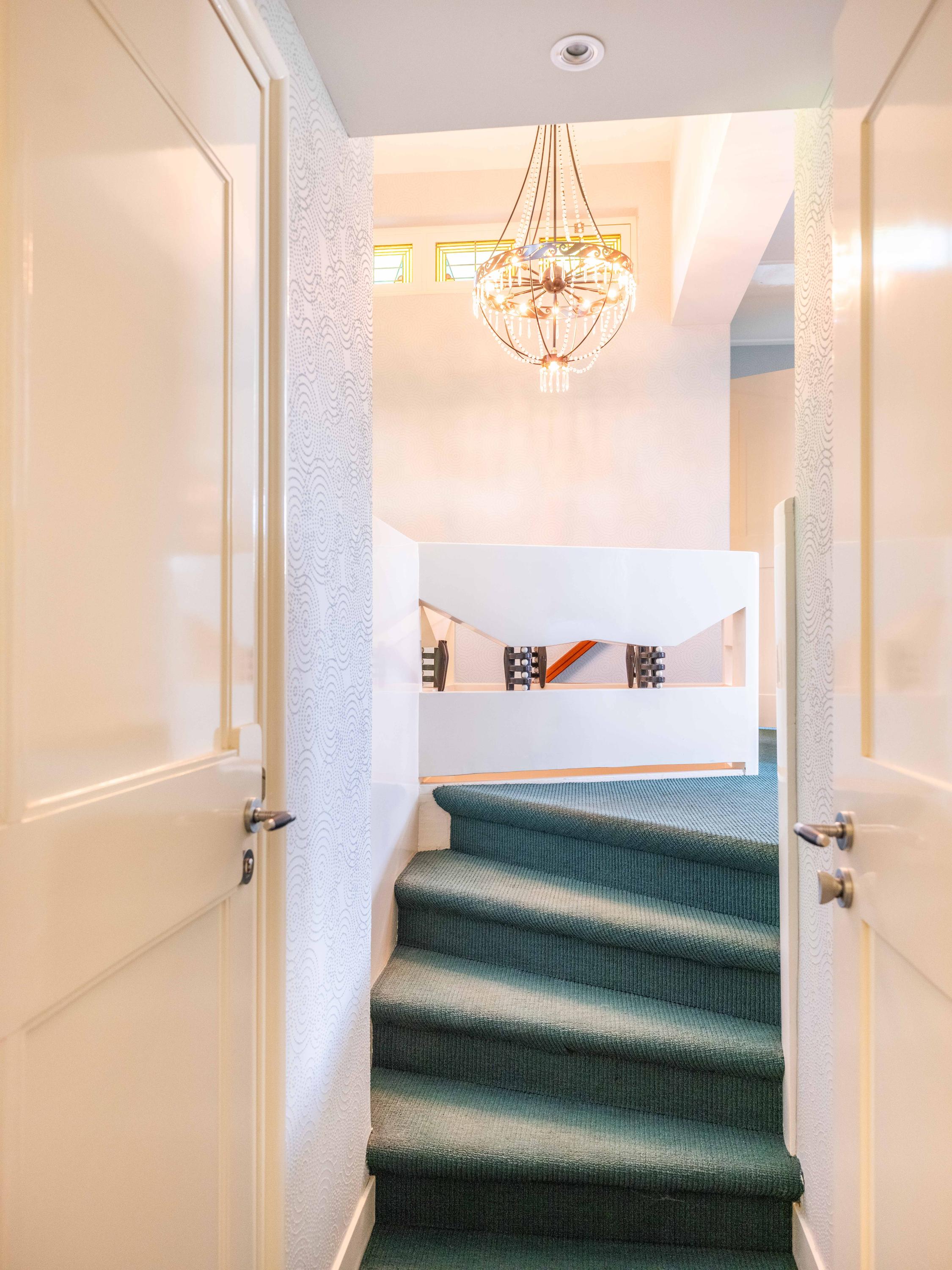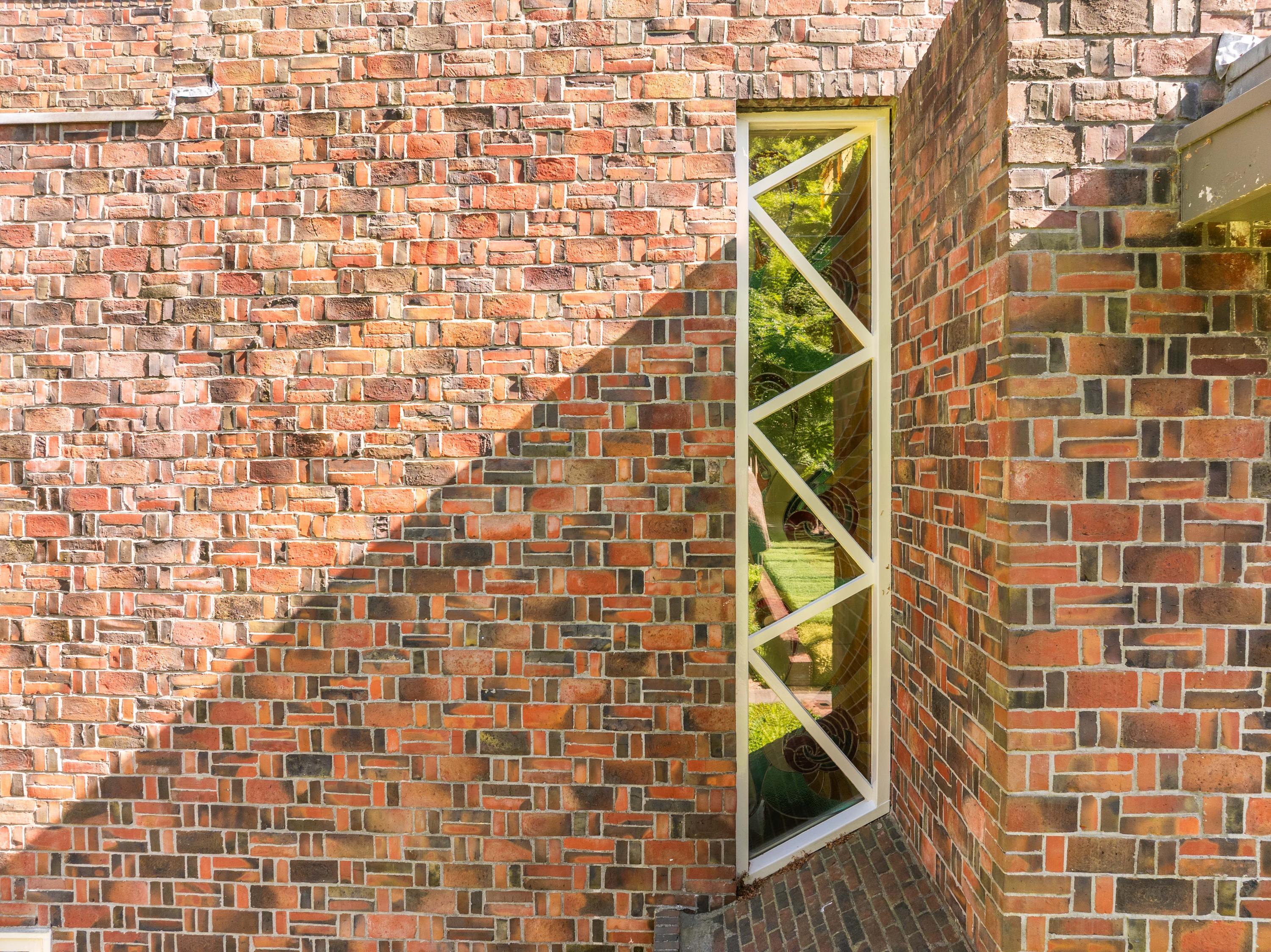 Een kronkelig paadje tussen mooi gevormde ligusterhagen loopt naar de verscholen voordeur. Via de entree lopen we de hal binnen met een garderobe, de trap naar de verdieping en een toilet.