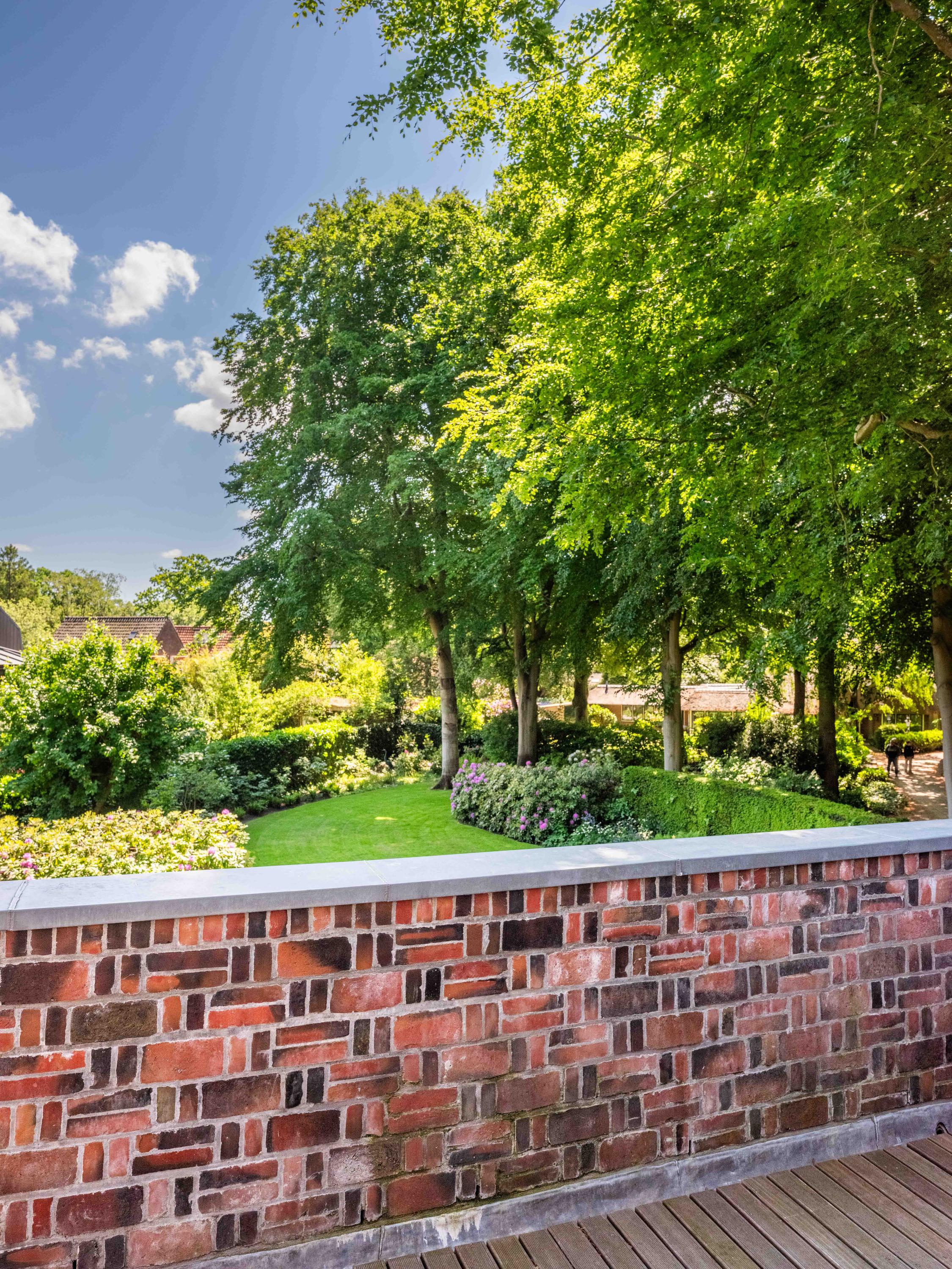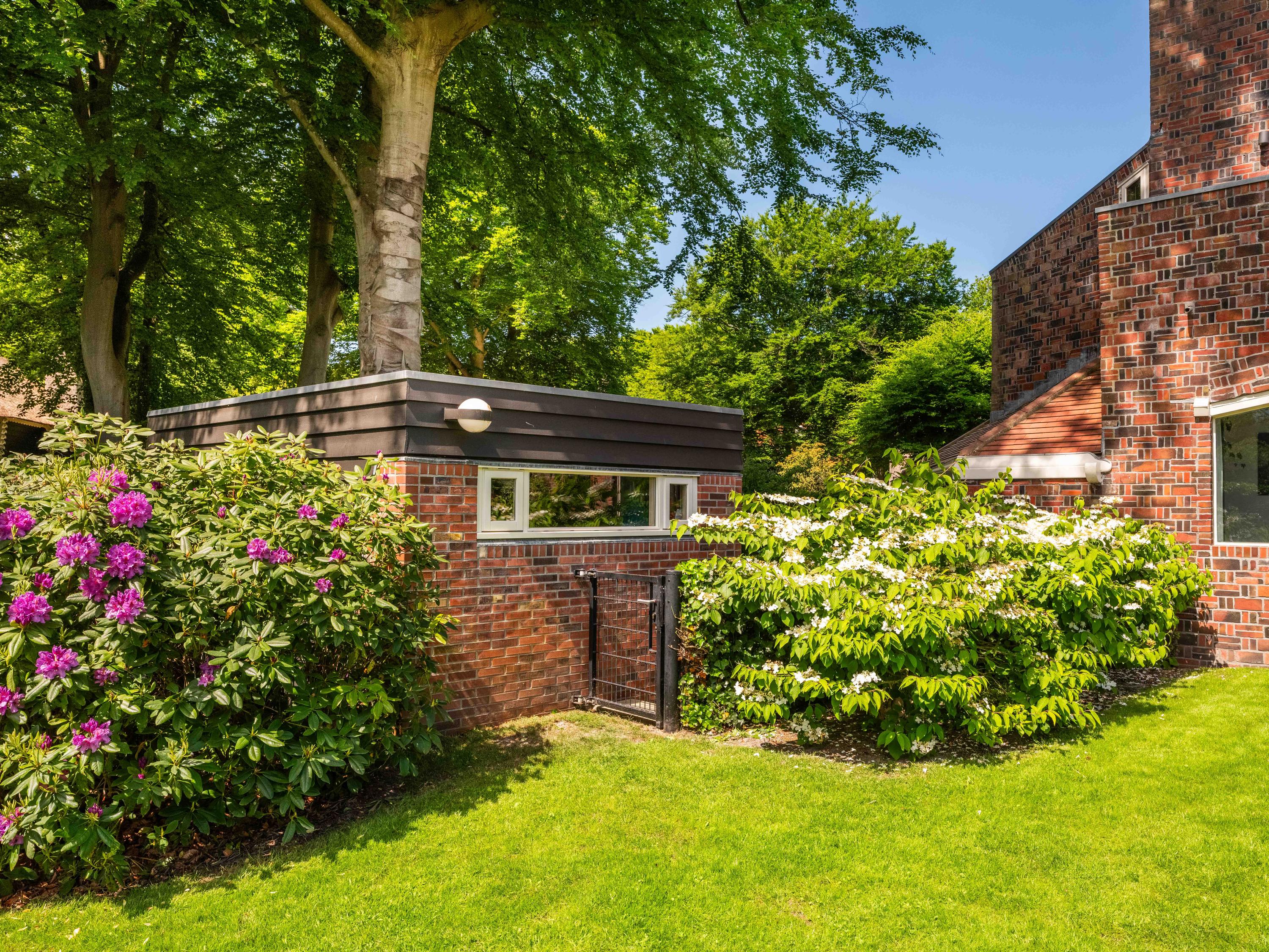 De prachtige parktuin met ligusterhagen, bloempartijen en imposante bomen is rondom de villa gelegen. Naast de villa staat een in dezelfde stijl gebouwde en volledig geïsoleerde schuur voor bijvoorbeeld de fiets, tuinspullen, etc. Hier treft men ook de opvang voor het centrale stofzuigersysteem en de pomp en bewateringsinstallatie voor de tuin.