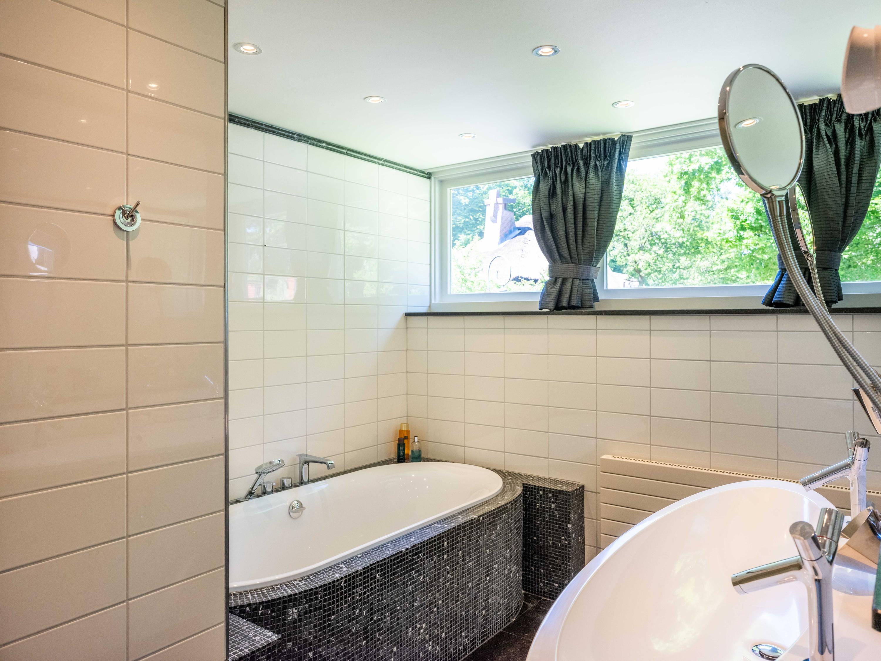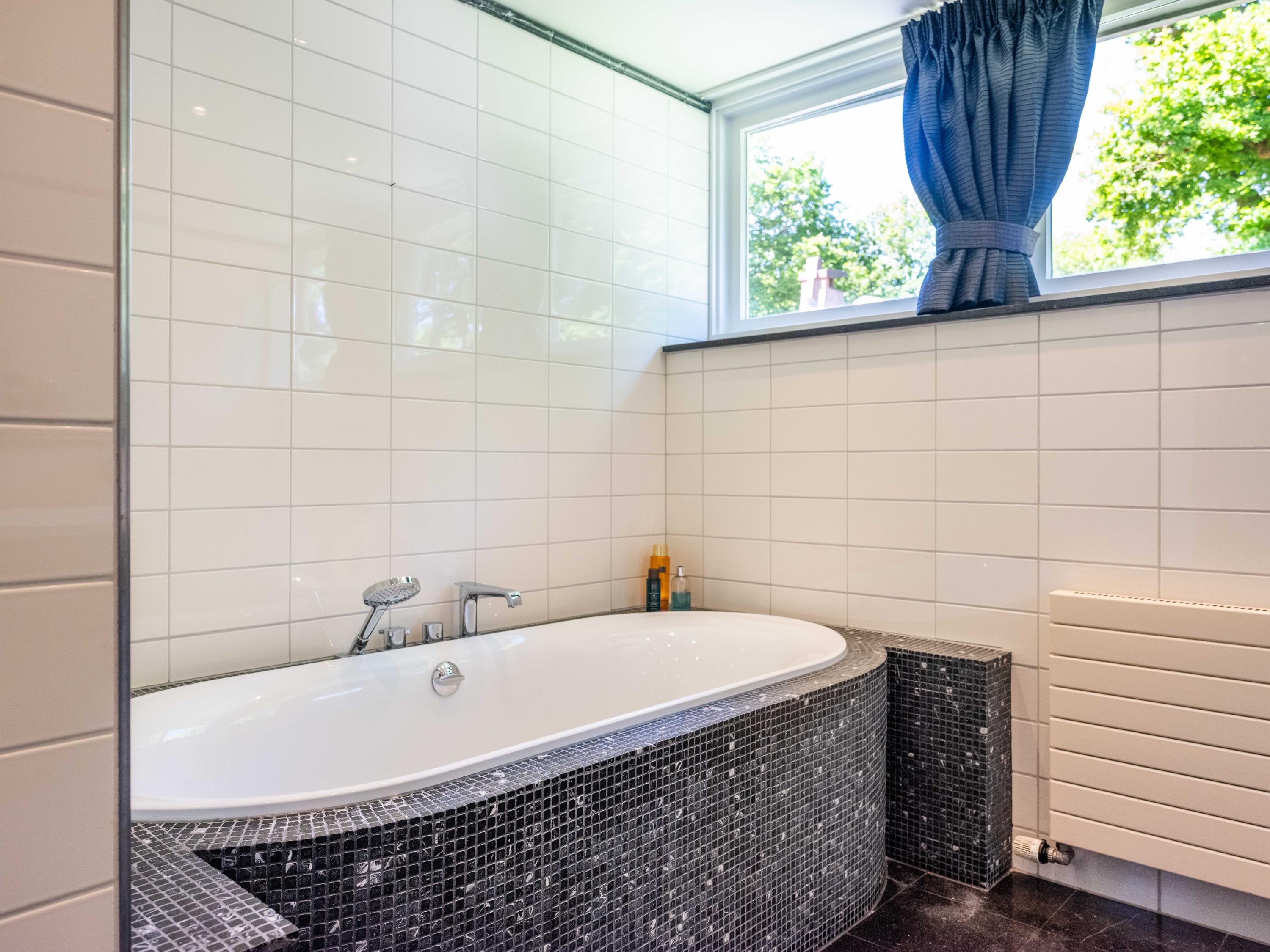 Via de trap met Amsterdamse School ornamenten en prachtig glas-in-lood raampartijen komen we op de 1e verdieping. Hier zijn 3 ruime slaapkamers gelegen waarvan de ouderslaapkamer met gashaard, inloopkast en een balkon met uitzicht op de groene tuin en de prachtige bomen. Ook op de overloop gelegen, enkele treden lager, een separaat toilet en een ruime badkamer met ligbad, douche, brede wastafel en een ruimte voor de wasmachine en droger.