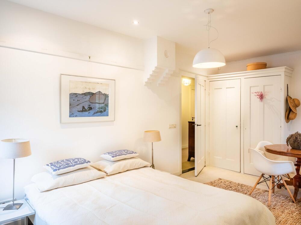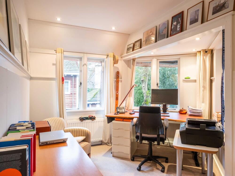 Op de 1e verdieping vindt u vier ruime slaapkamers, waarvan twee toegang hebben tot een zonnig balkon aan de voorzijde. Aan de achterzijde is een sfeervol kantoor ook voorzien van een karakteristieke schouw. De kamer geeft toegang tot het balkon aan de achterzijde van de villa. De vierde slaapkamer beschikt over een handige zijkamer en heeft tevens toegang tot het balkon aan de achterzijde. Vanaf de ruime overloop zijn de badkamer en het separate toilet met fonteintje te bereiken. De badkamer is licht en verzorgd, met een ligbad, inloopdouche en wastafel met meubel. De badkamer en het toilet zijn ook voorzien van vloerverwarming.