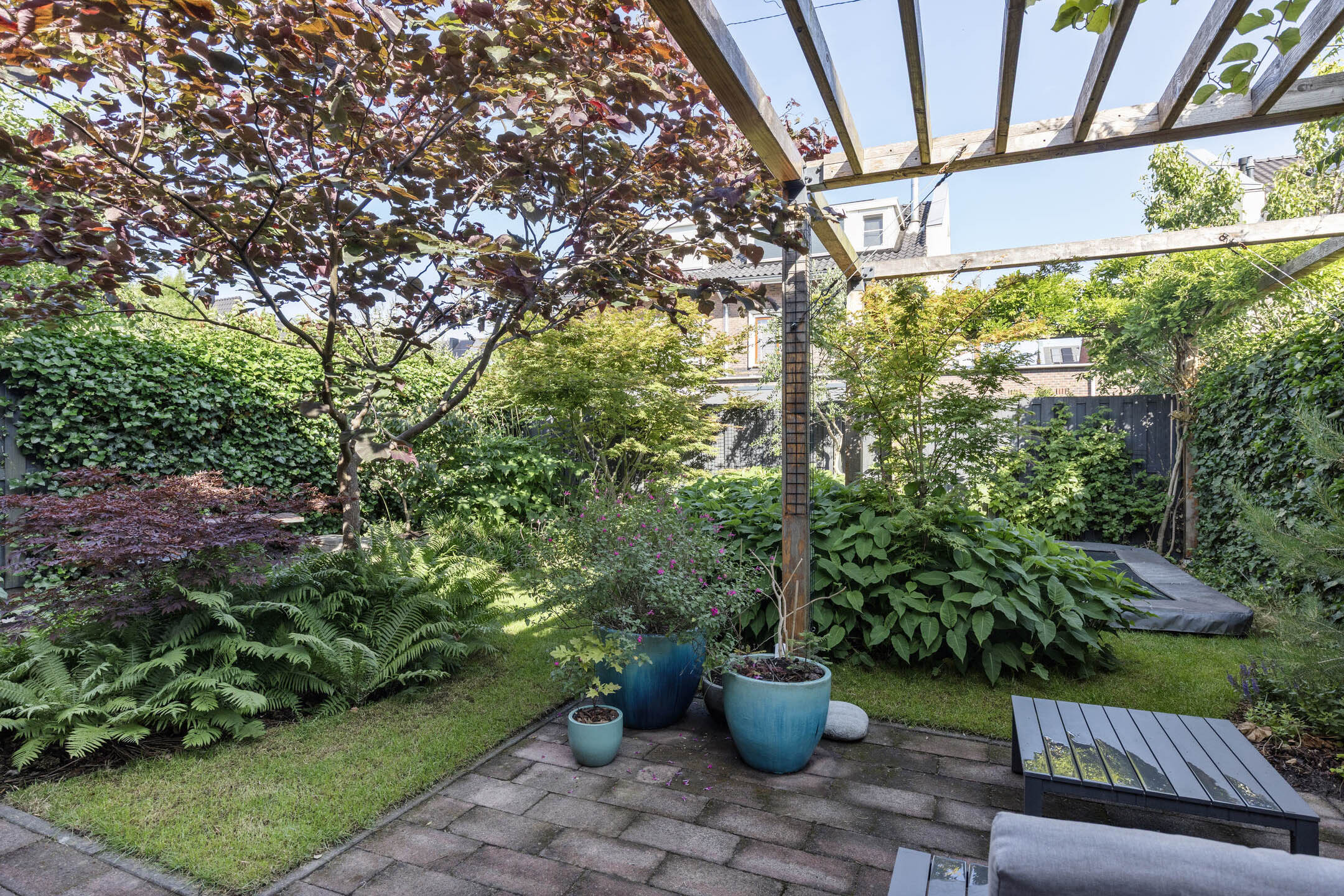 De fraai aangelegde achtertuin is gelegen op het noordwesten, ideaal voor middag- en avondzon.