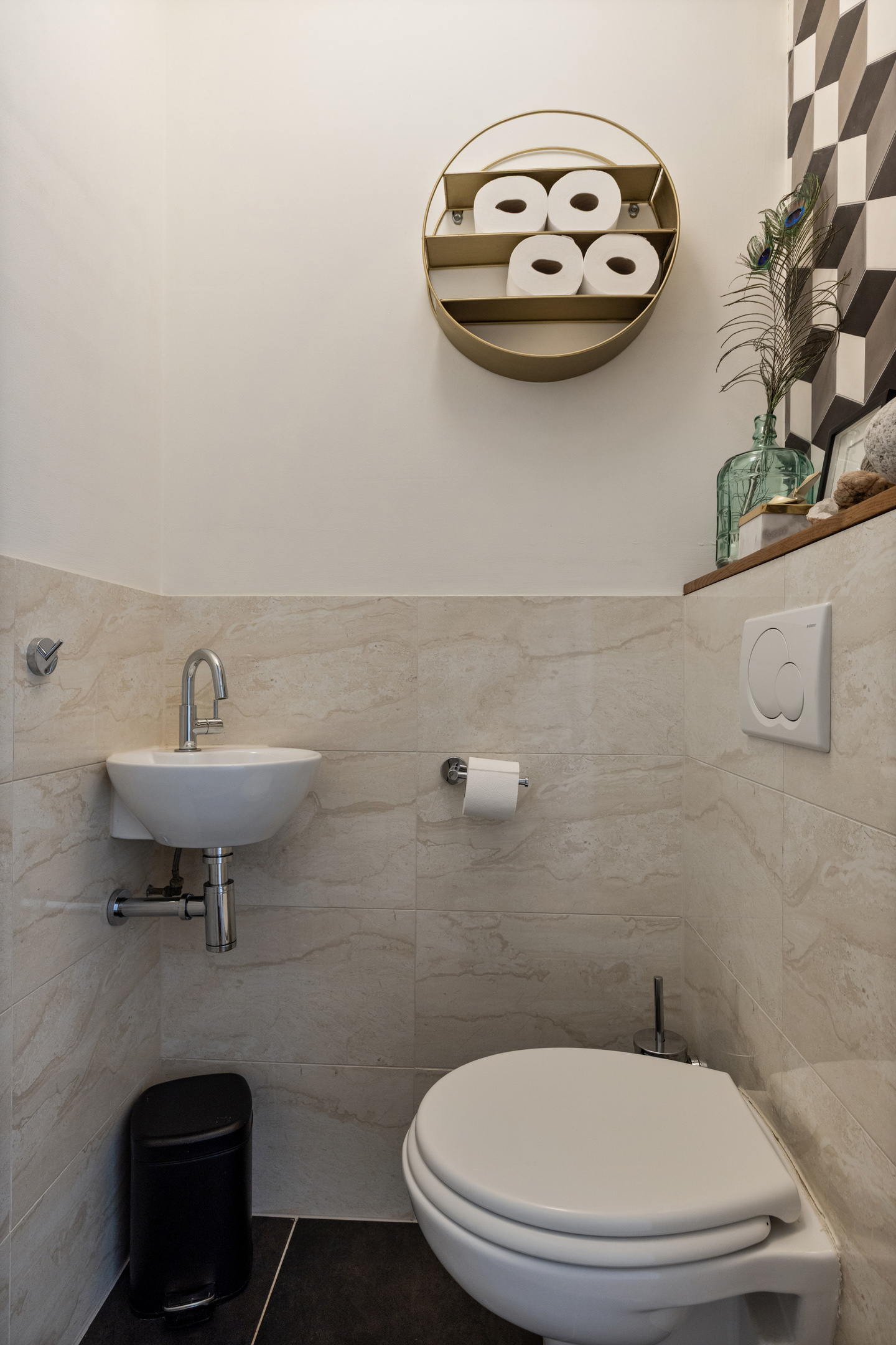 Op de overloop bevinden zich de aansluitingen voor de wasmachine en droger.