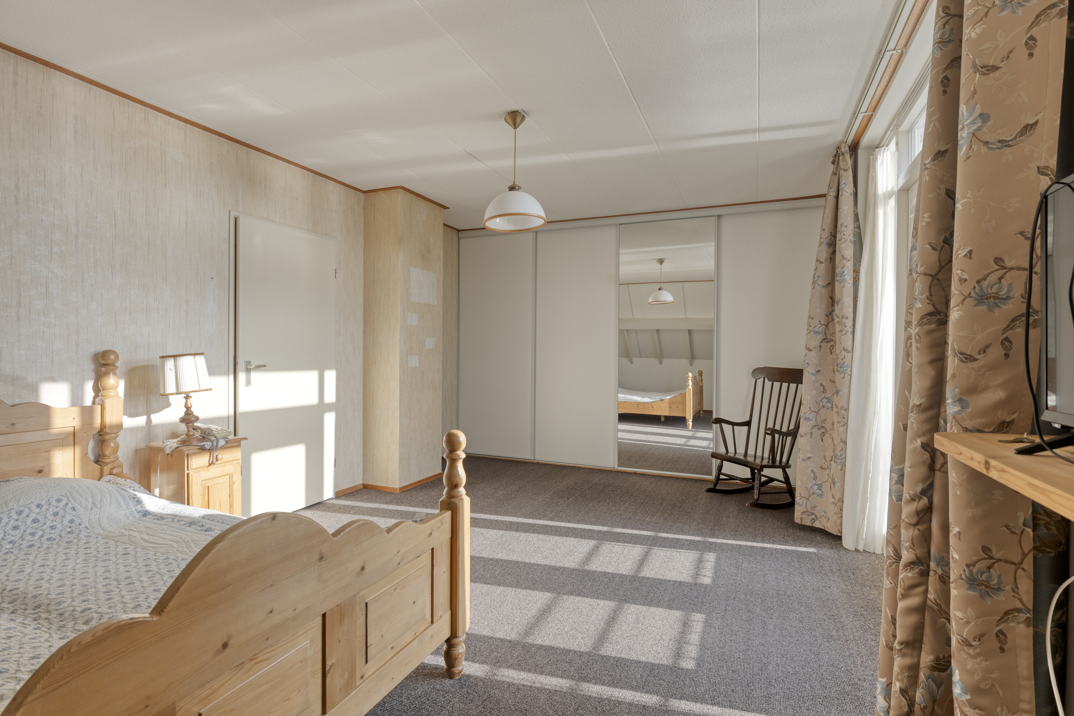 Slaapkamer 2, ruime kamer aan de achterzijde, waar eenvoudig twee volwaardige slaapkamers van te maken zijn. Vanuit deze kamer is de vliering bereikbaar, waar zich de opstelplaats van de cv-ketel bevindt.