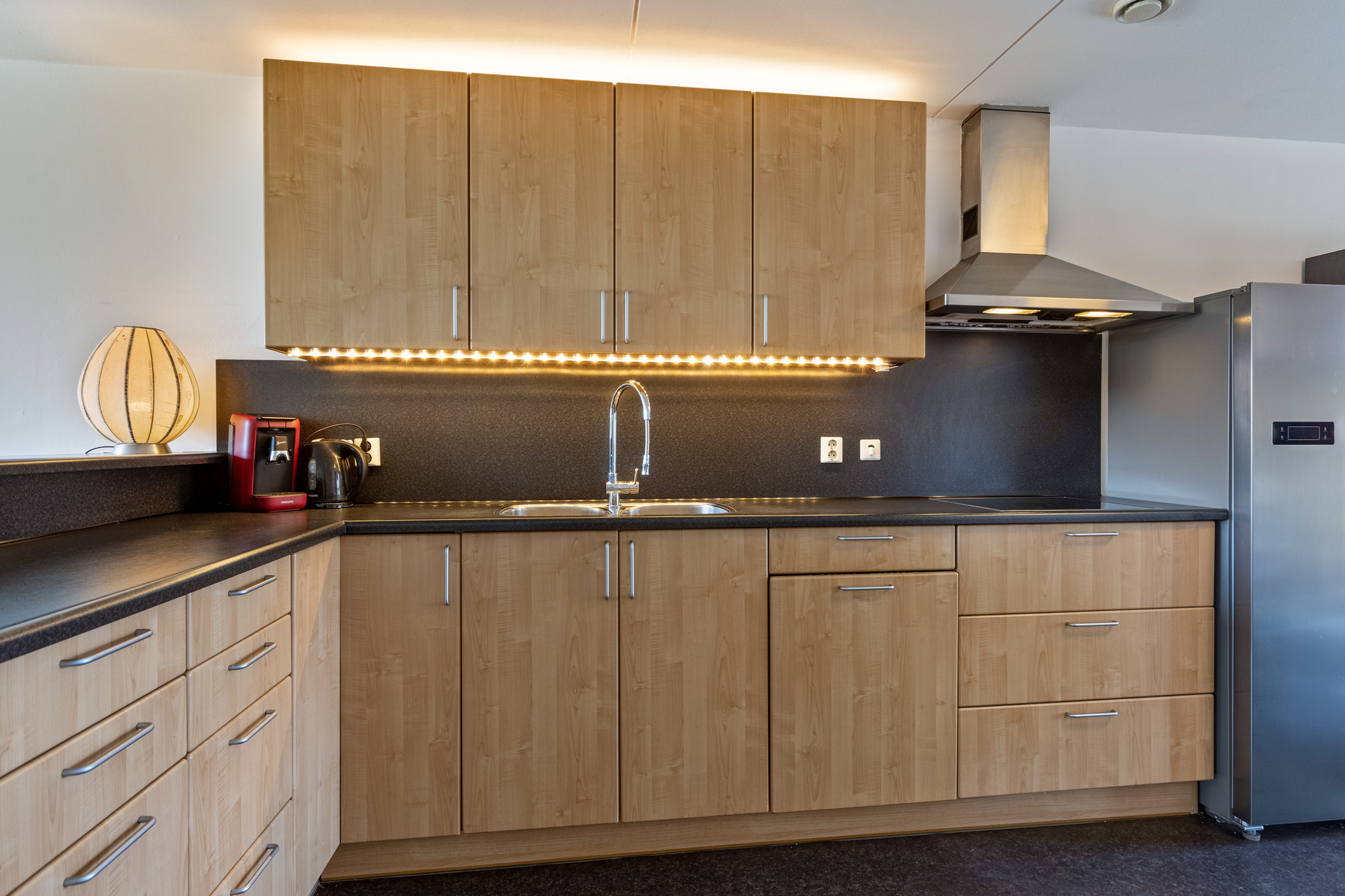 Aan de voorkant bevindt zich de open keuken met veel opbergruimte en is van alle gemakken voorzien, zoals een spoelbak met mengkraan, keramische kookplaat, afzuigkap, koelkast, vriezer en vaatwasser.