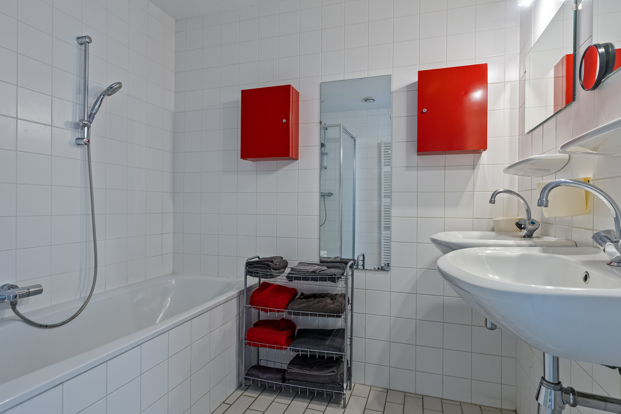 De badkamer is voorzien van een douche, ligbad, twee wastafels en een handdoekradiator.