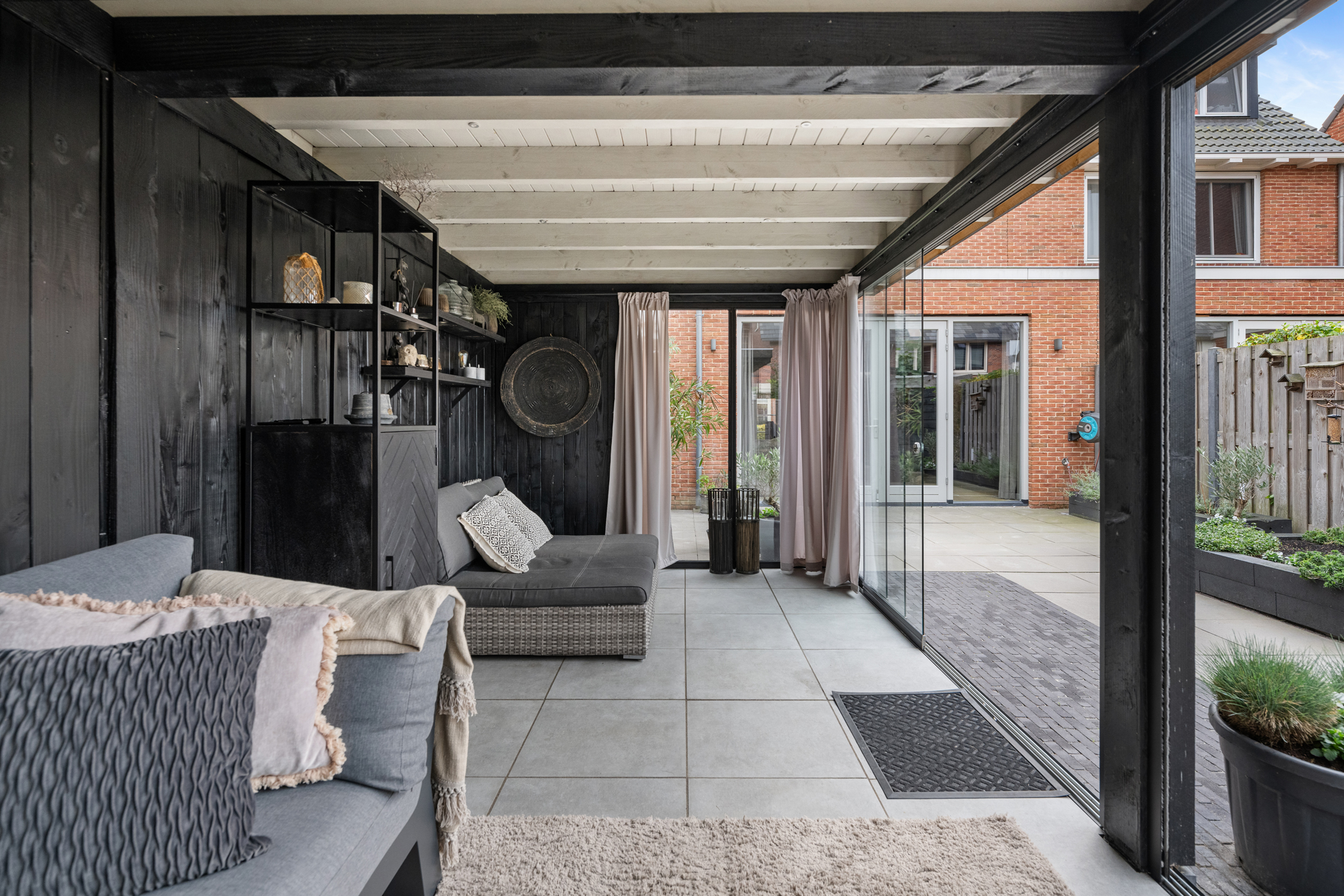 In deze zonnige tuin bevindt zich een sfeervolle overkapping met glazen pui, voorzien van stroom en internet. De ruimte is volledig geïsoleerd en uitgerust met plintverwarming, waardoor deze het hele jaar door comfortabel te gebruiken is. Bovendien zijn er vier zonnepanelen aanwezig, wat bijdraagt aan een energiezuinige en duurzame inrichting.