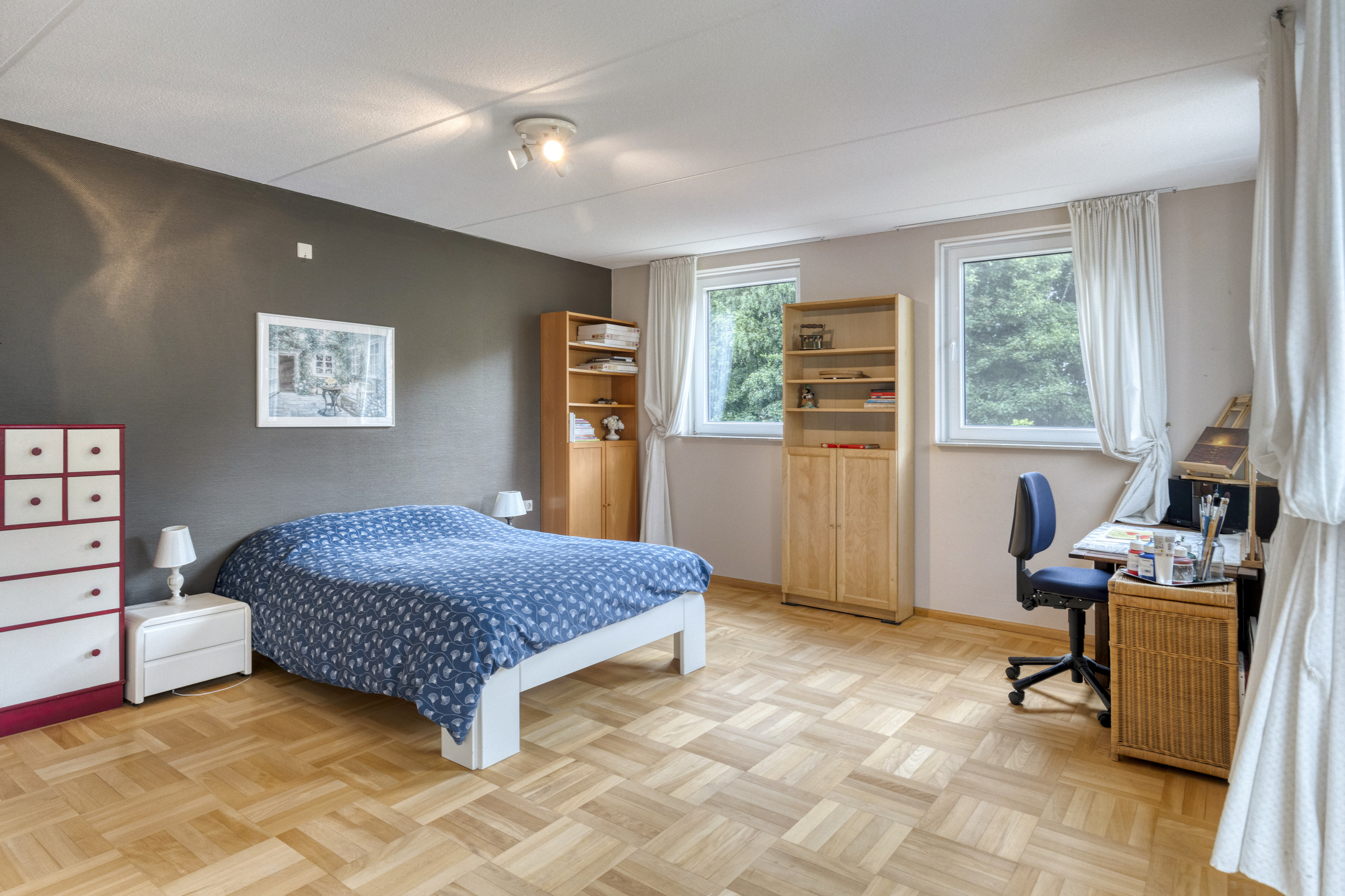 Aan de achterzijde van het huis, met uitzicht op de tuin, de studeerkamer. Dit zou uiteraard ook de gastenkamer of gameroom kunnen zijn, met aansluitingen voor warm en koud water en afvoer.