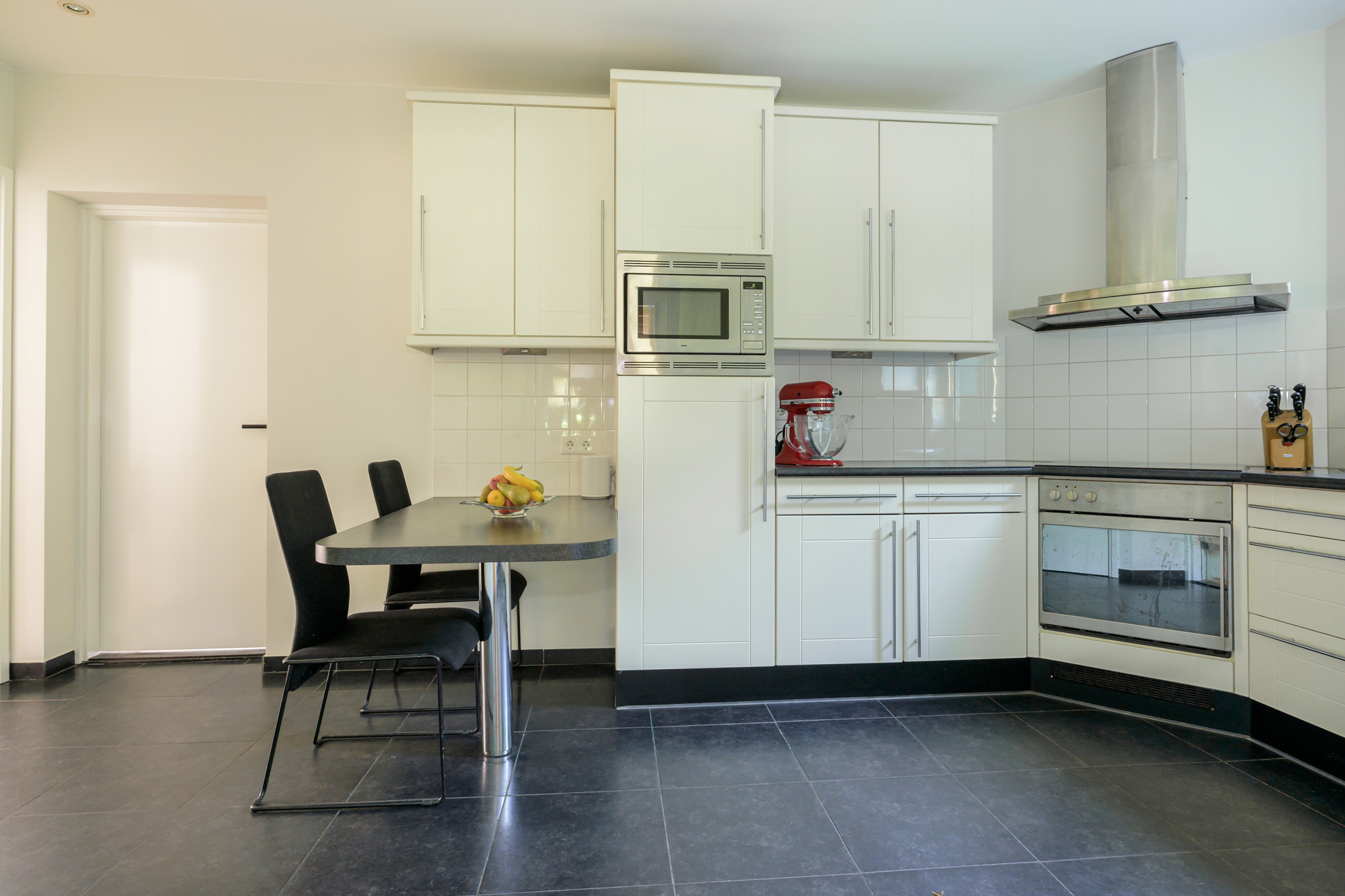 Deze ruimte is voorzien van een inrichting in U-opstelling met een groot werkblad met dubbele spoelbak, een koelkast, wandkasten, een apothekerskast en diverse laden. De apparatuur omvat verder onder andere een oven, inductiekookplaat, afzuigkap en vaatwasmachine.