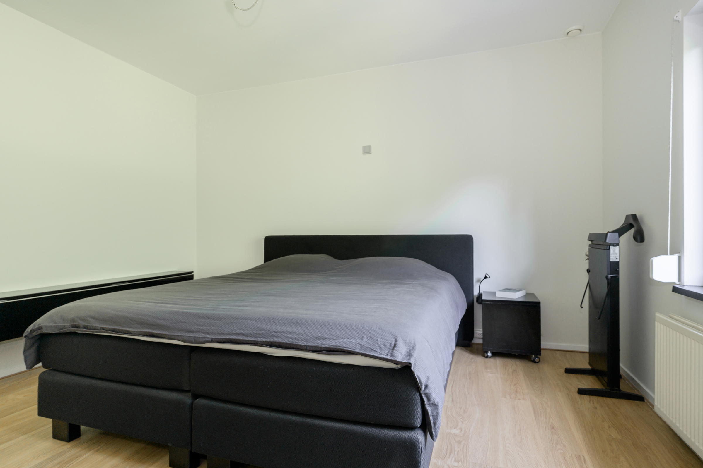 Slaapkamer met twee inbouwkasten en toegang tot aangrenzende badkamer. Deze slaapkamer is aan de zijkant van de woning gesitueerd.