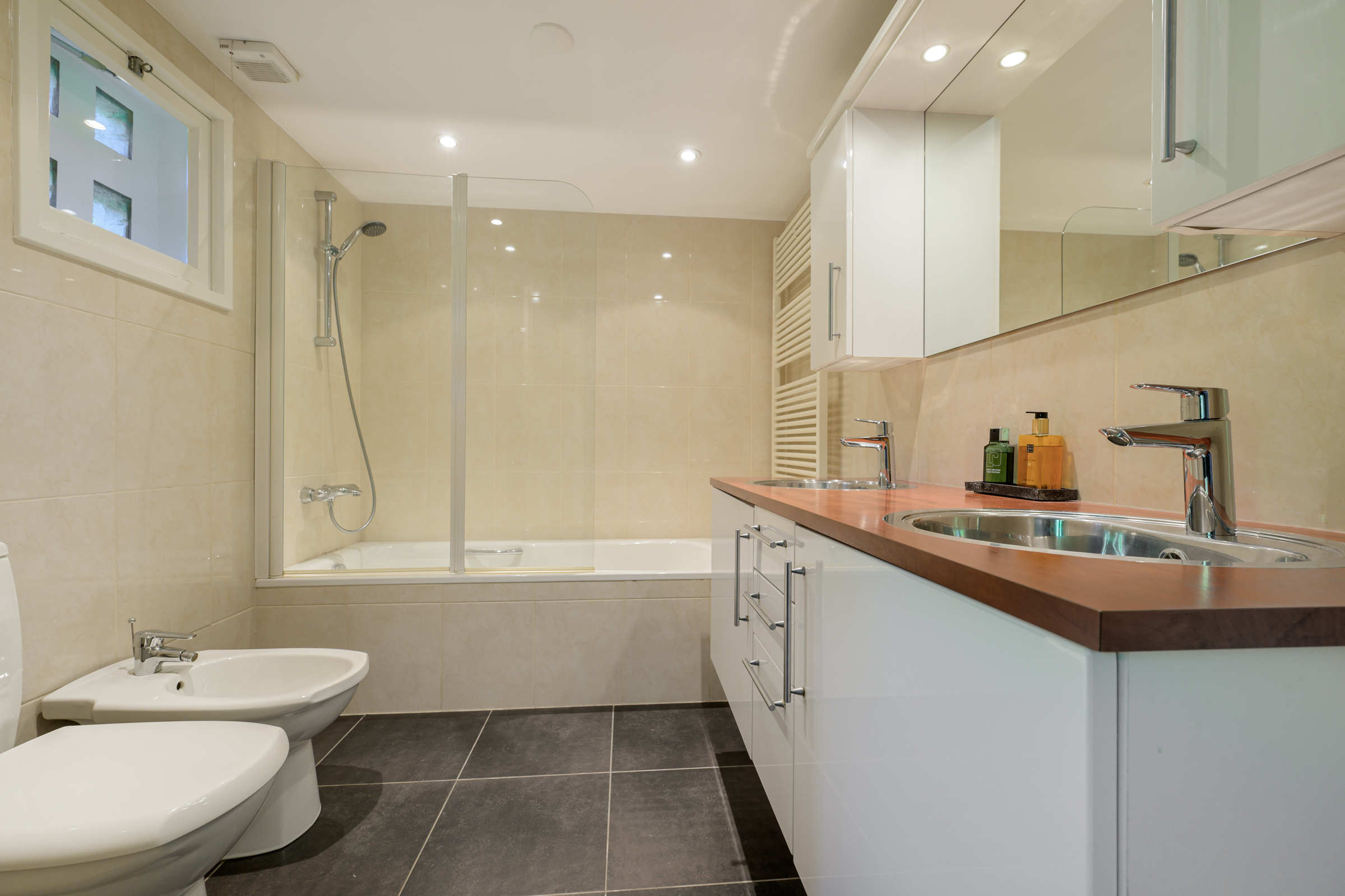 Badkamer met ligbad, toilet, bidet, wastafelmeubel met dubbele wastafel en een design radiator.