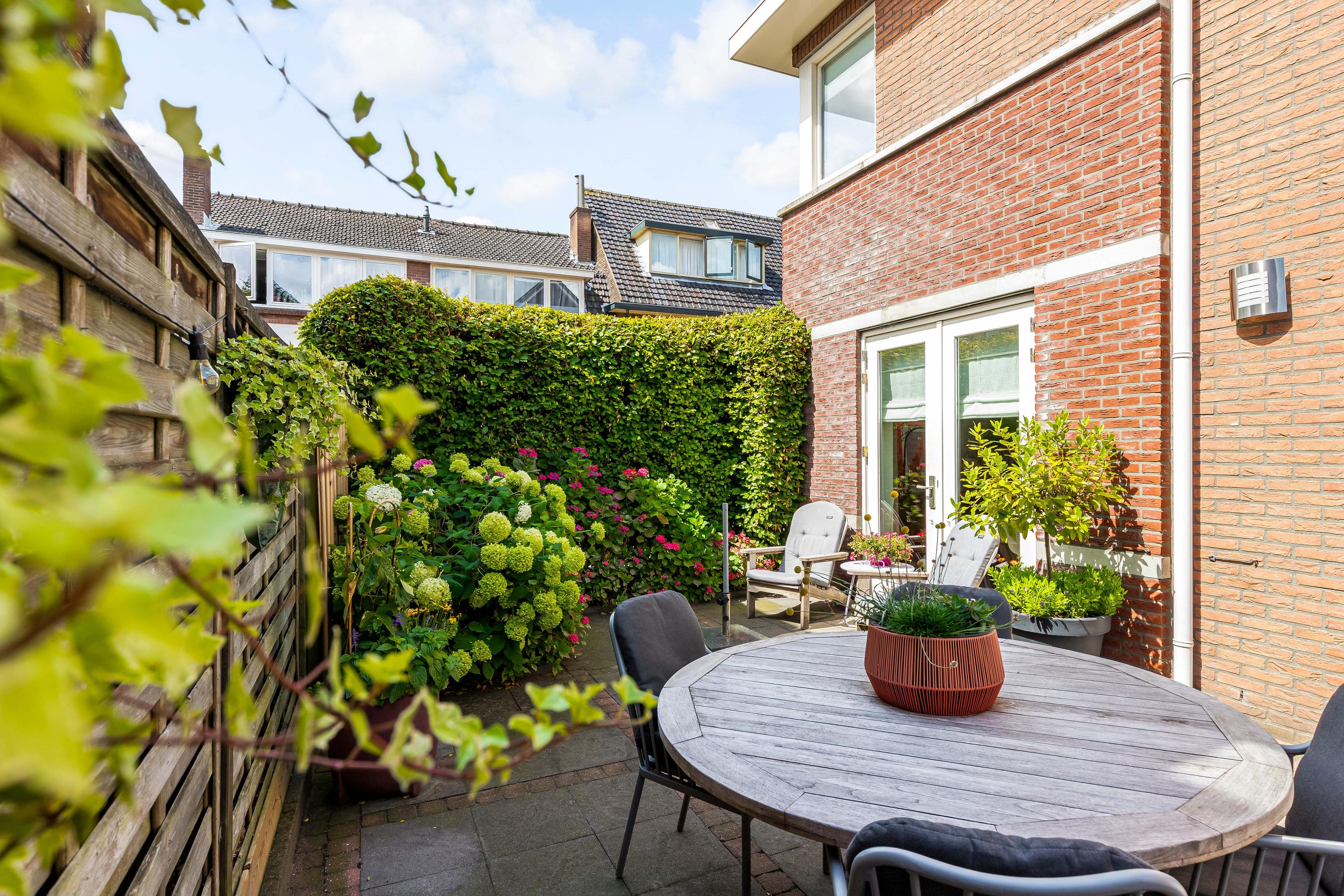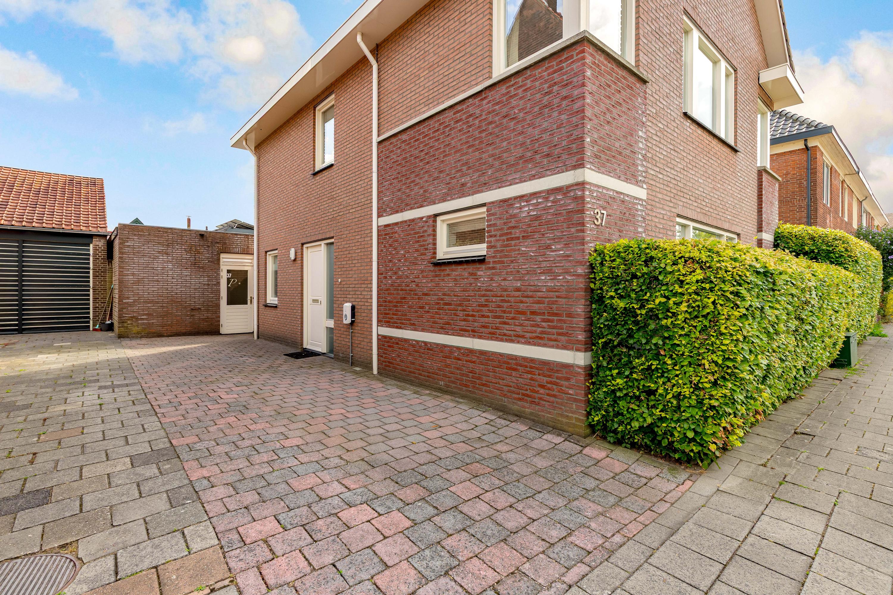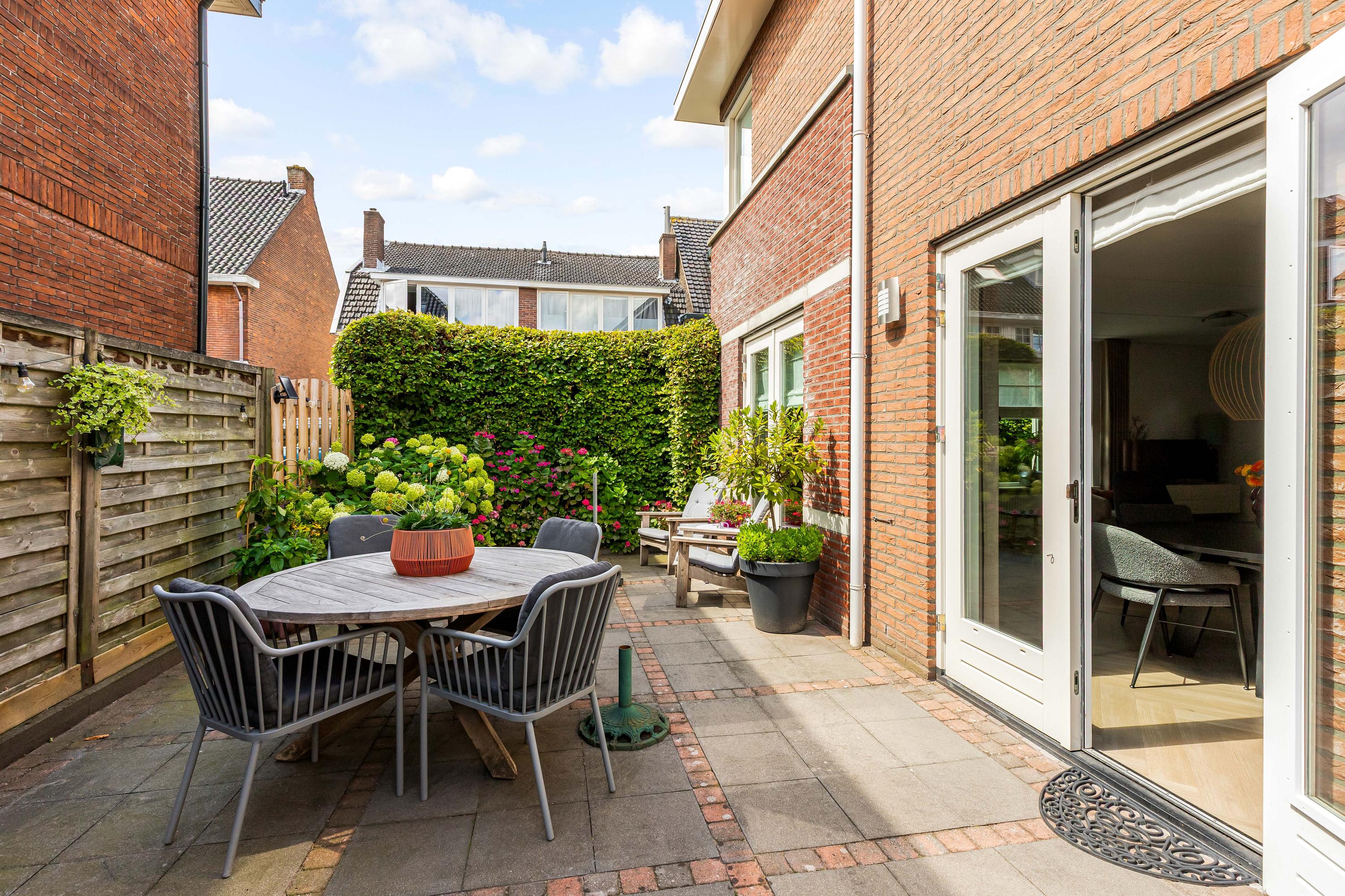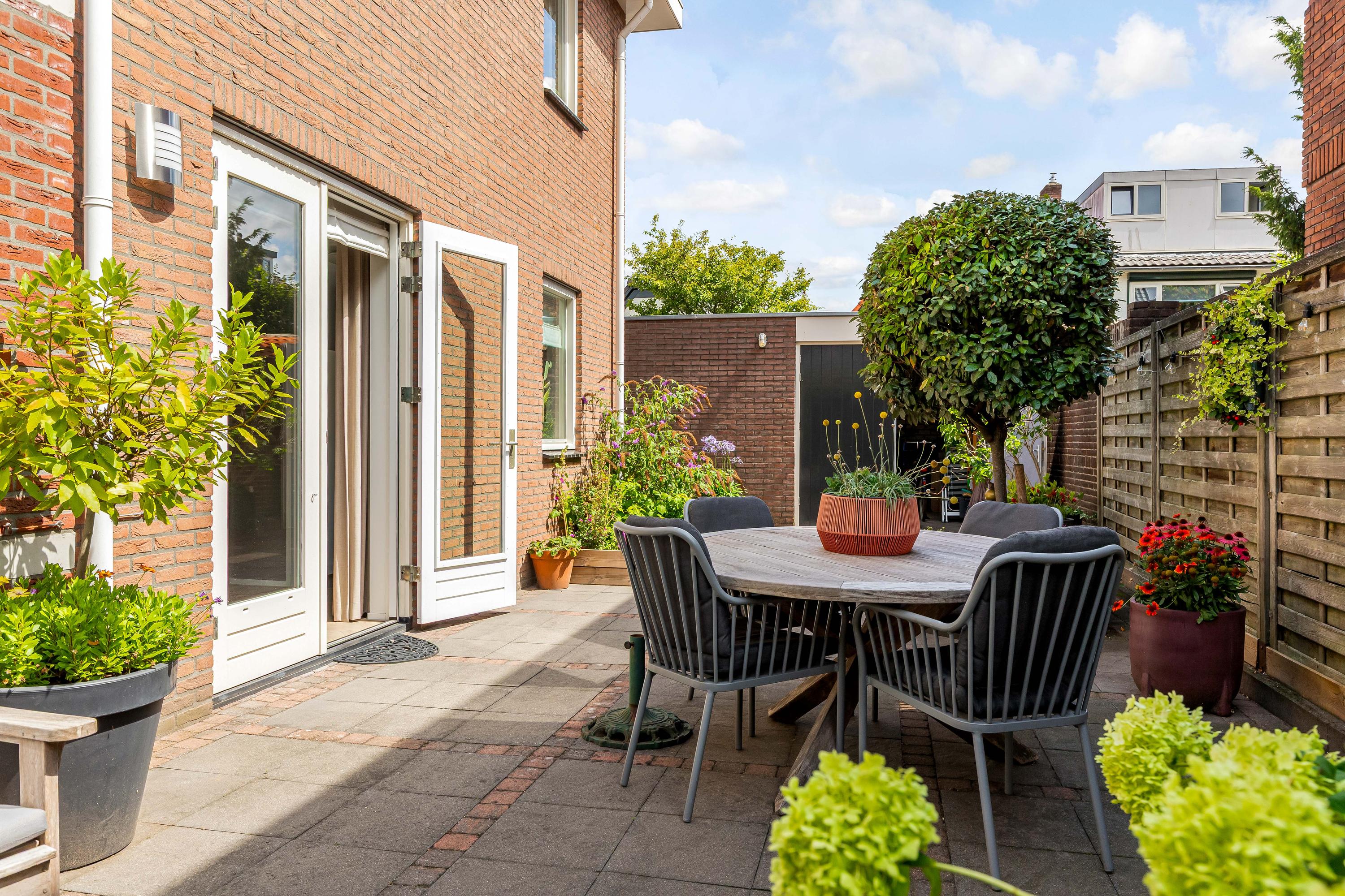 De zij- en achtertuin is gelegen op het zonnige zuidoosten, voorzien van een gevarieerde beplanting en sierbestrating. Het zonneterras biedt volop ruimte om te genieten van de zon, en er is directe toegang tot de garage en het bijgebouw. De tuin is zorgvuldig aangelegd, waardoor het zowel een rustige oase als een praktische buitenruimte is.