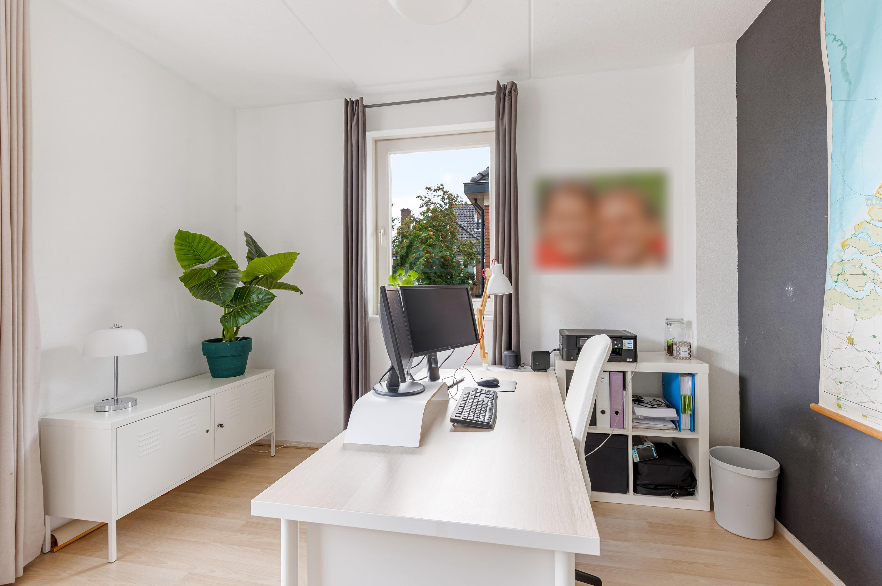 De halfopen keuken is afgewerkt in een lichte, moderne kleurstelling en voorzien van hoogwaardige inbouwapparatuur, volop werkruimte en praktische opbergkasten. Een vaste kastenwand scheidt de keuken stijlvol van de woonkamer. Aansluitend is de bijkeuken welke thans in gebruik is als kantoorruimte.