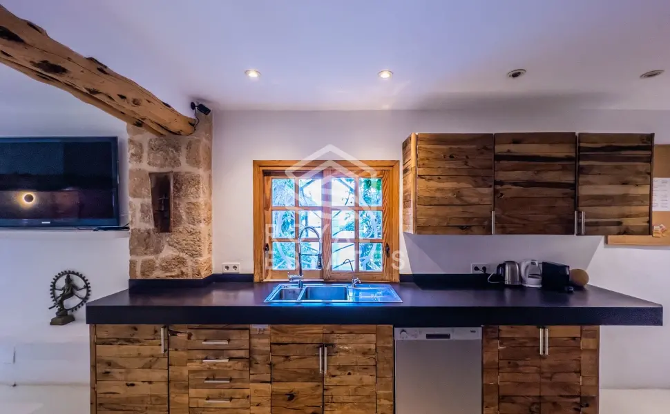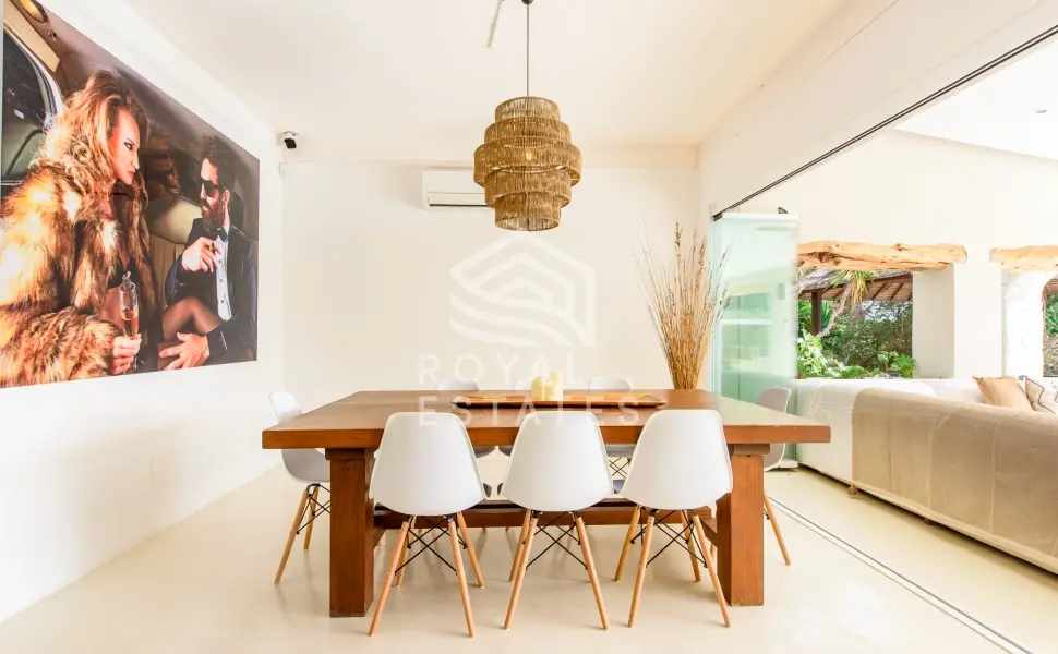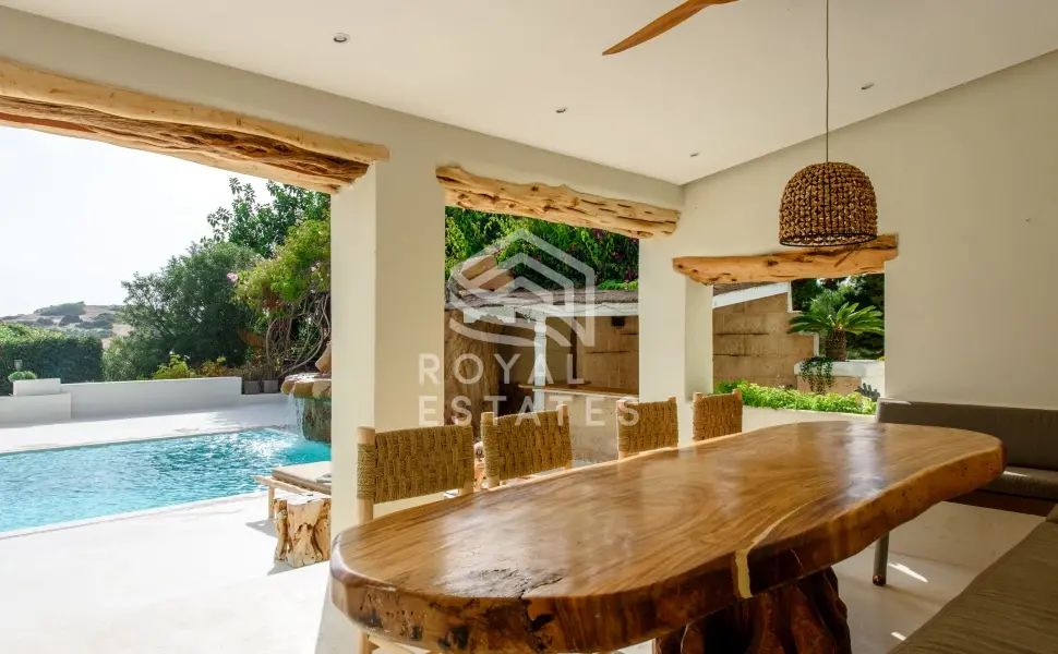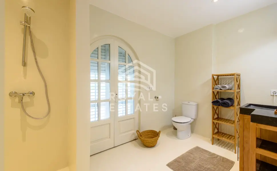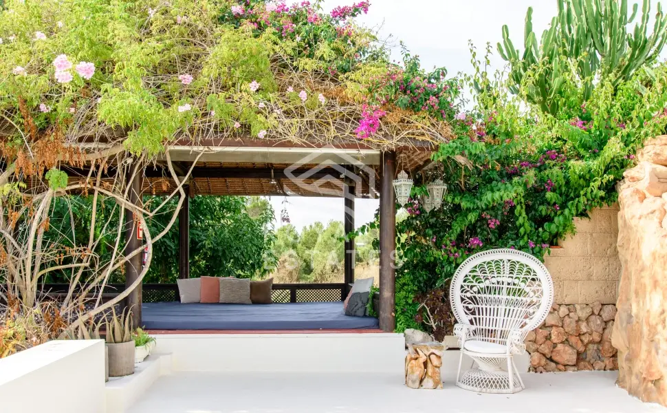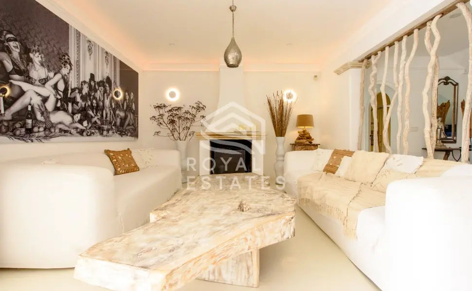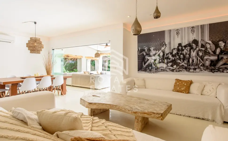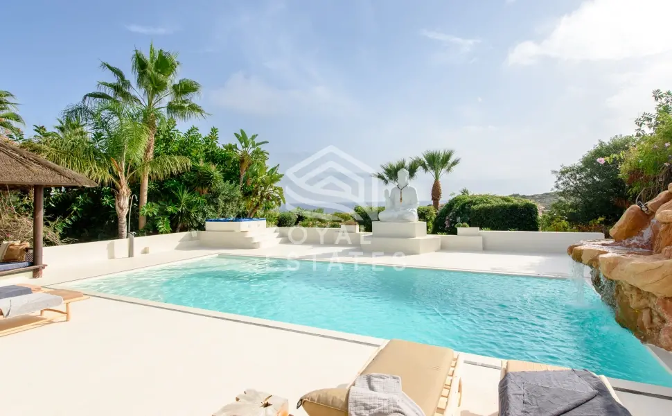 Vijftien slaapkamers zijn geschikt voor grote families of een privéverblijf, met vijf kamers in het hoofdhuis en diverse gastensuites verspreid over het terrein. De architectuur ademt de hedendaagse Ibiza-stijl: heldere volumes, natuursteen en een onafgebroken overgang tussen het interieur en de weelderige buitenruimte. Het hart van het huis opent zich naar een lichte woonkamer met open haard, direct verbonden met de terrassen, een infinity pool van 8 x 5 meter met waterval, een buitenbar, jacuzzi en sauna.